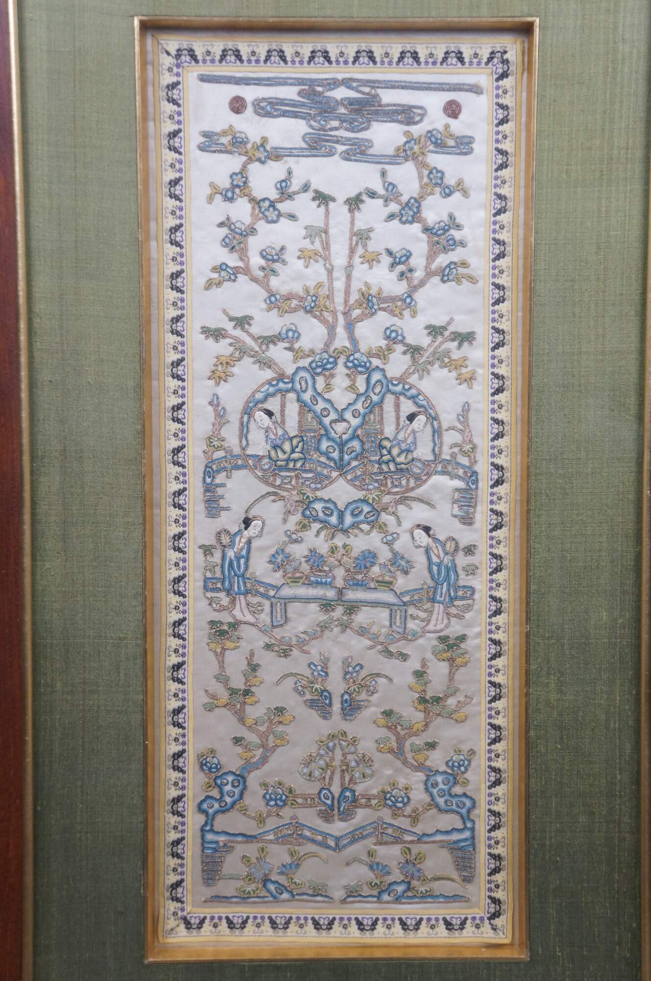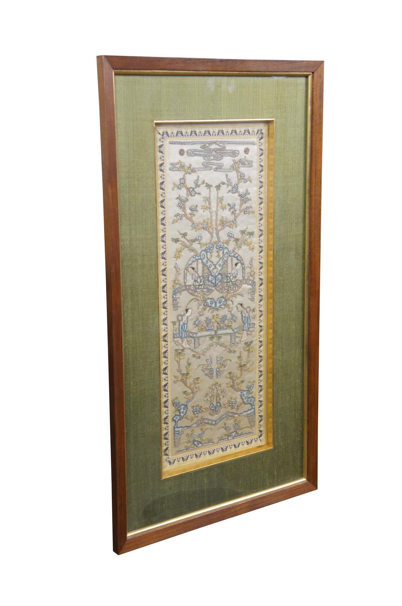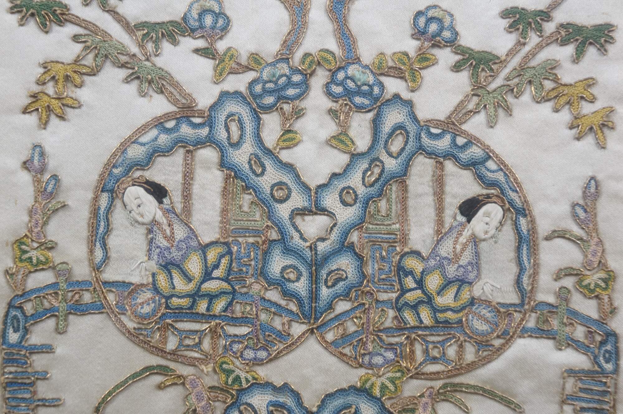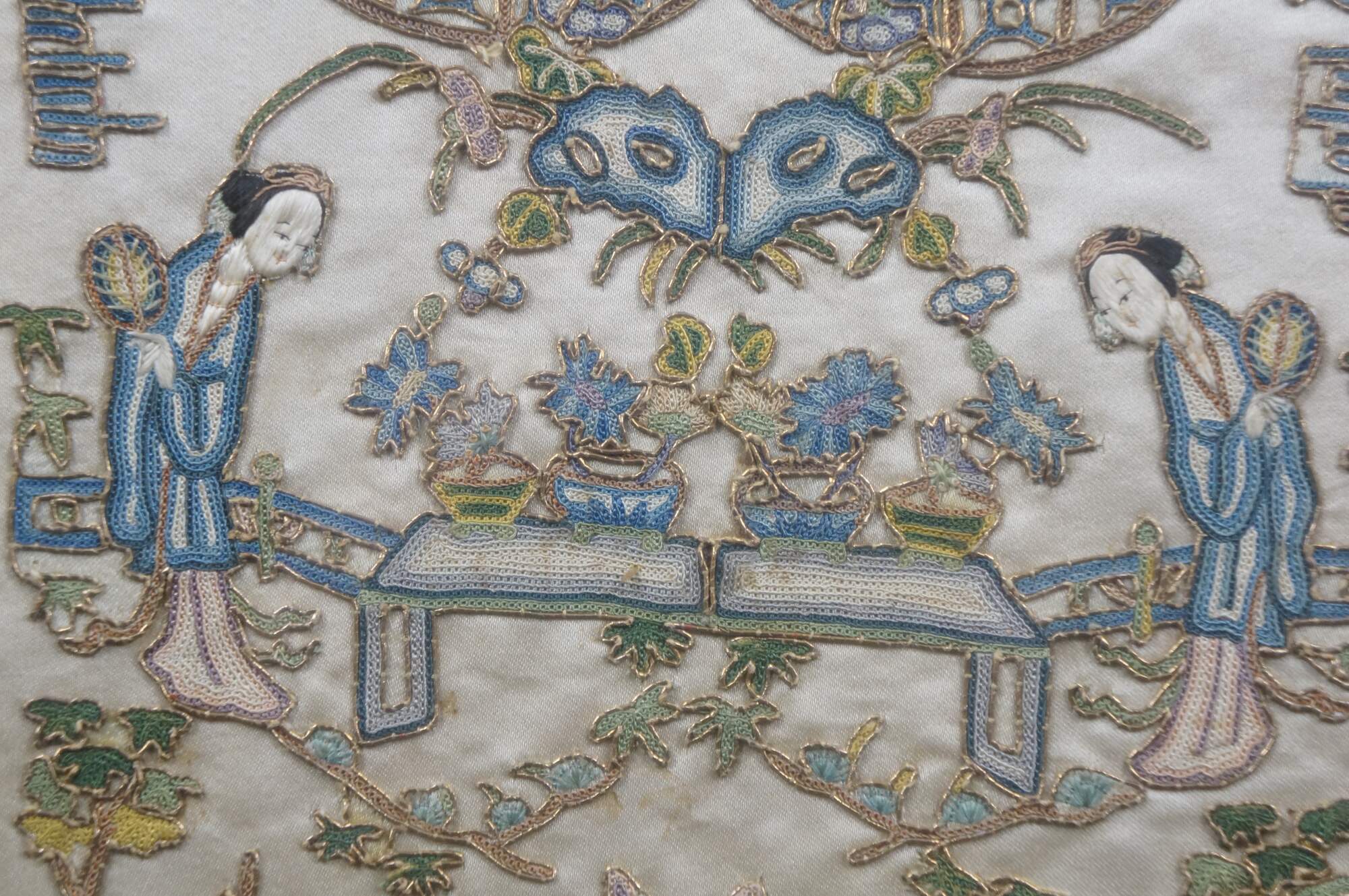 Circa late 19th century Chinese embroidered silk robe sleeve panel featuring a symmetrical design showing a garden landscape with bridge, plant table, trees, and Geishas figures, in shades of blue, pale rose pink, green, and gold. Features the "forbidden stitch" - an intricate, raised embroidery stitch commonly found on textiles from the Qing Dynasty (1644—1911). Wood frame; green silk mat.