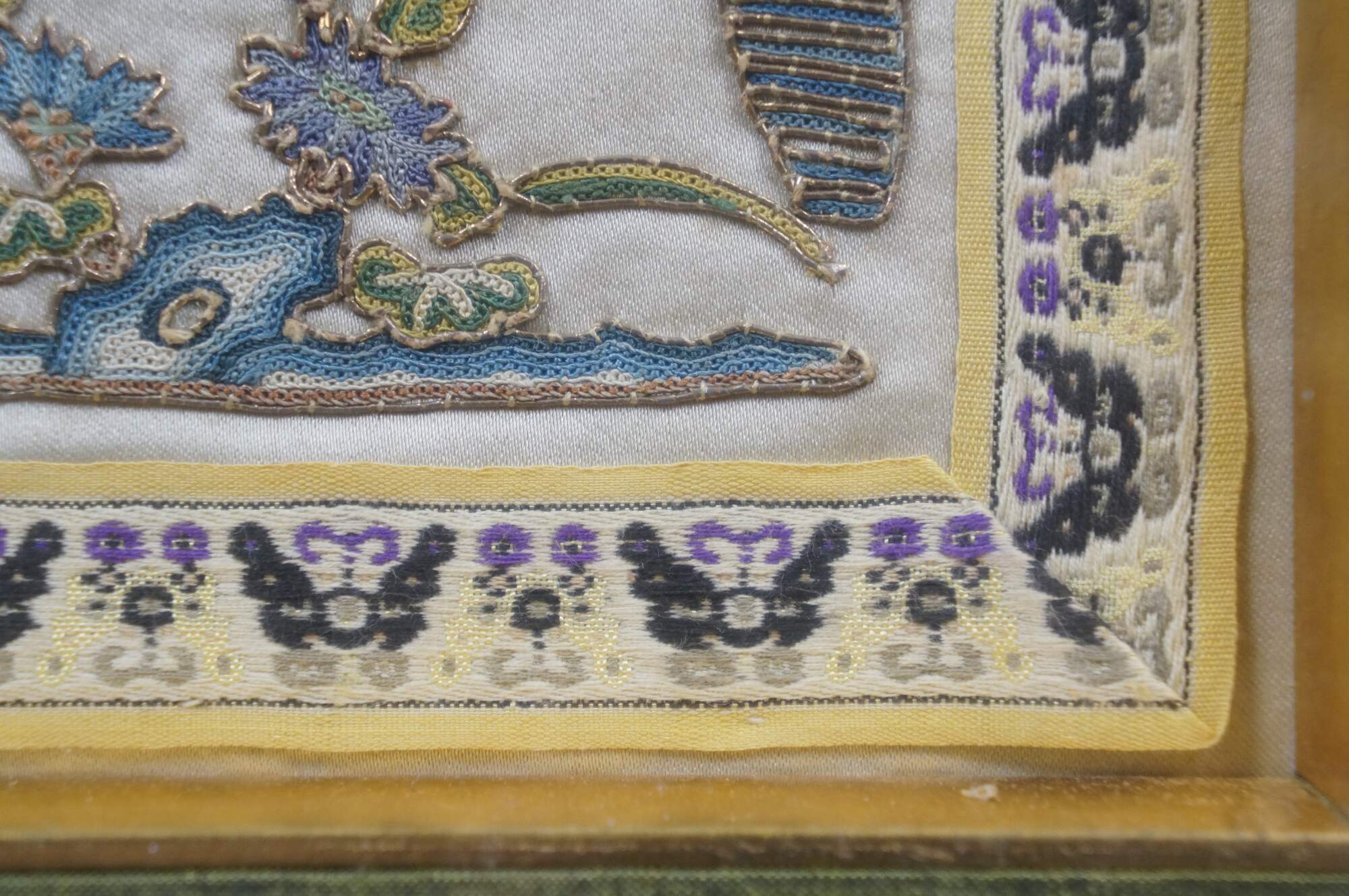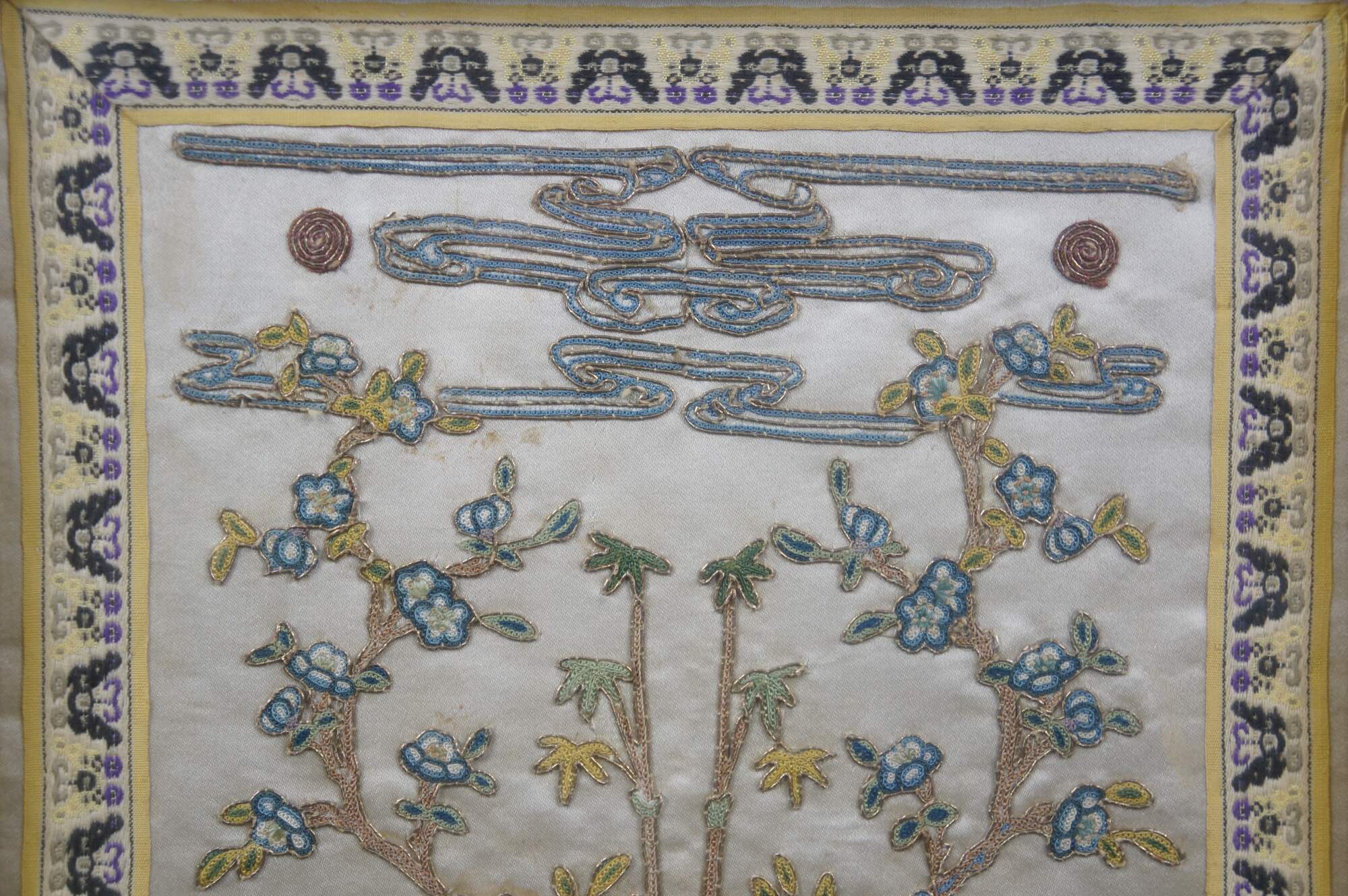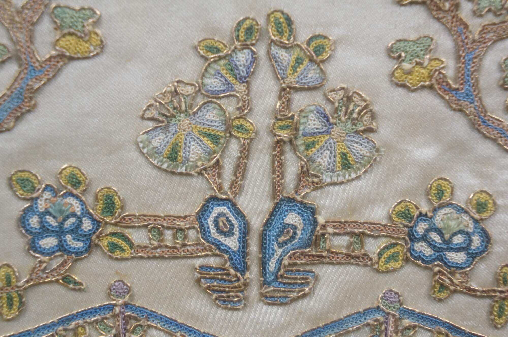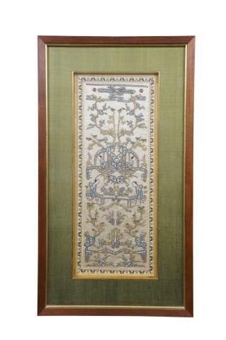 Circa late 19th century Chinese embroidered silk robe sleeve panel featuring a symmetrical design showing a garden landscape with bridge, plant table, trees, and Geishas figures, in shades of blue, pale rose pink, green, and gold. Features the "forbidden stitch" - an intricate, raised embroidery stitch commonly found on textiles from the Qing Dynasty (1644—1911). Wood frame; green silk mat.