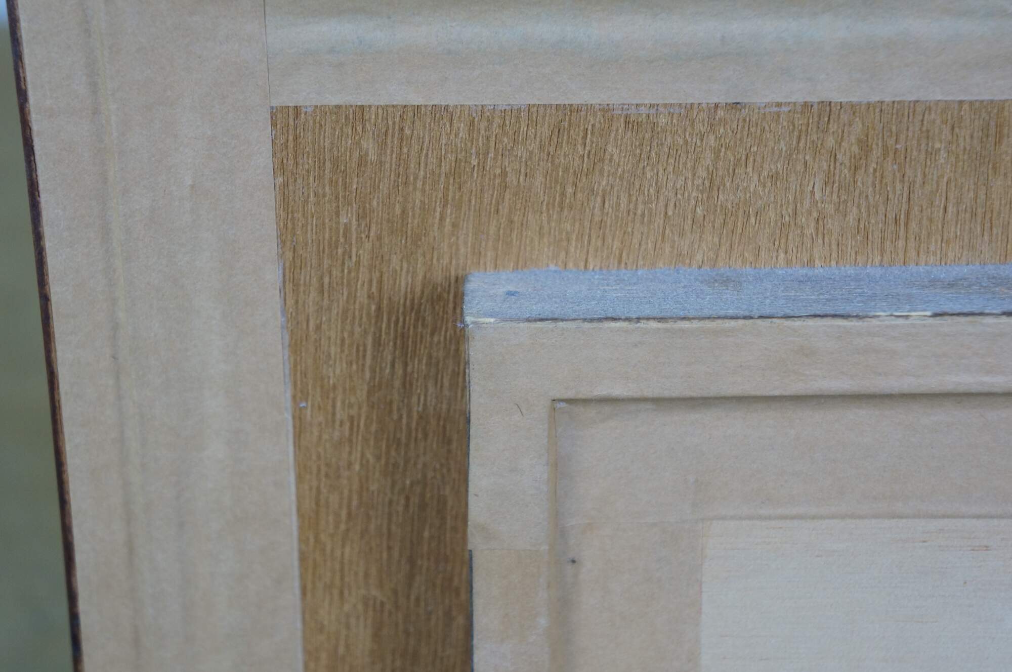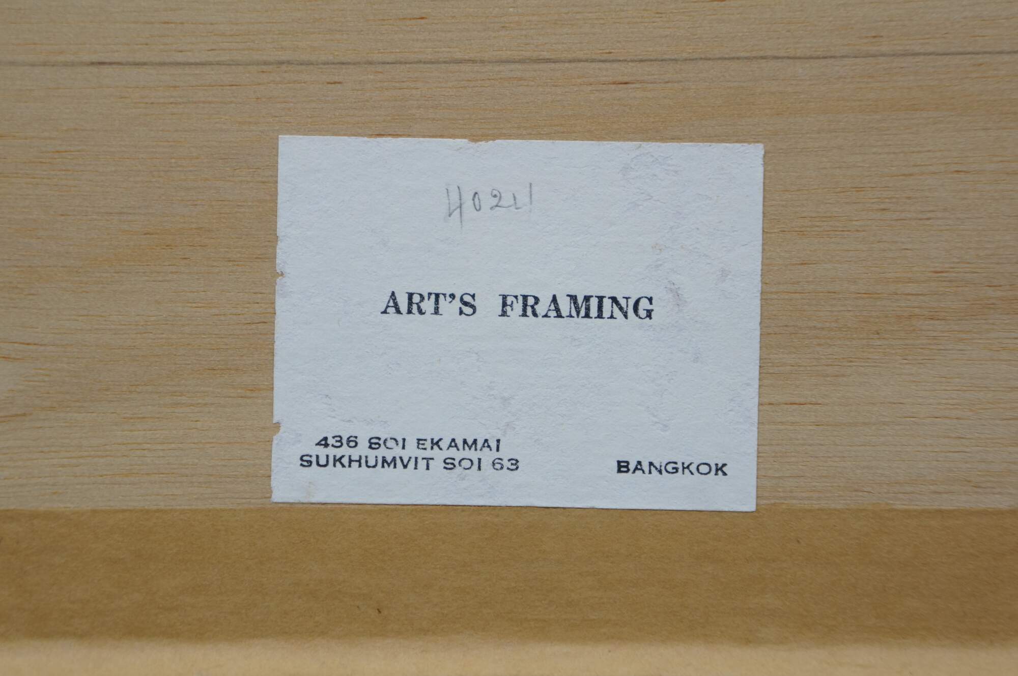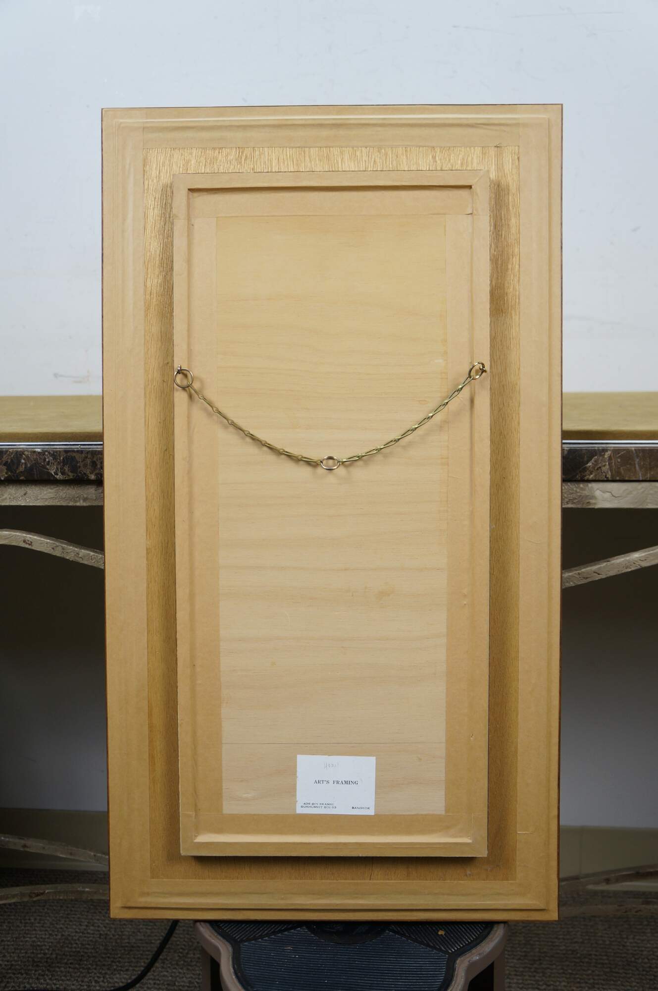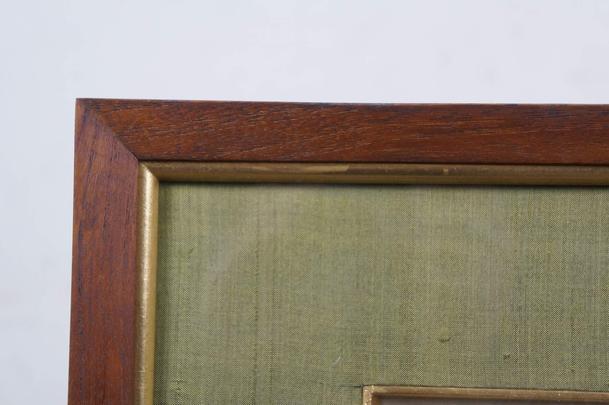 Circa late 19th century Chinese embroidered silk robe sleeve panel featuring a symmetrical design showing a garden landscape with bridge, plant table, trees, and Geishas figures, in shades of blue, pale rose pink, green, and gold. Features the "forbidden stitch" - an intricate, raised embroidery stitch commonly found on textiles from the Qing Dynasty (1644—1911). Wood frame; green silk mat.