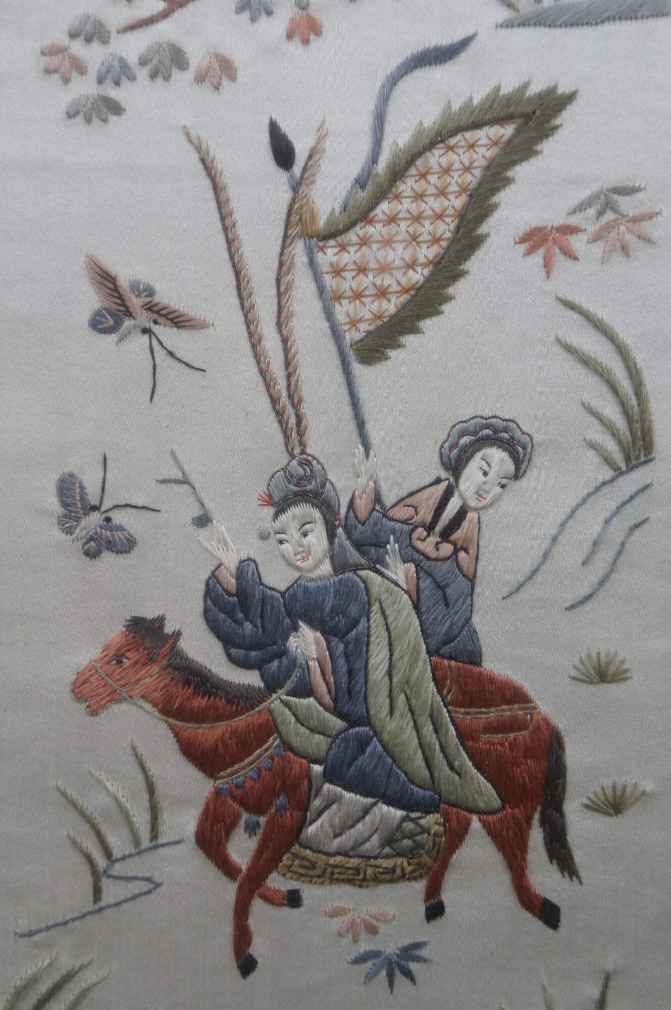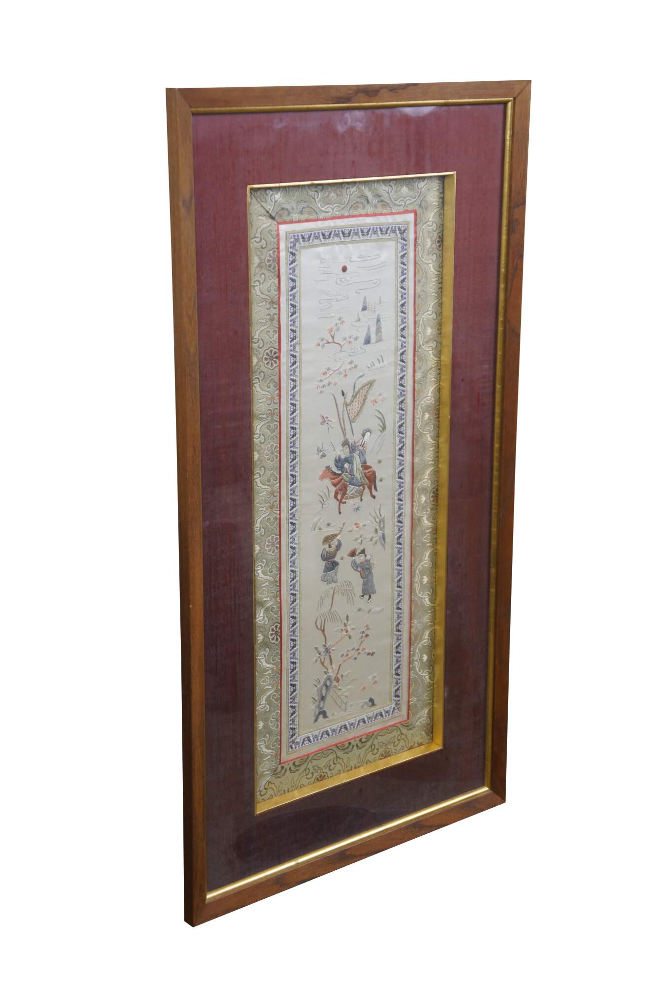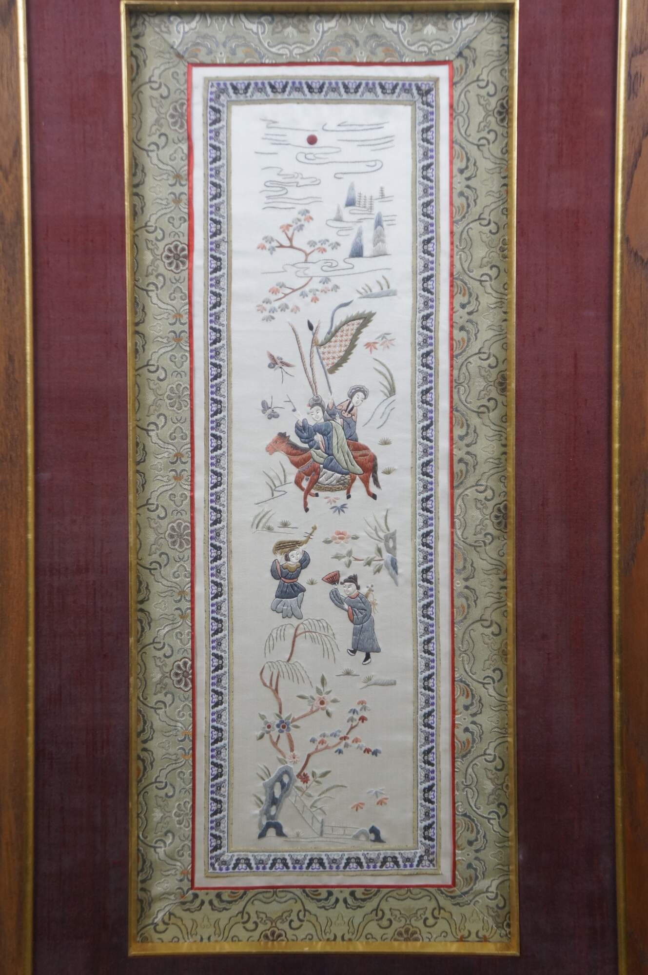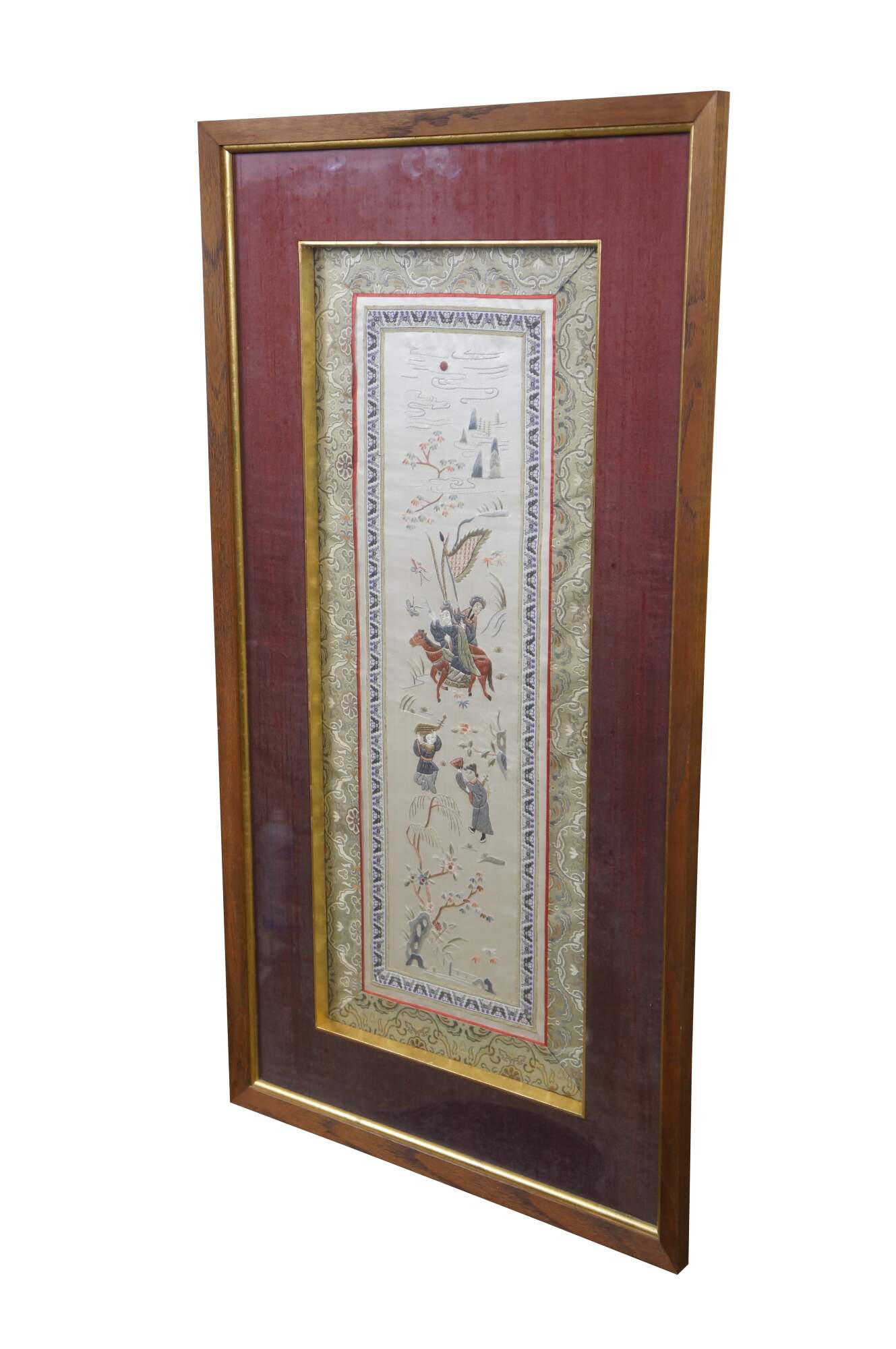 Vintage 20th century Chinese embroidered silk wall hanging panel. Shows a landscape scene with two equestrian figures on a horse with a banner and two more walking / dancing with an instrument and fan. Wood frame; burgundy silk mat.