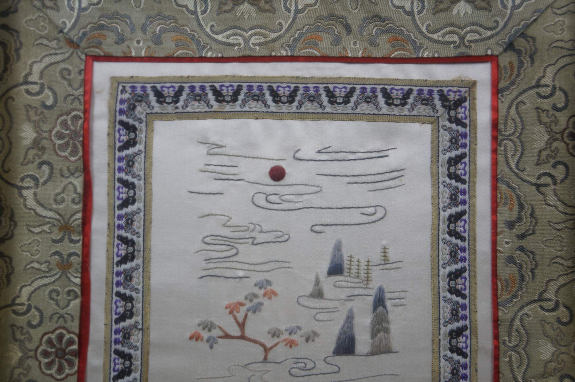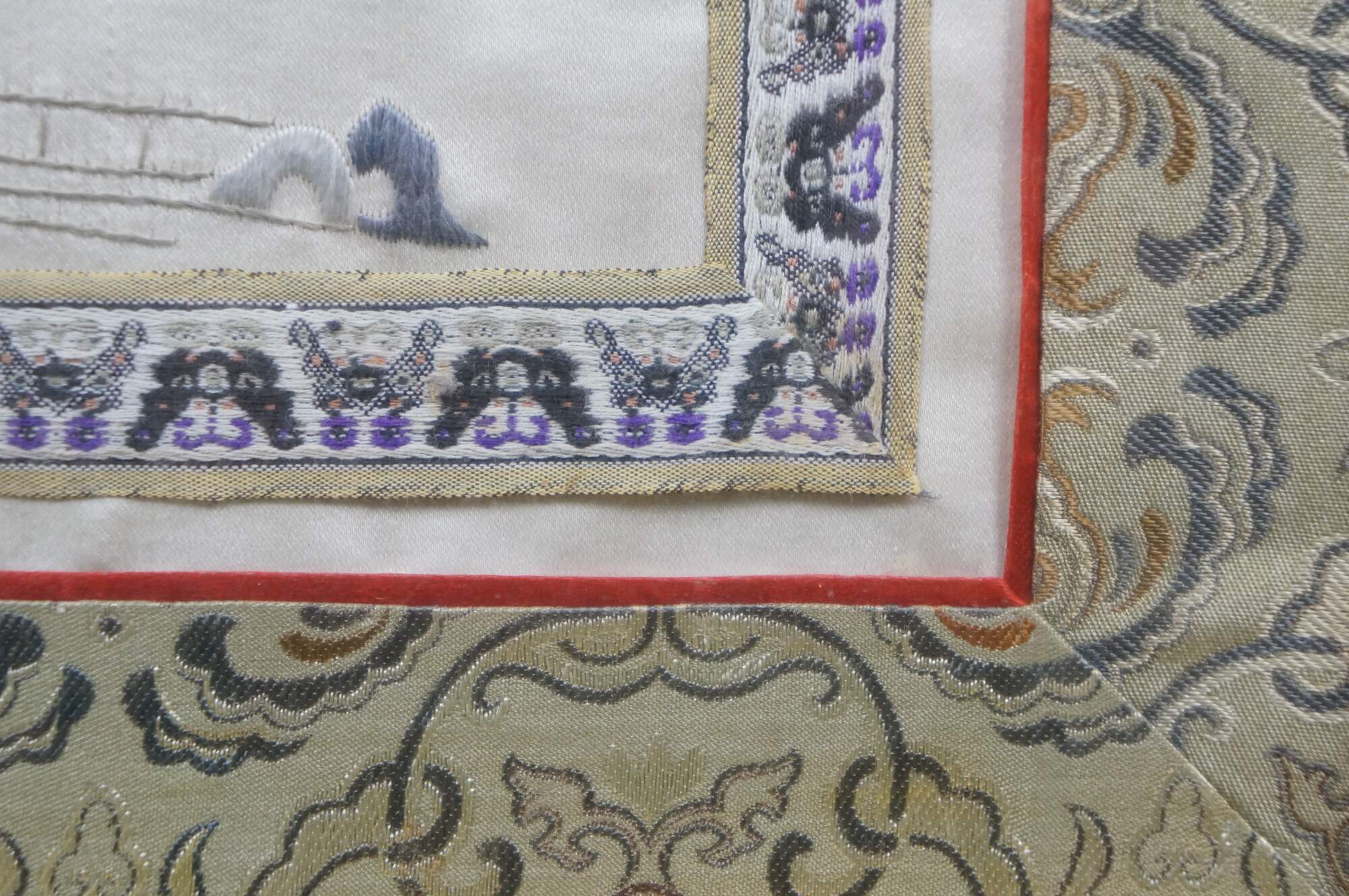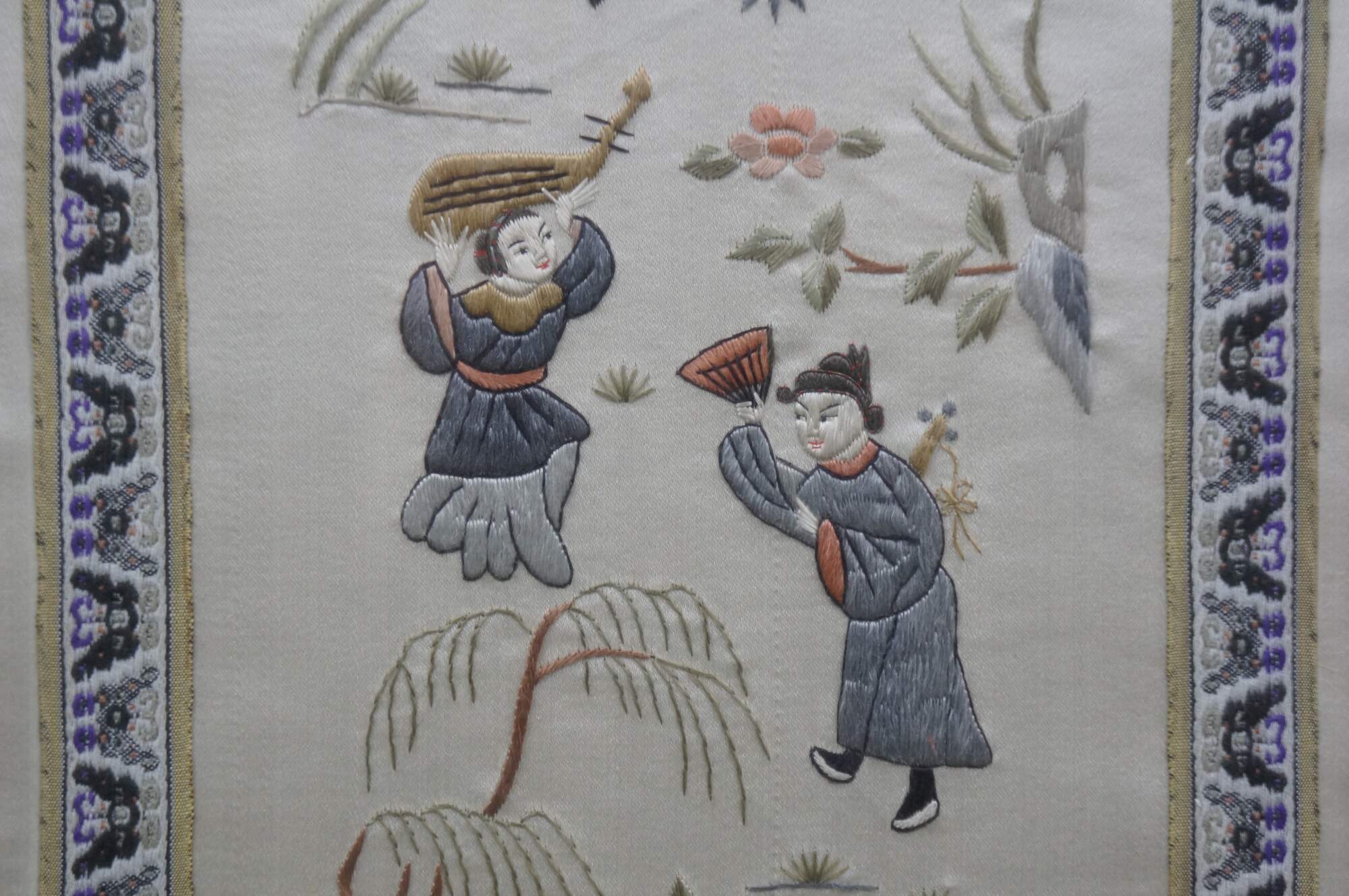 Vintage 20th century Chinese embroidered silk wall hanging panel. Shows a landscape scene with two equestrian figures on a horse with a banner and two more walking / dancing with an instrument and fan. Wood frame; burgundy silk mat.