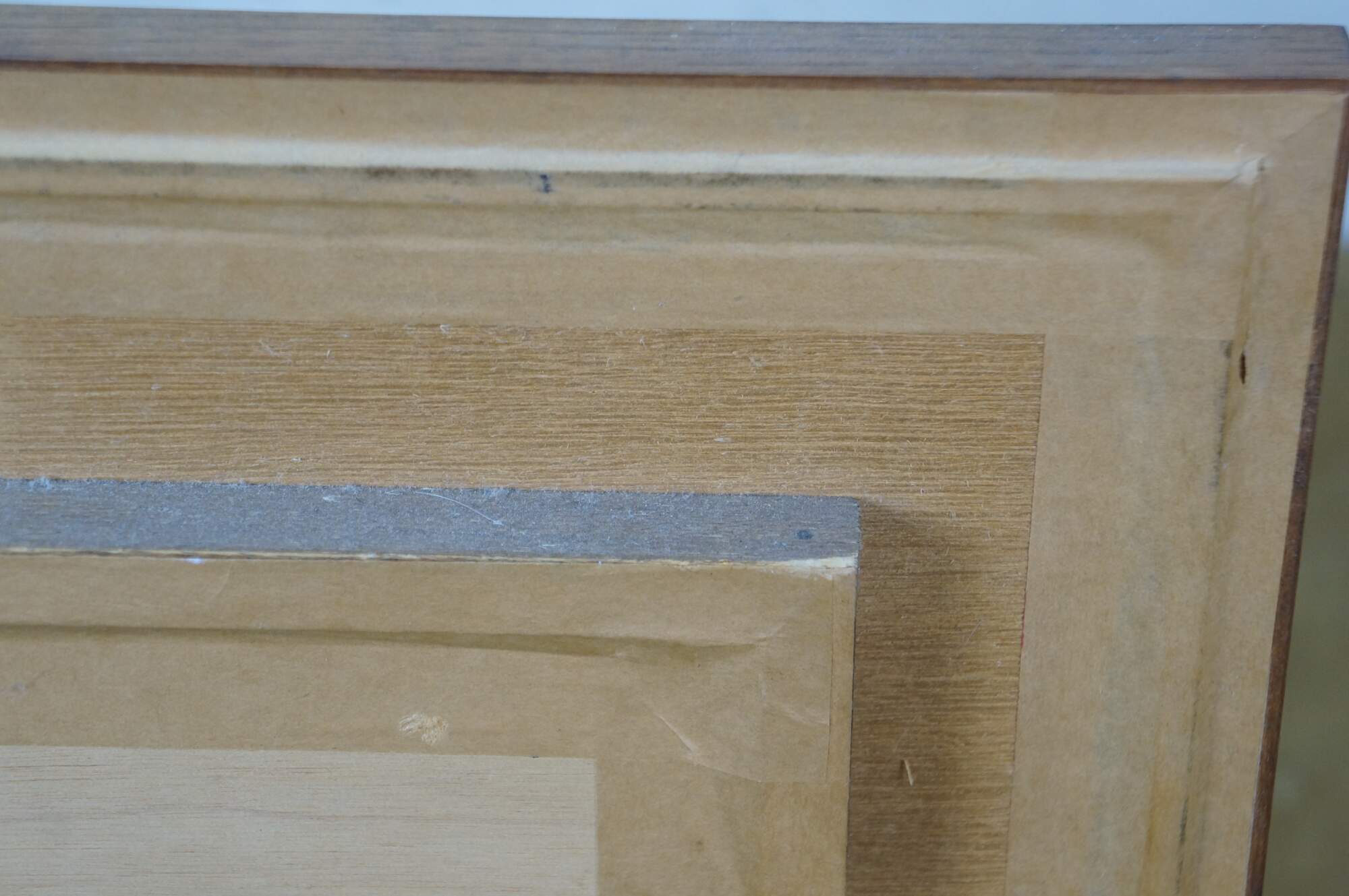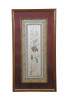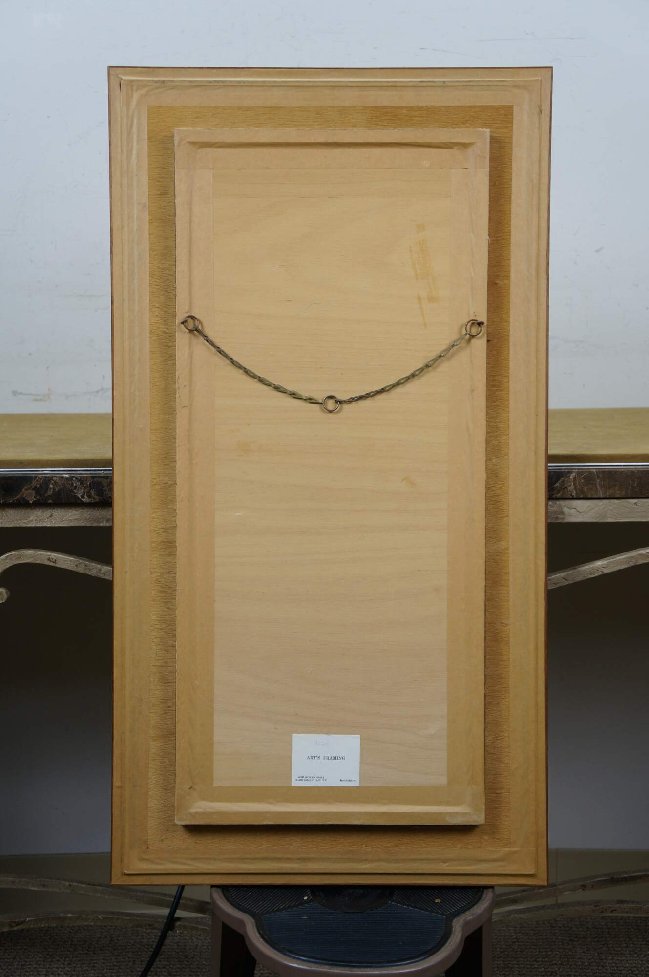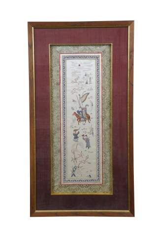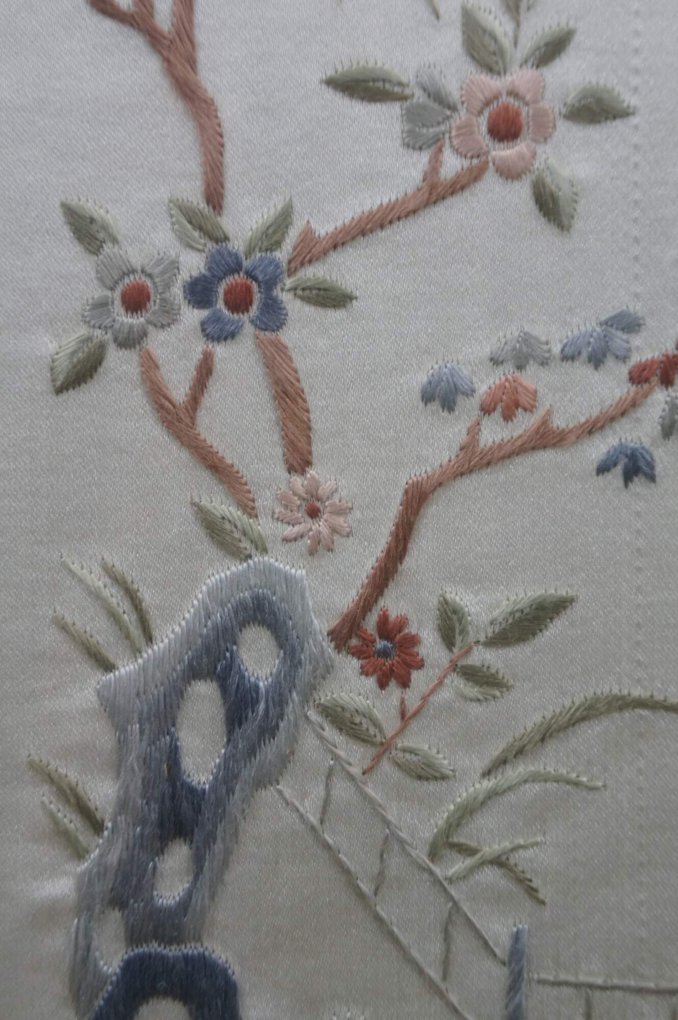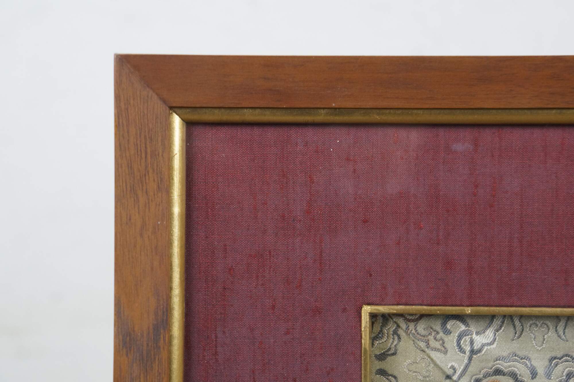 Vintage 20th century Chinese embroidered silk wall hanging panel. Shows a landscape scene with two equestrian figures on a horse with a banner and two more walking / dancing with an instrument and fan. Wood frame; burgundy silk mat.