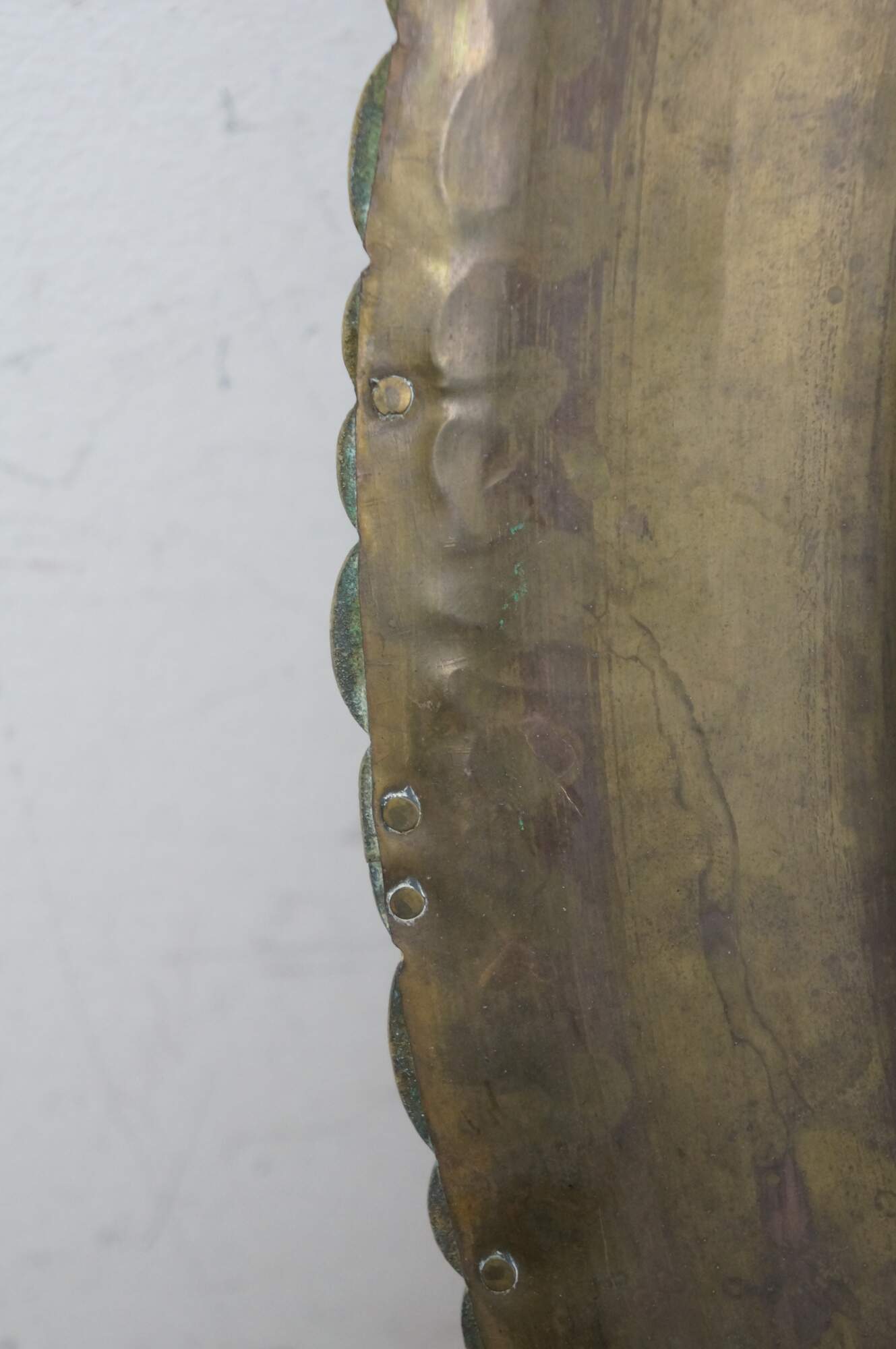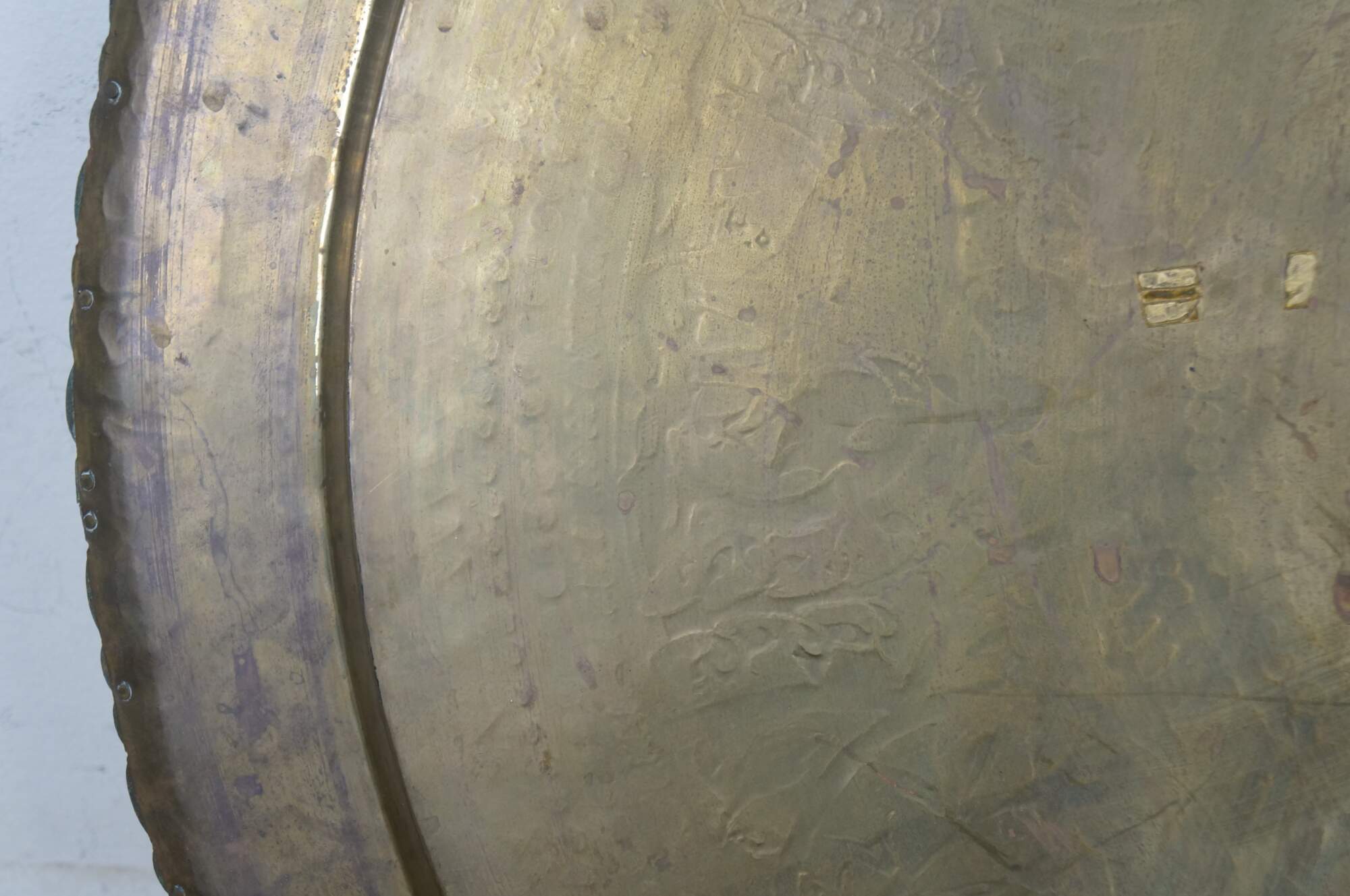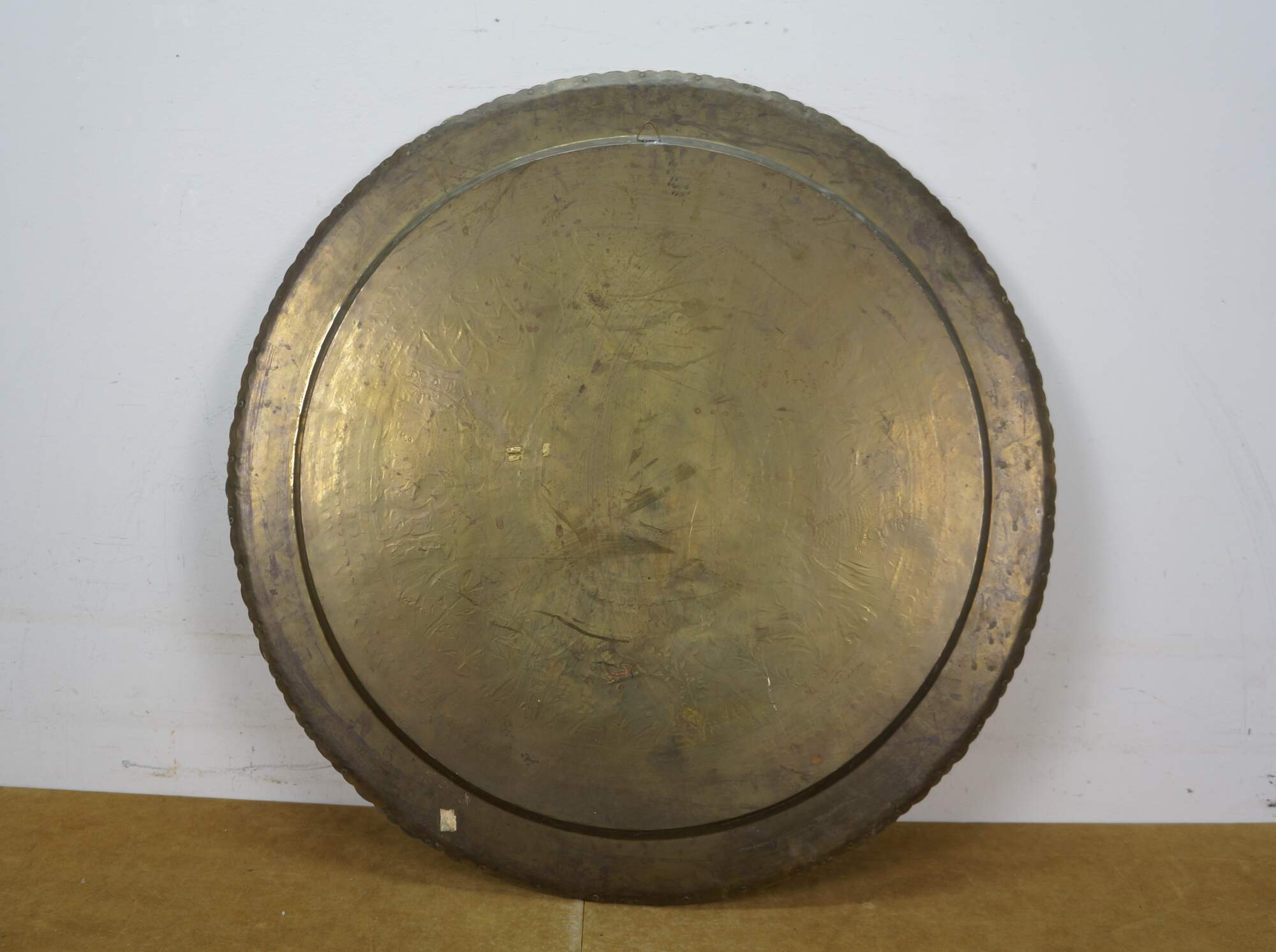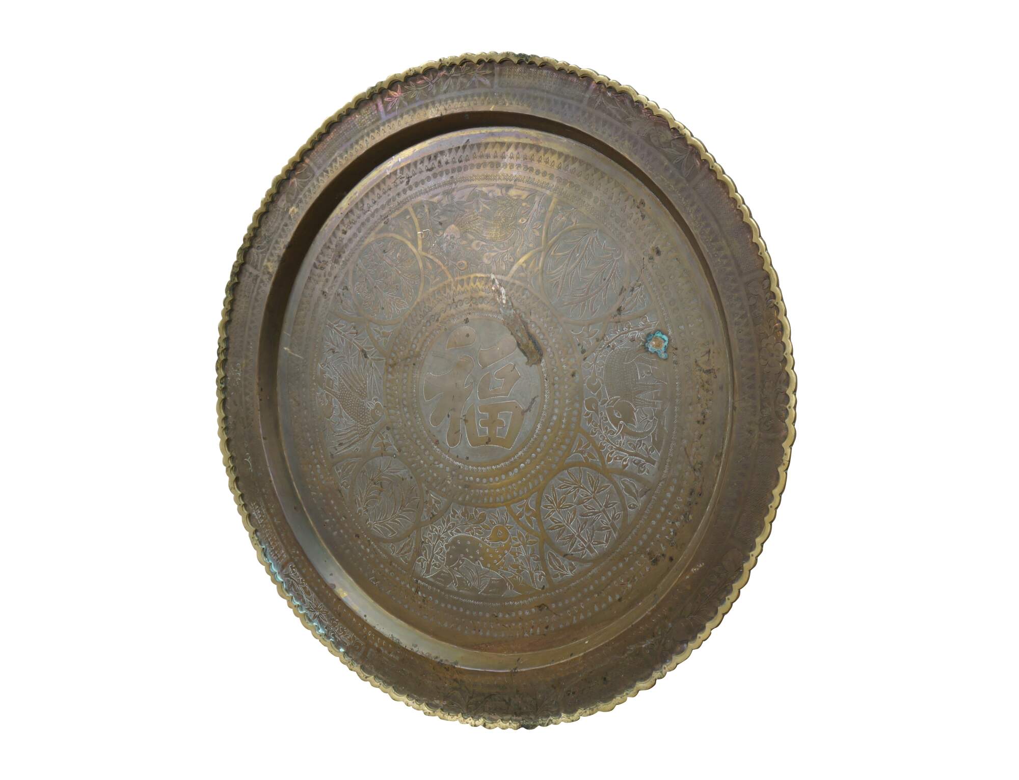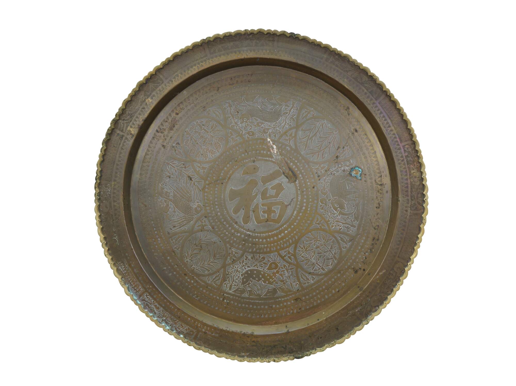 Large 20th century round brass tray with lightly scalloped edge, decorated with a Chinese fu symbol of good fortune, surrounded by flowers and a variety of animals including an elephant, deer, bird and fox (?). Ring on back for hanging as a wall display. Could also be set on a folding stand for use as a side table.