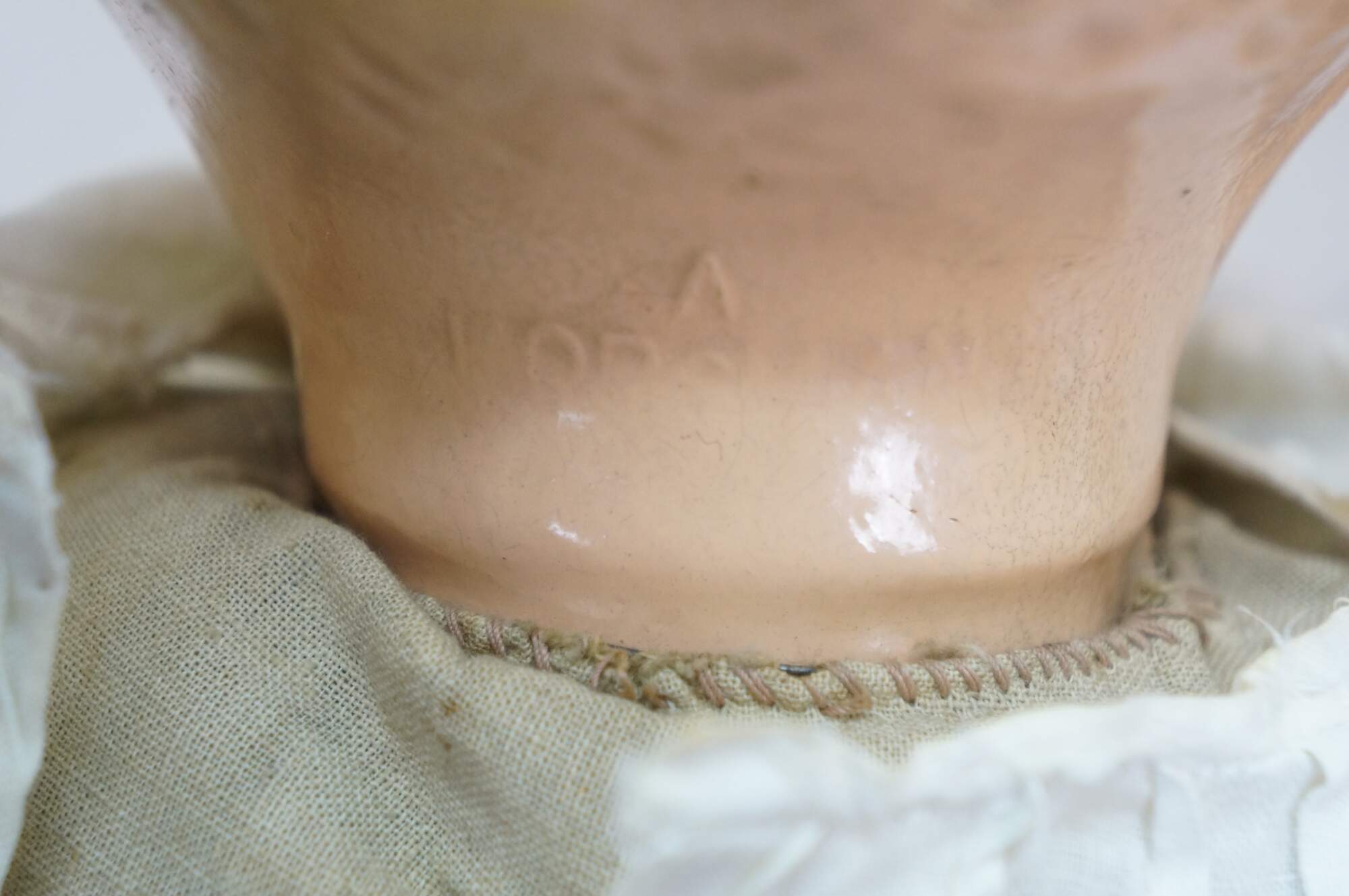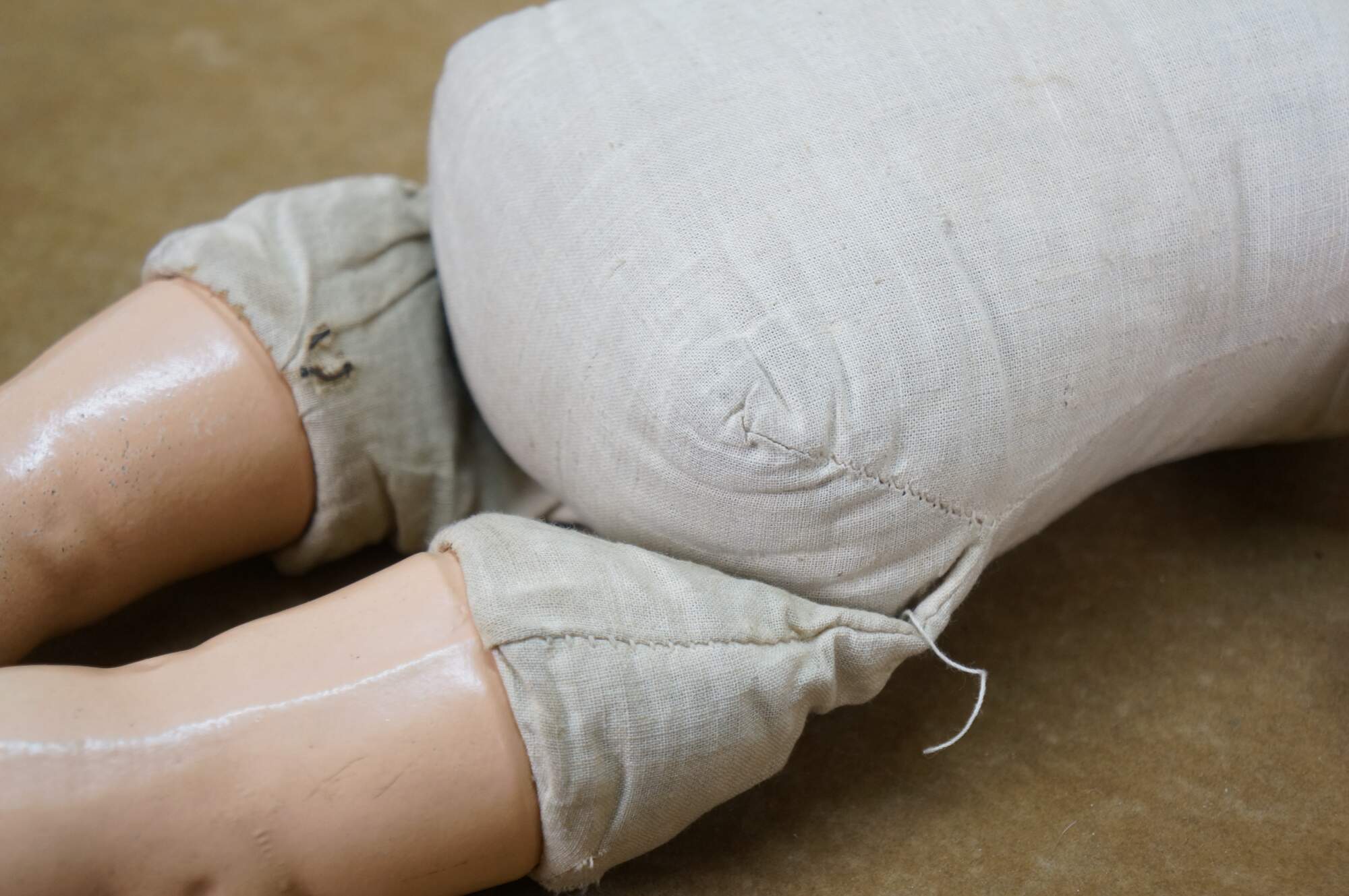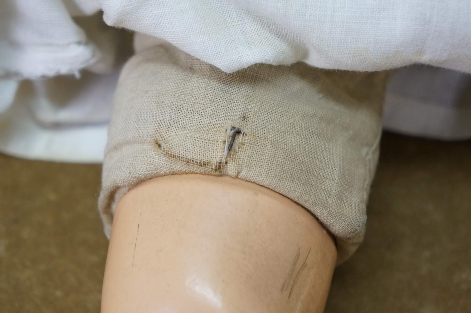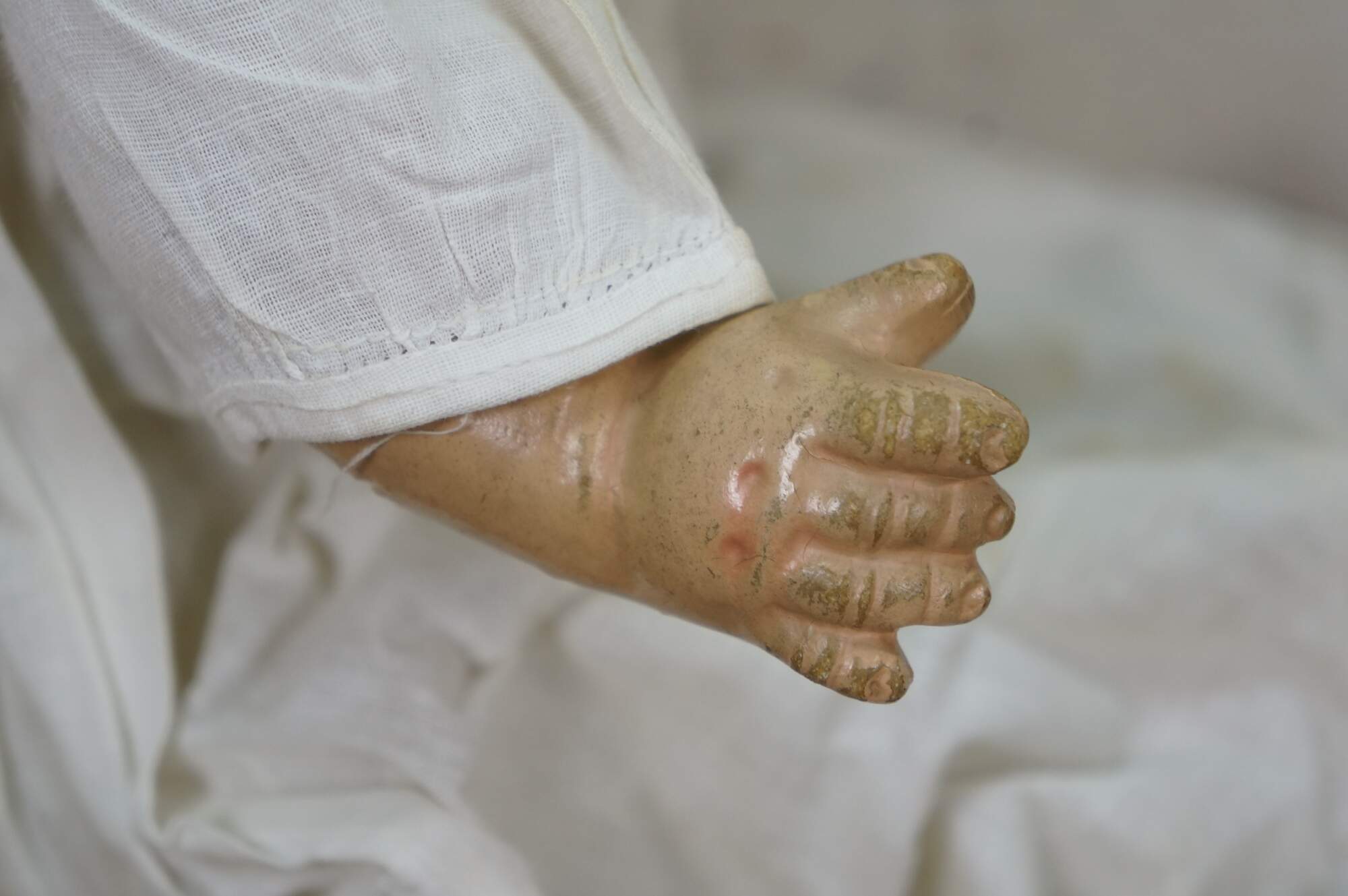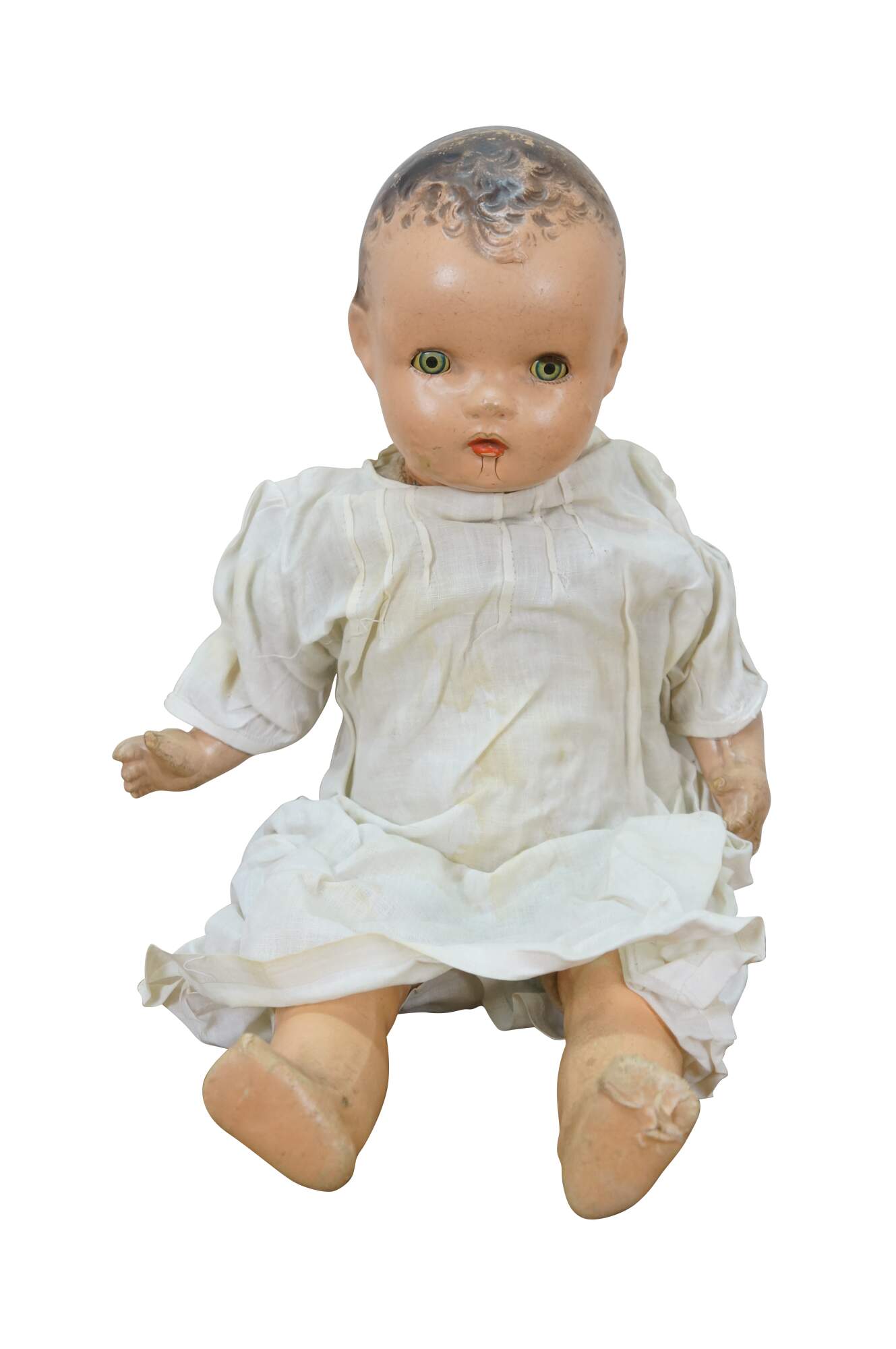 Circa 1940's Horsman Enchanting Eyes baby doll with composition head, arms, and legs, stuffed cotton body, green sleep eyes, and painted hair/features. Unknown puck shaped object inside back. Dressed in Victorian style white cotton nightgown / shift. "1940s Horsman Enchanting Eyes doll, 15-16" tall (probably other sizes as well), composition flange head, full or partial composition arms or legs, cloth stuffed body, brown painted molded hair, flirty sleep eyes that also move side to side (some have been found with non-flirty sleep eyes too), closed mouth, doll marked A Horsman Doll." (Doll Reference)