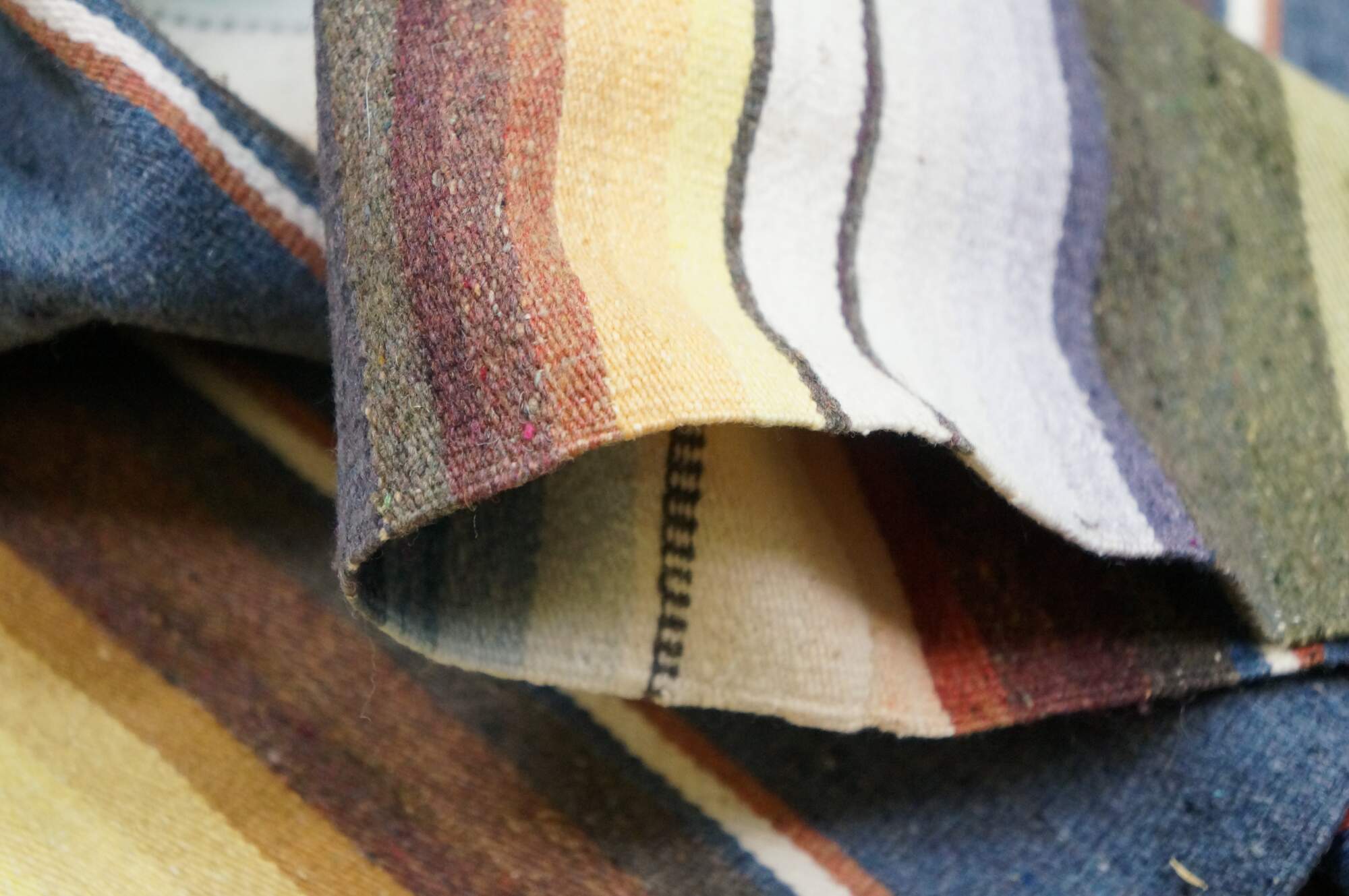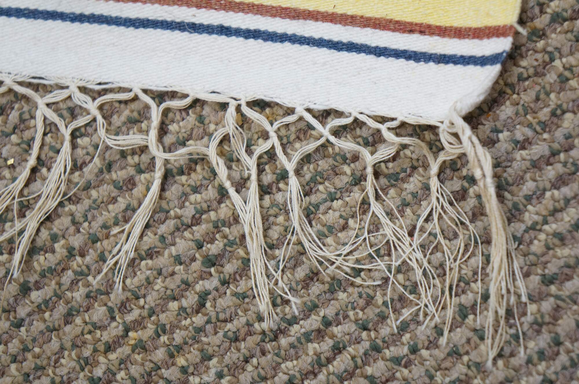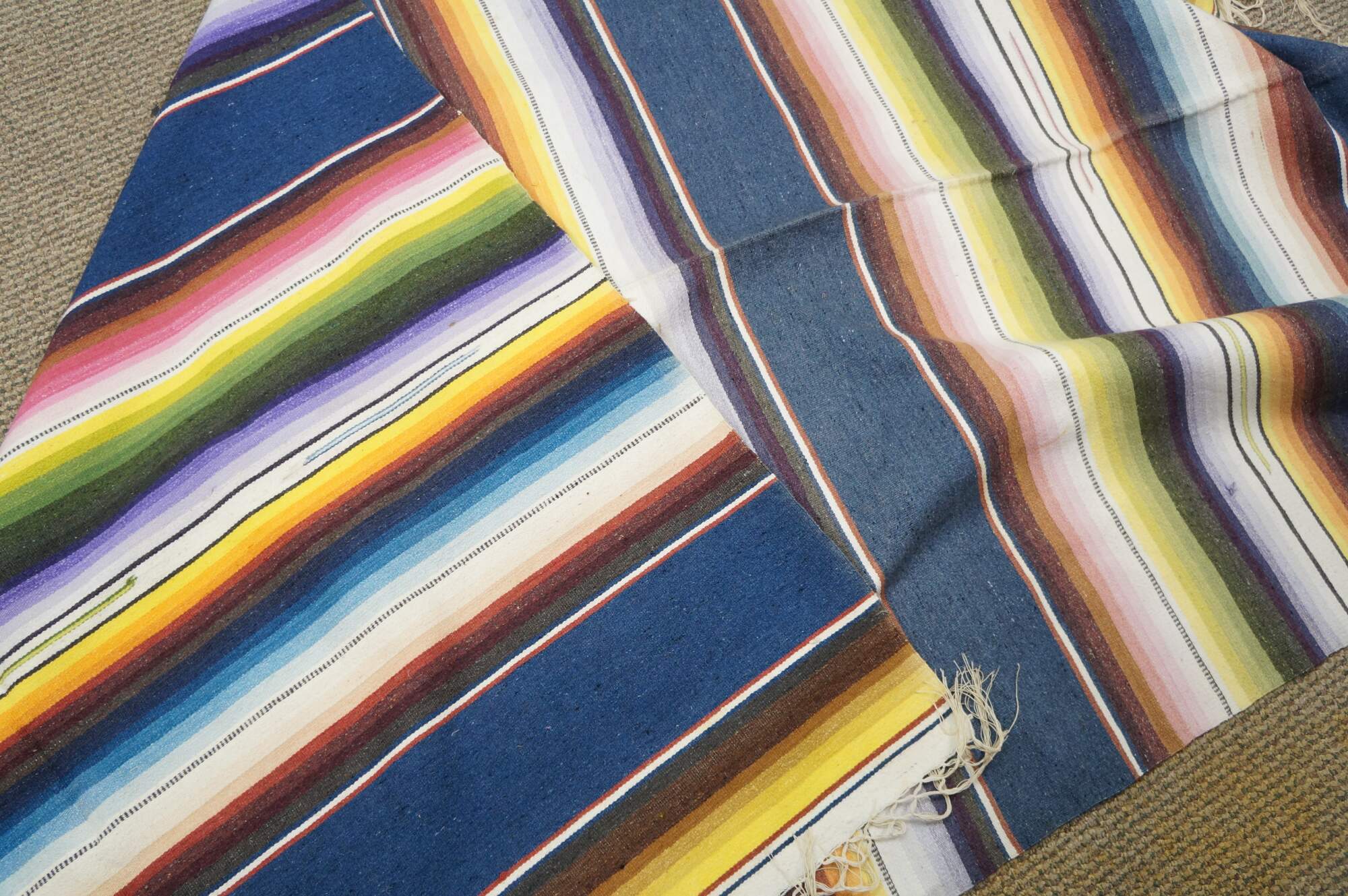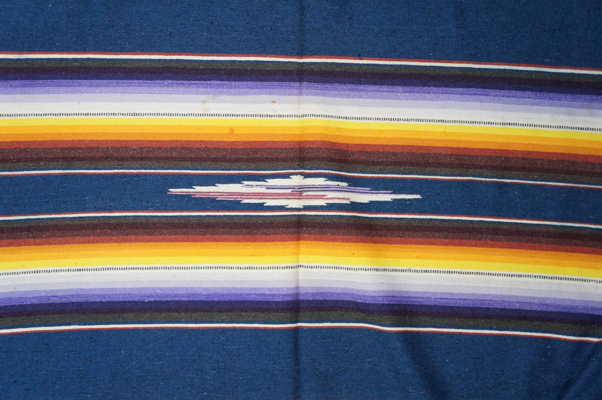 Vintage 20th century Mexican wool serape / rug / blanket. Lightweight woven fabric in a bright multi-colored rainbow of stripes and a central geometric motif. White knotted fringe. Circa 1970s.