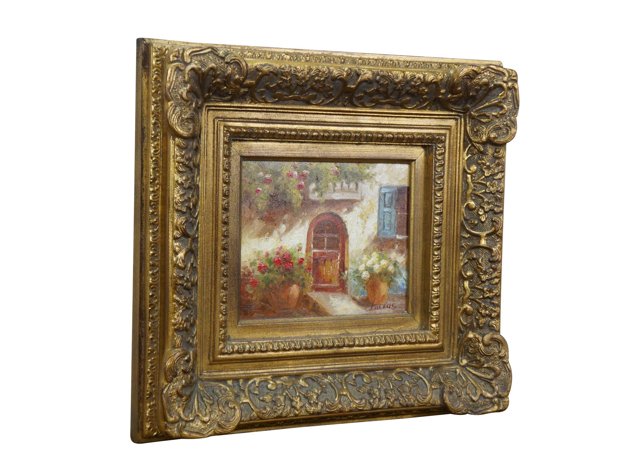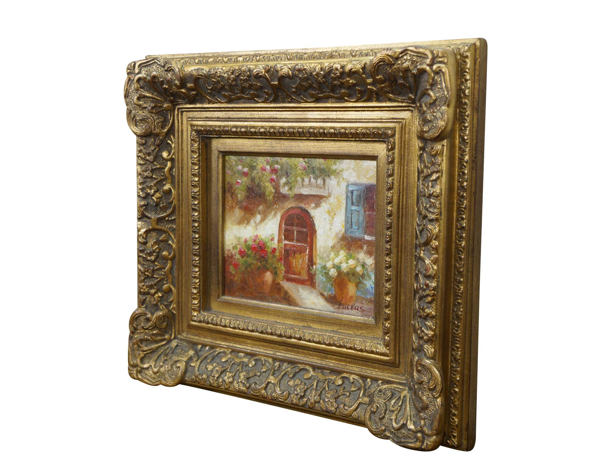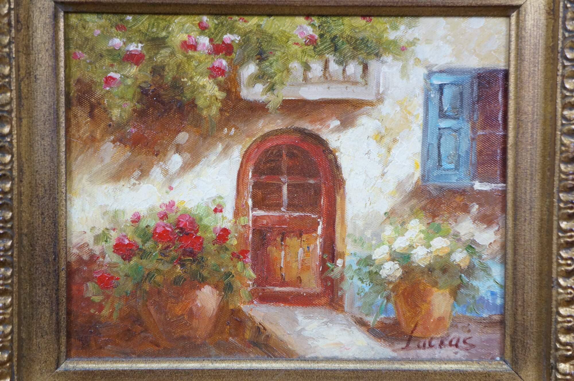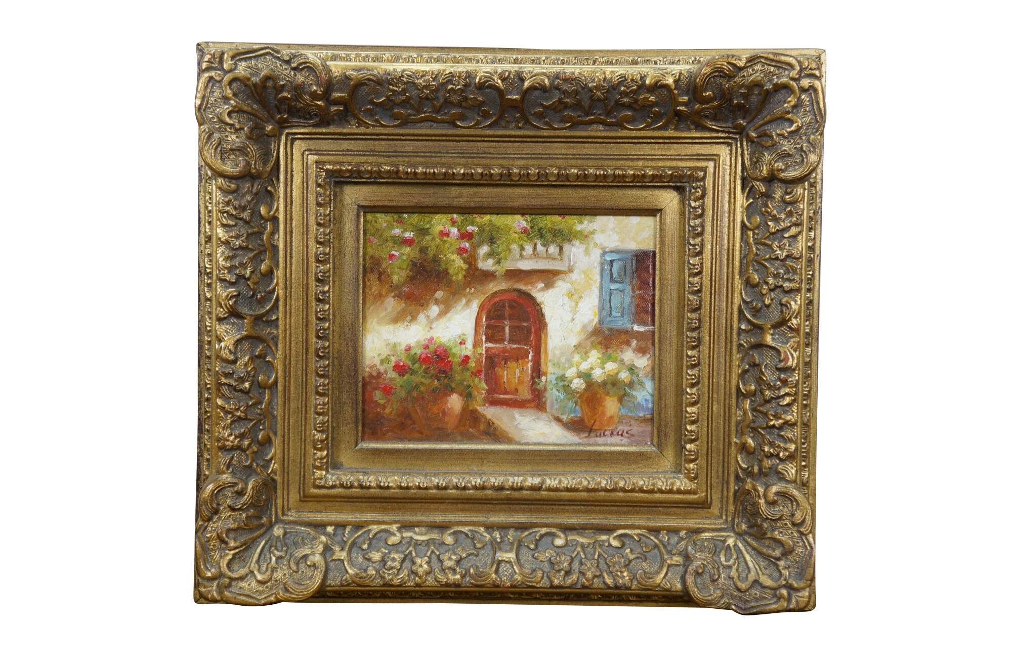 Late 20th century impressionist oil painting on canvas showing a quaint cottage surrounded by flowers with an arch shaped wooden door and window with blue shutters. Signed Lucas / Lucias, lower right. Produced for Timeless Treasures. Certificate of Authenticity Number AFD130137. Gilt composite on wood frame with French foliate and scalloped corner design.