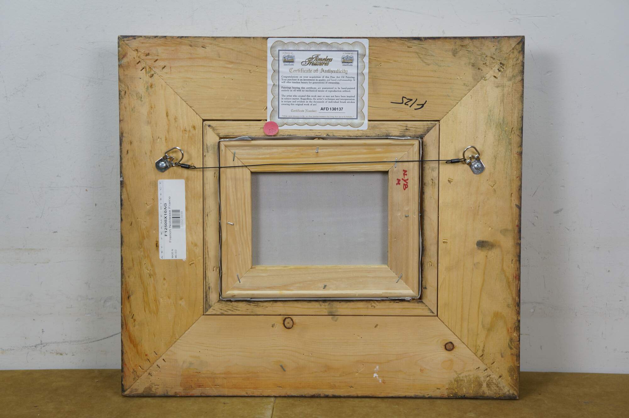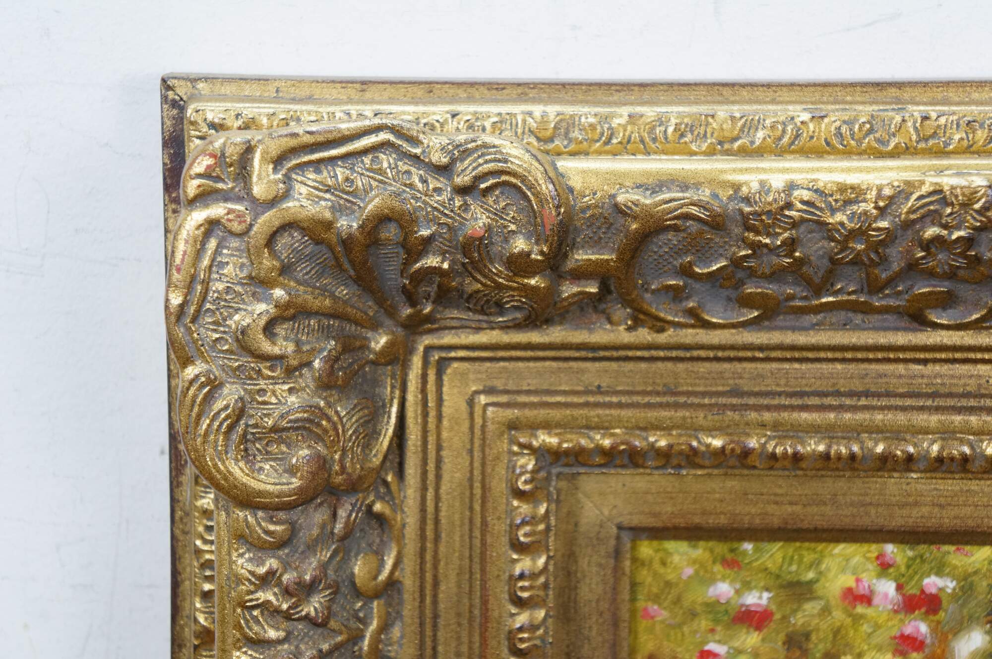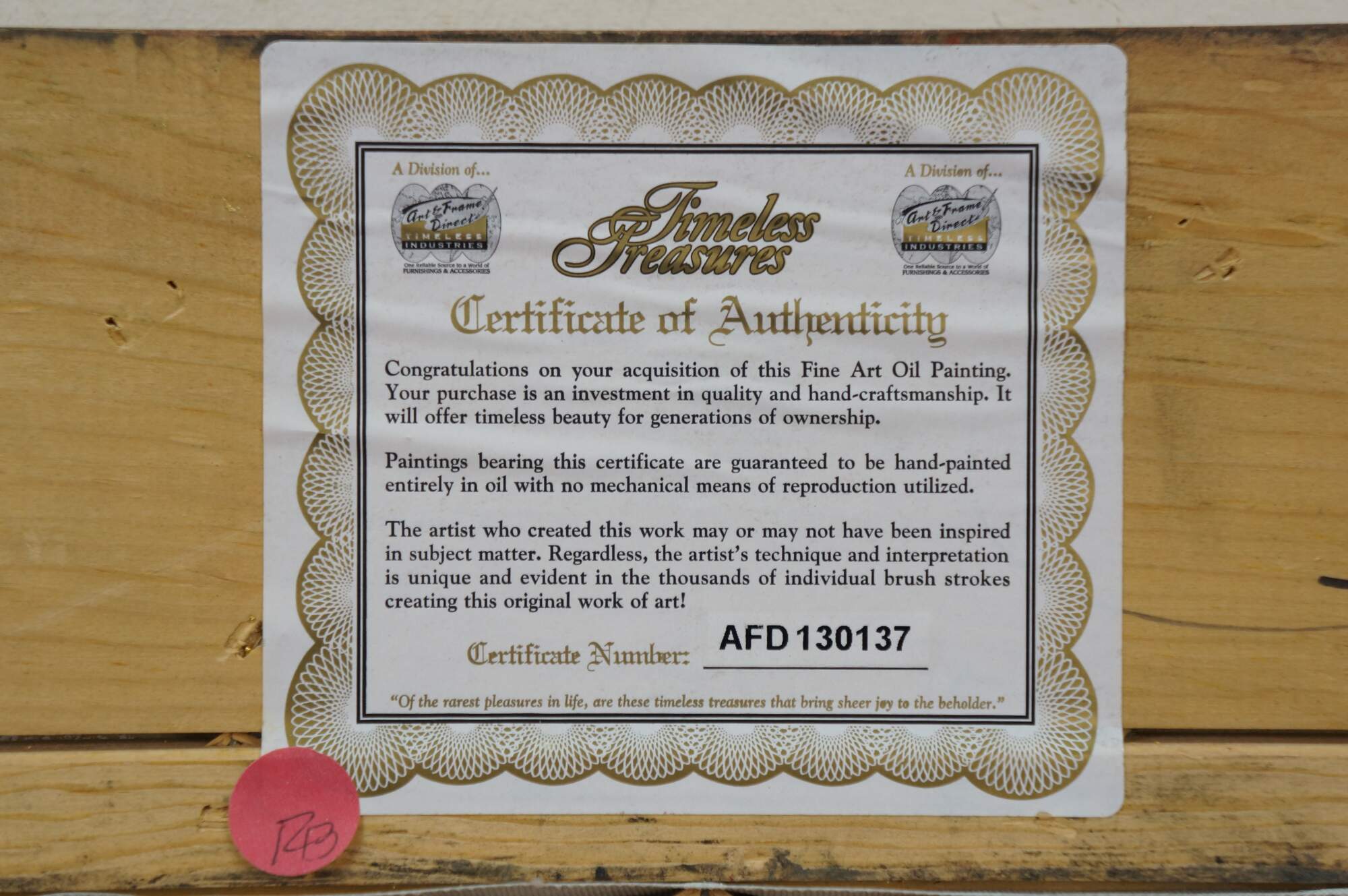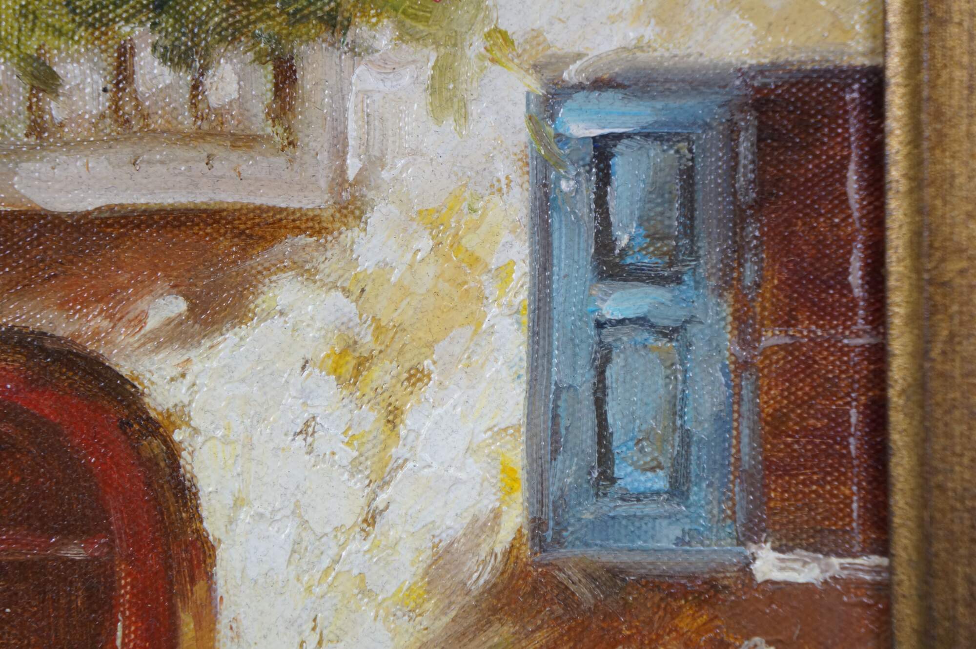 Late 20th century impressionist oil painting on canvas showing a quaint cottage surrounded by flowers with an arch shaped wooden door and window with blue shutters. Signed Lucas / Lucias, lower right. Produced for Timeless Treasures. Certificate of Authenticity Number AFD130137. Gilt composite on wood frame with French foliate and scalloped corner design.