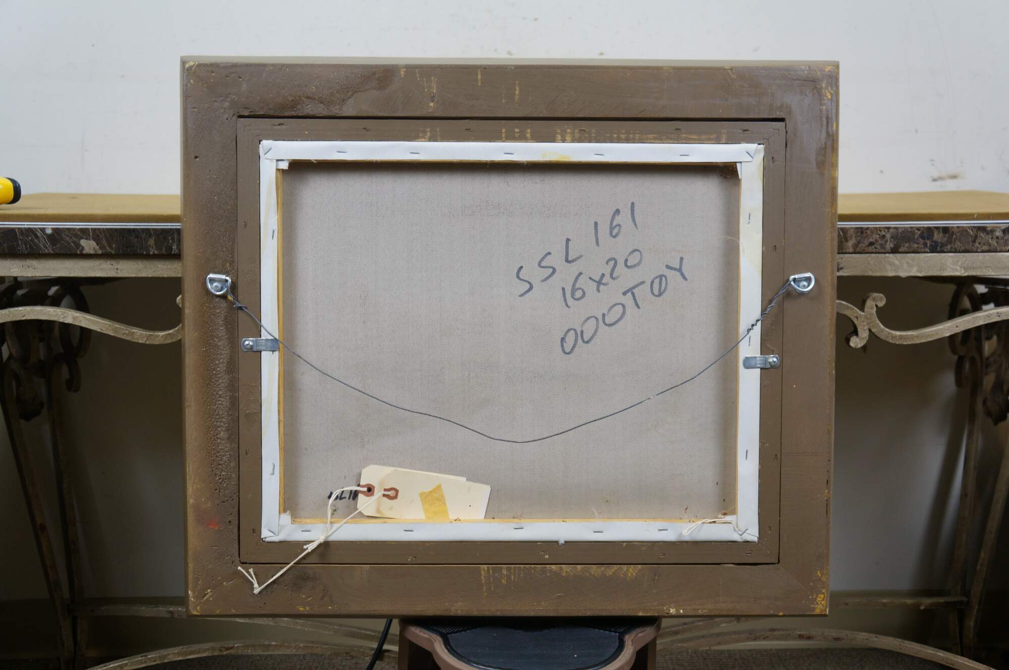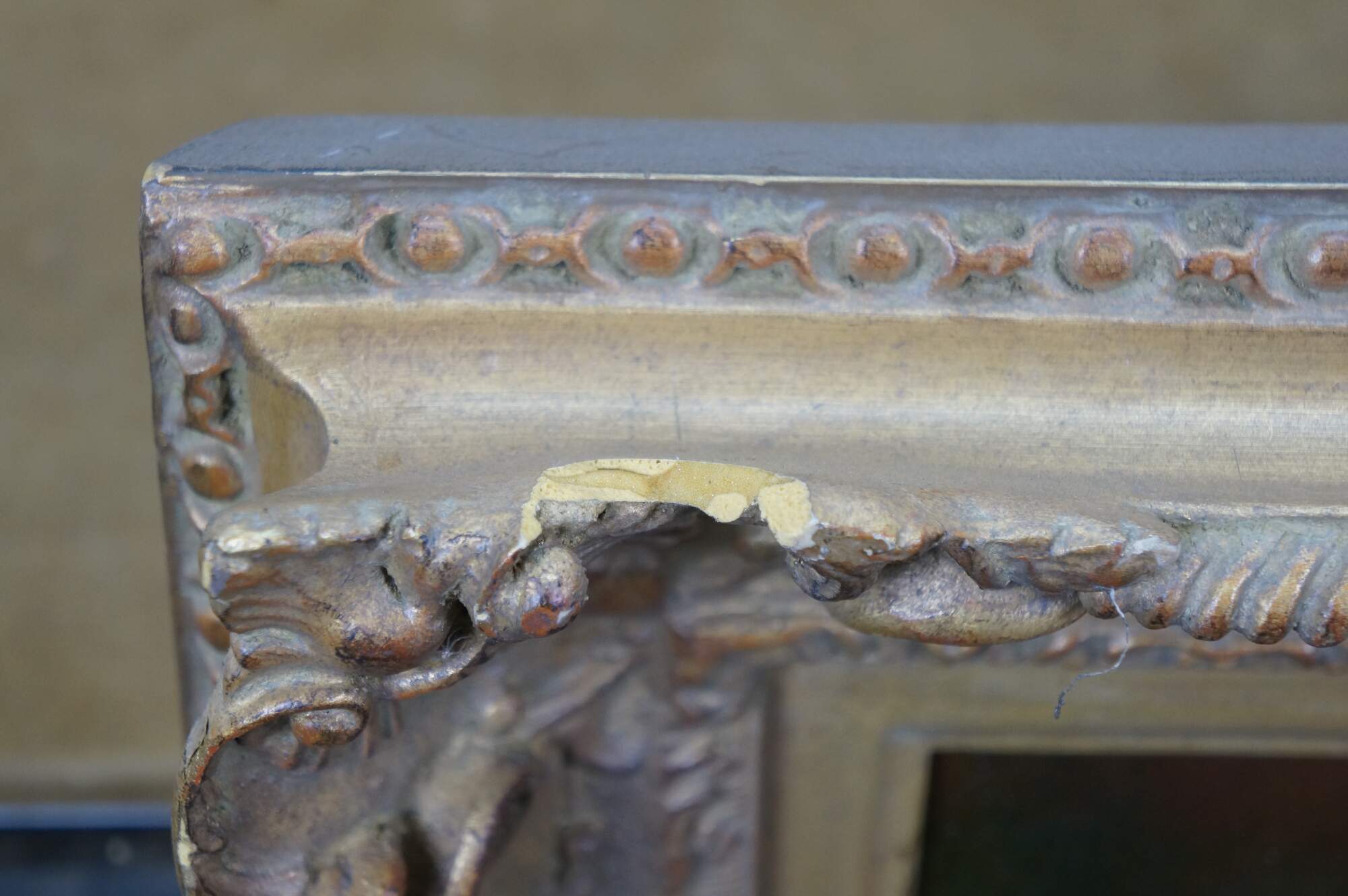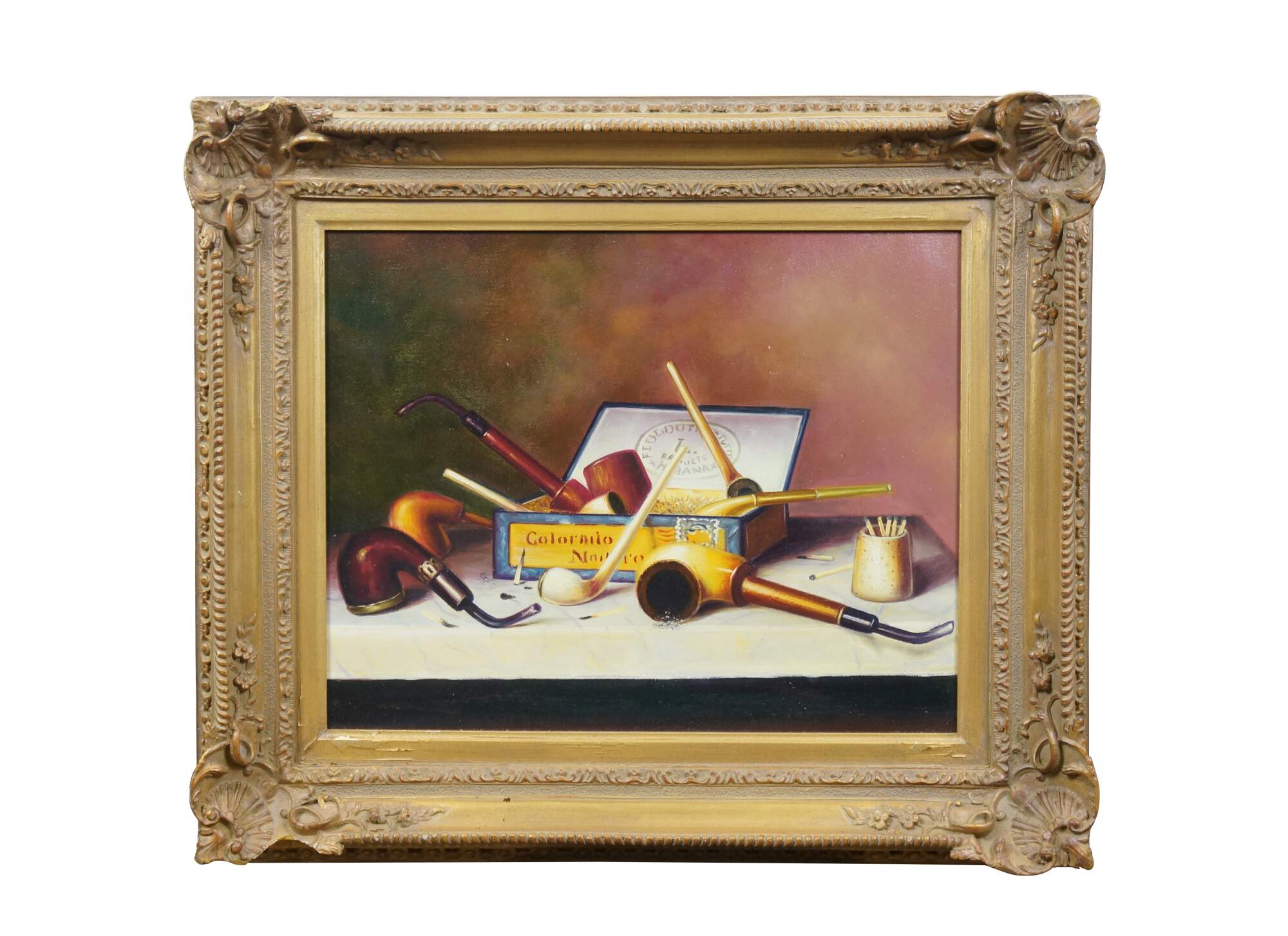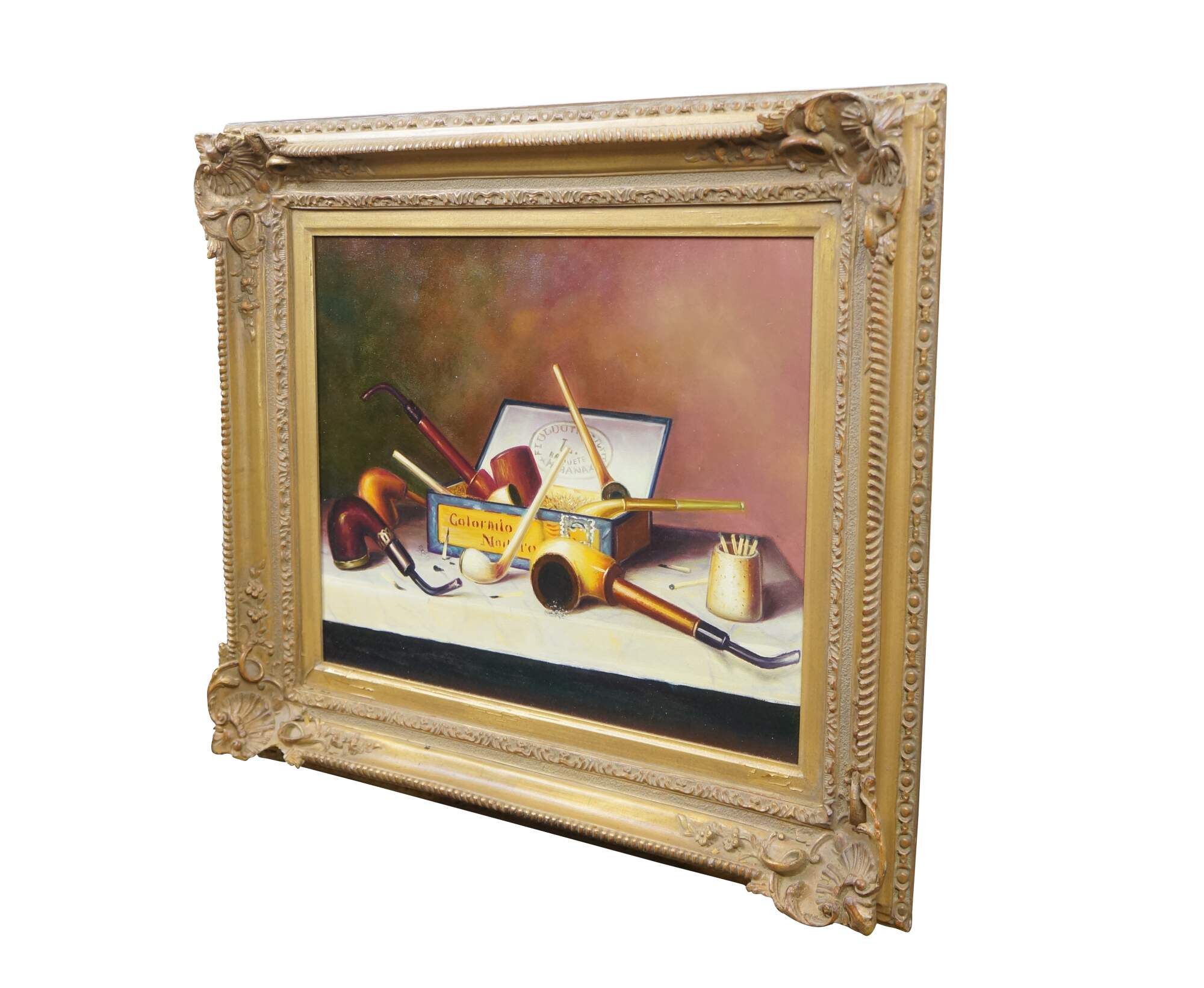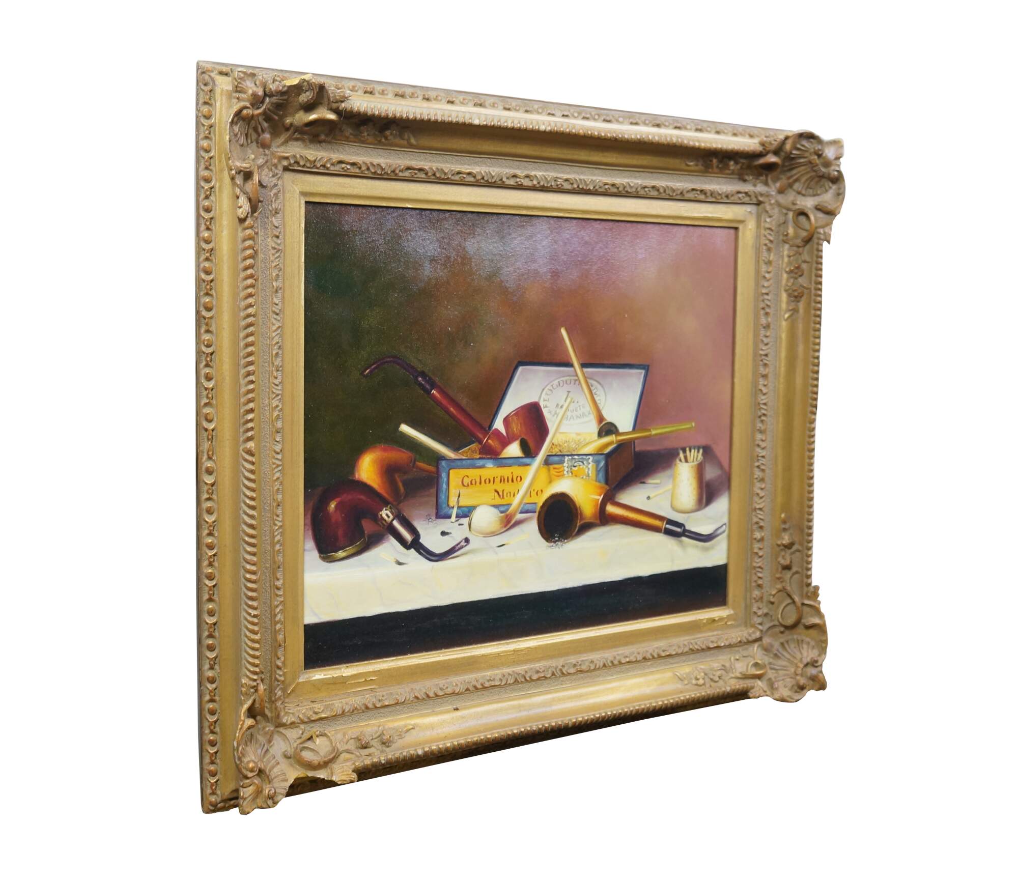 Late 20th century oil on canvas still life painting after "The Social Club" by William Michael Harnett, originally painted in 1879. Realistic still life showing an array of tobacco pipes, matches in a cup, and a cigar box on a white table. Gilt composite frame featuring foliate borders and scallop shell corners.