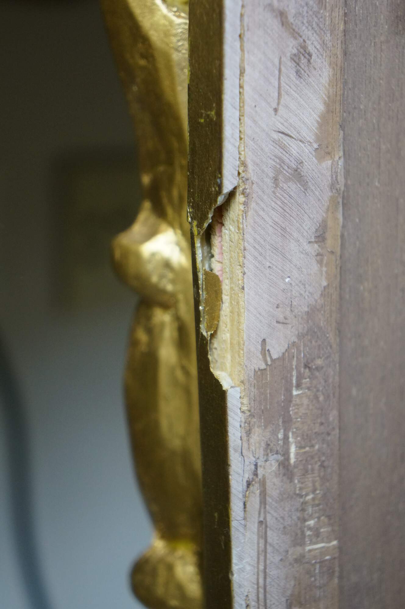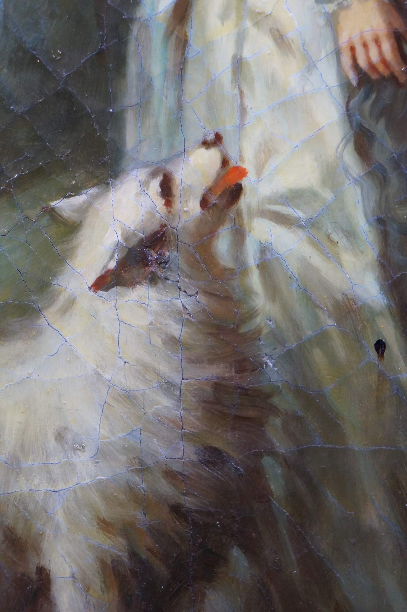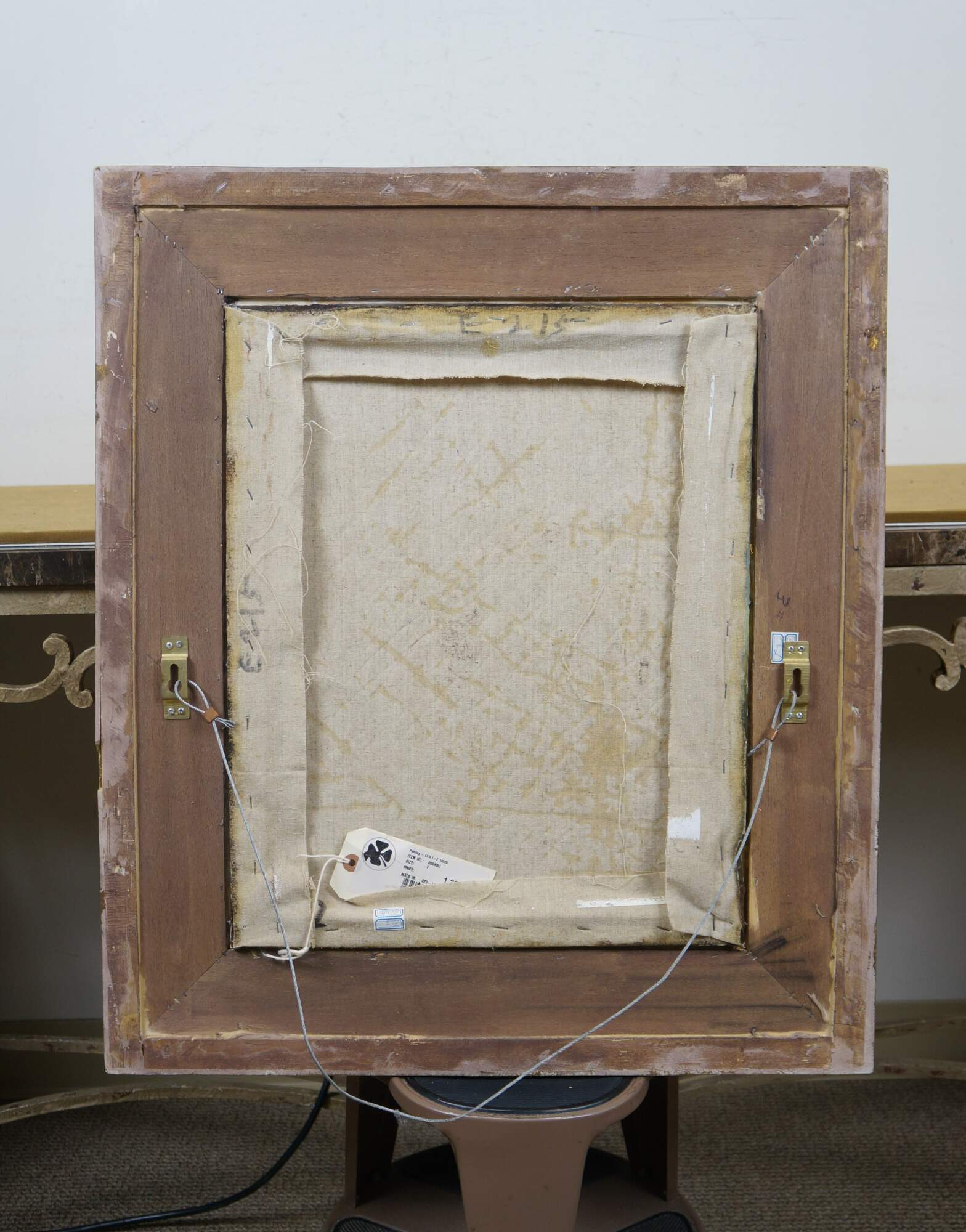 Late 20th century oil on linen painting after "Mr and Mrs William Hallett aka The Morning Walk" by Sir Thomas Gainsborough. "Mr. and Mrs. William Hallett (1785) also known as The Morning Walk is a double full-length portrait of William Hallett and Elizabeth Stephen, painted ahead of their wedding on July 30, 1785. The handsome young couple is seen arm-in-arm strolling on their morning walk with a Pomeranian sheepdog. They are dressed in elegant frocks, possibly their wedding clothes. This type of portrait, which presented the sitters in a natural setting dressed up in their finest garments, was fashionable among wealthy patrons in the late 18th century. Such paintings were a powerful status symbol, signifying the couple’s wealth and social status." (Wikiart) Signed, lower right. Gilt composite frame featuring a floral and scallop shell design.