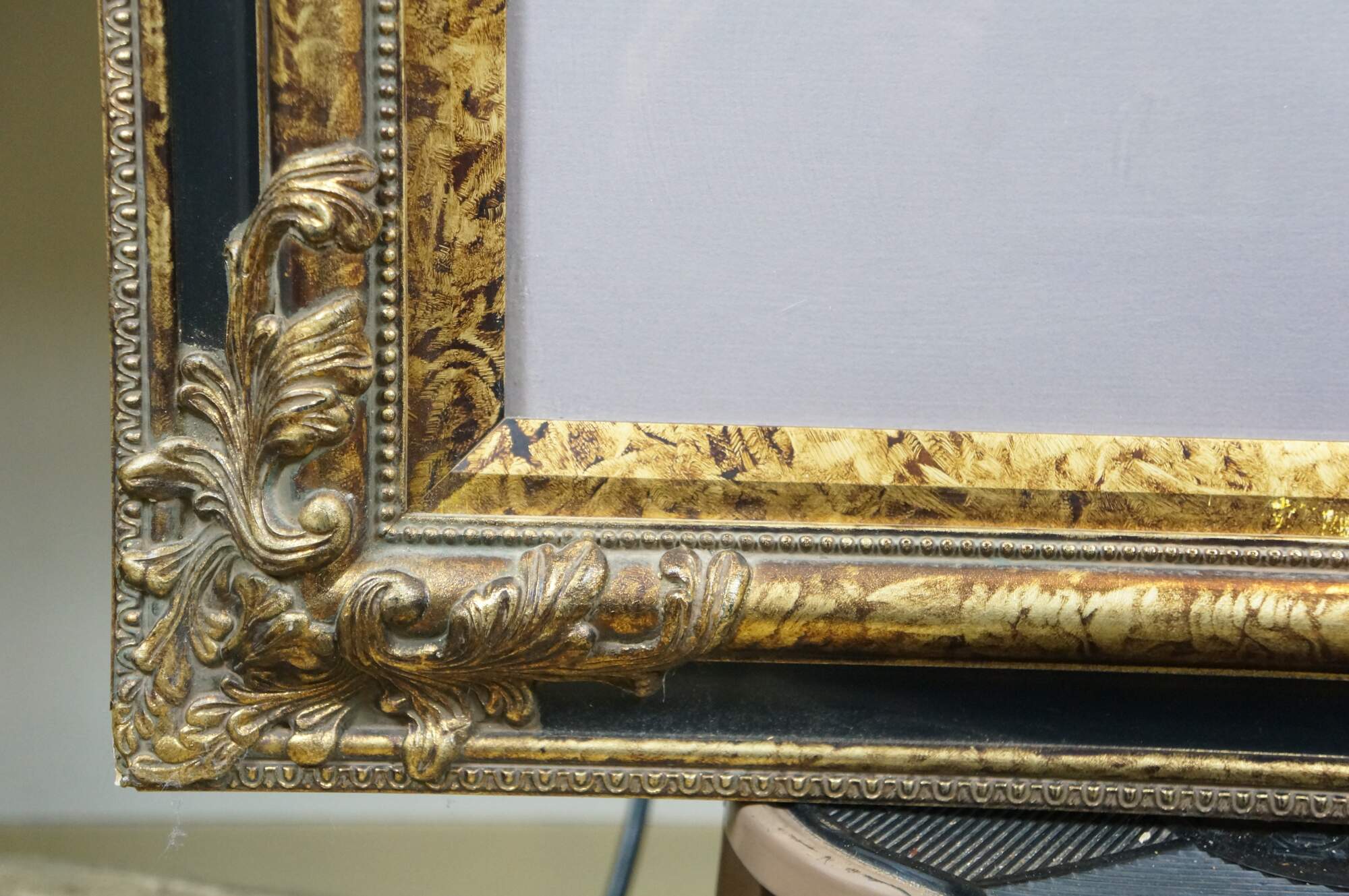 Late 19th century hand colored engraving depicting a portrait of King Edward VII by Charles Albert Waltner, circa late 1870s. Mottled gilt wood & composite frame with brown painted bevel and foliate corners.