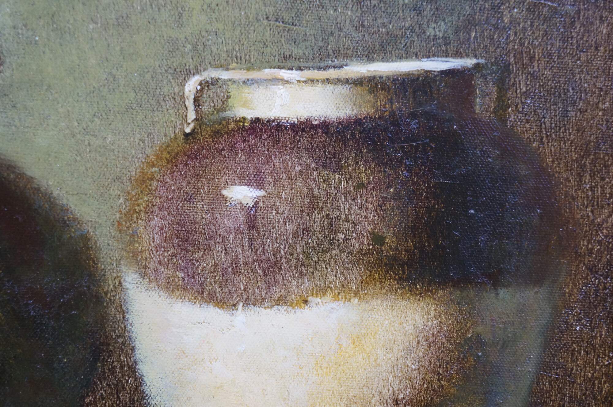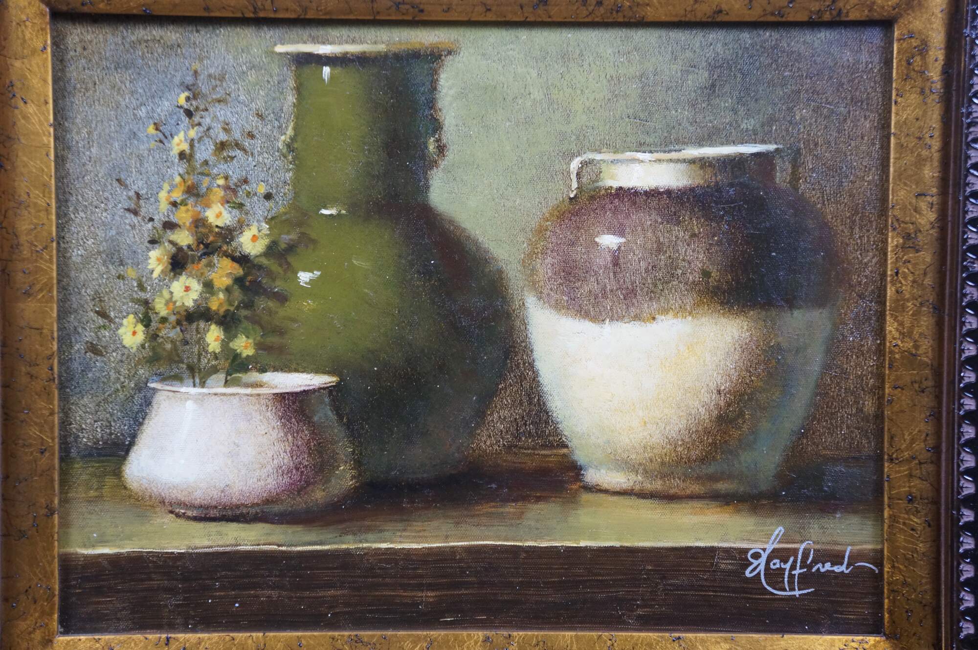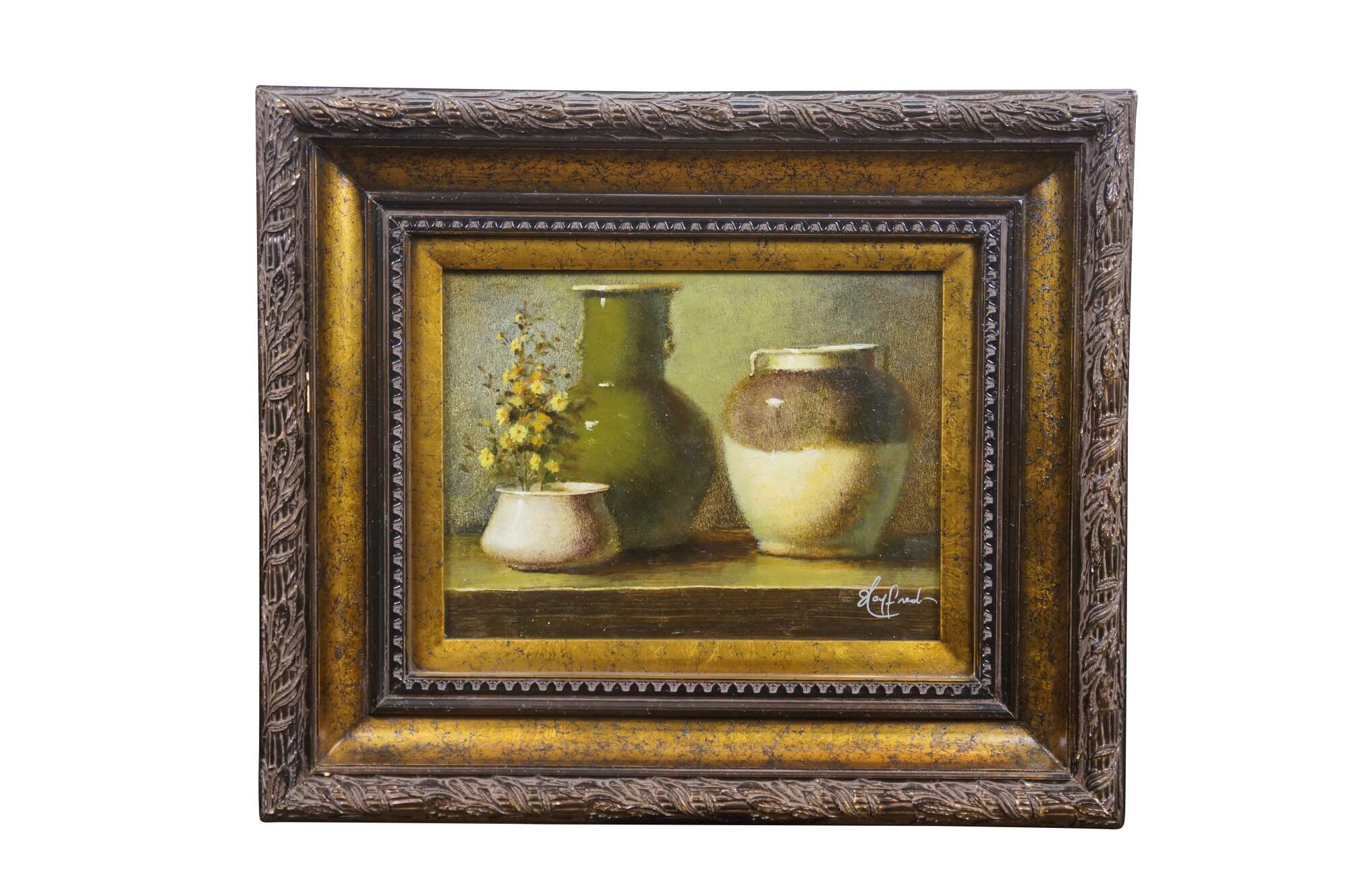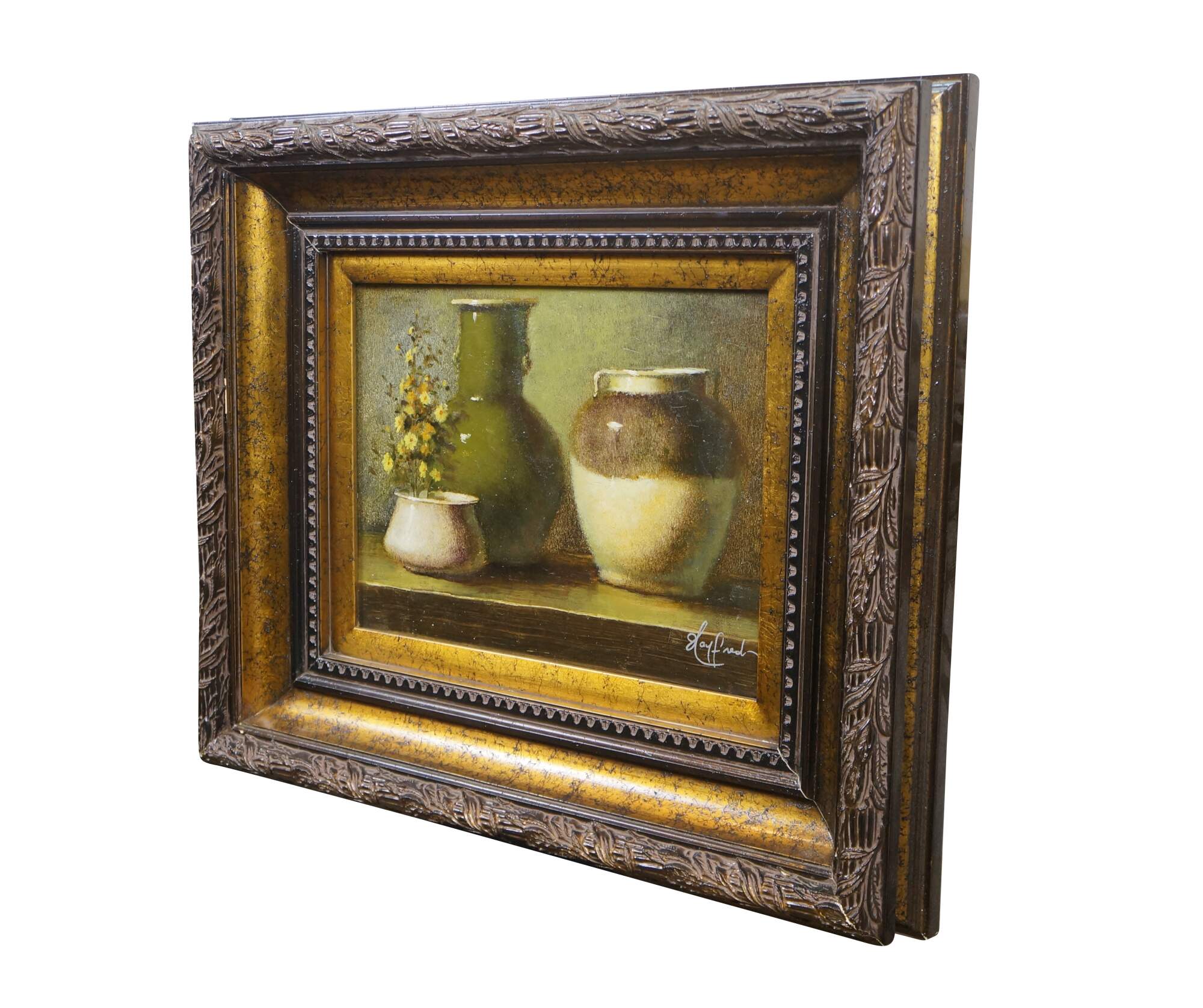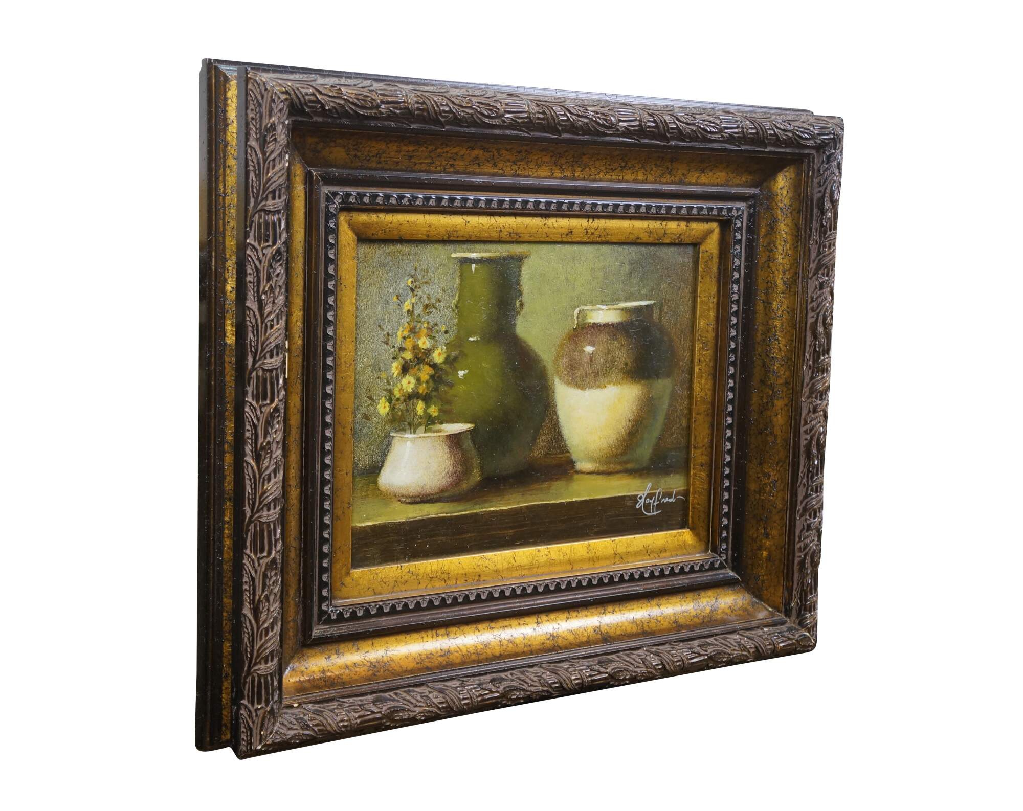 Late 20th century oil on canvas still life painting showing a brown and white crock, green vase, and white pot with yellow flowers on a table. Signed, lower right. Produced by Timeless Treasures. Certificate of Authenticity Number AFD131522. Wood & gesso frame with brown foliate and egg and dart borders and gilt bevel.