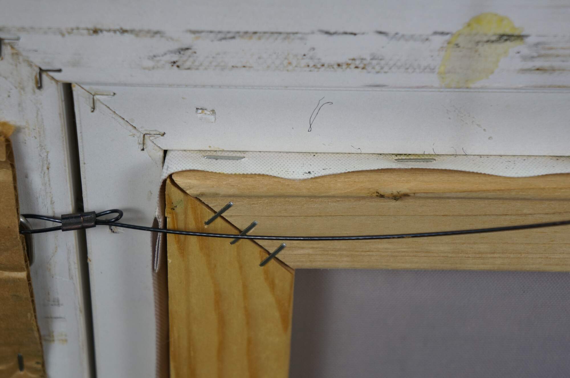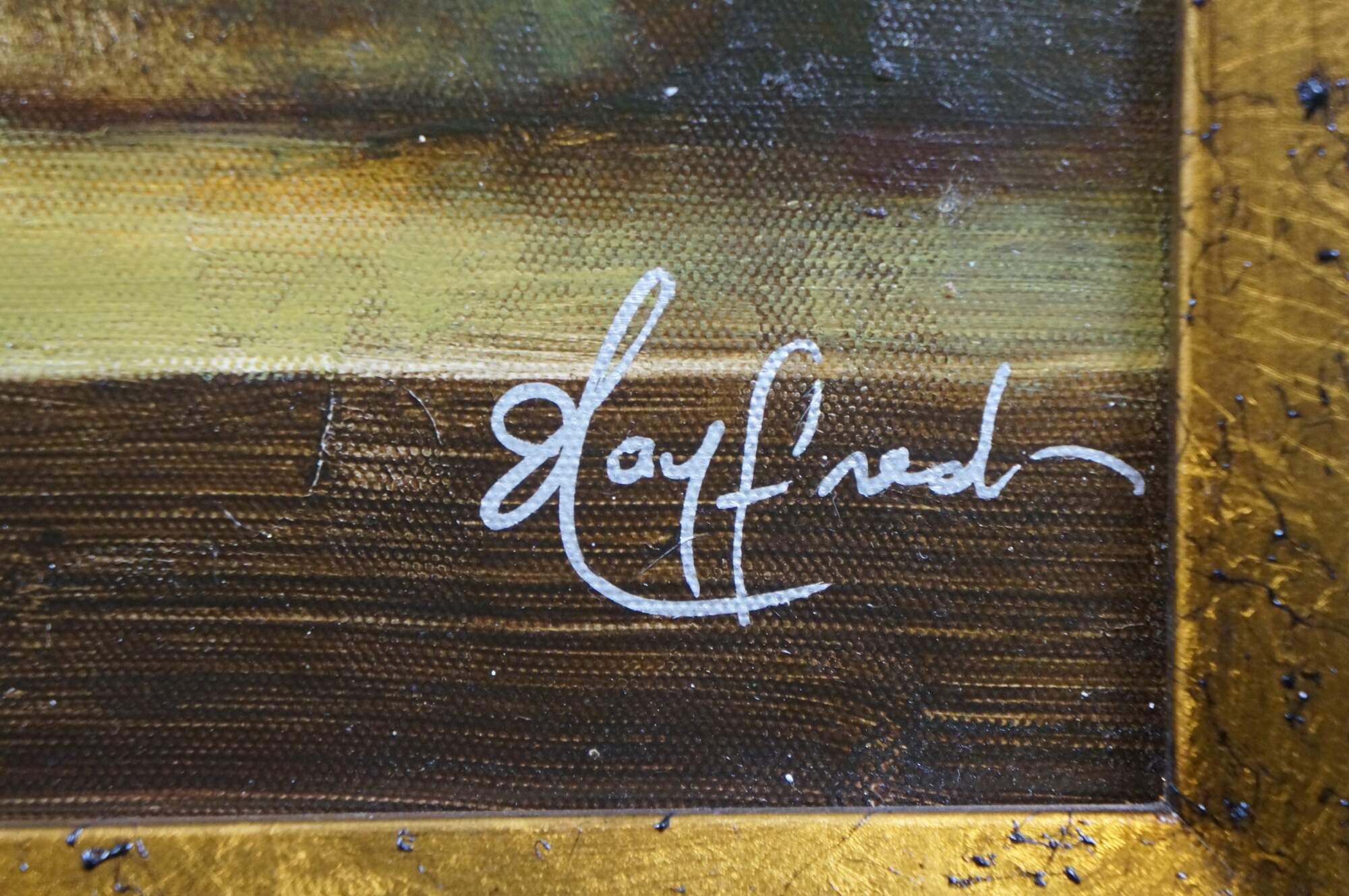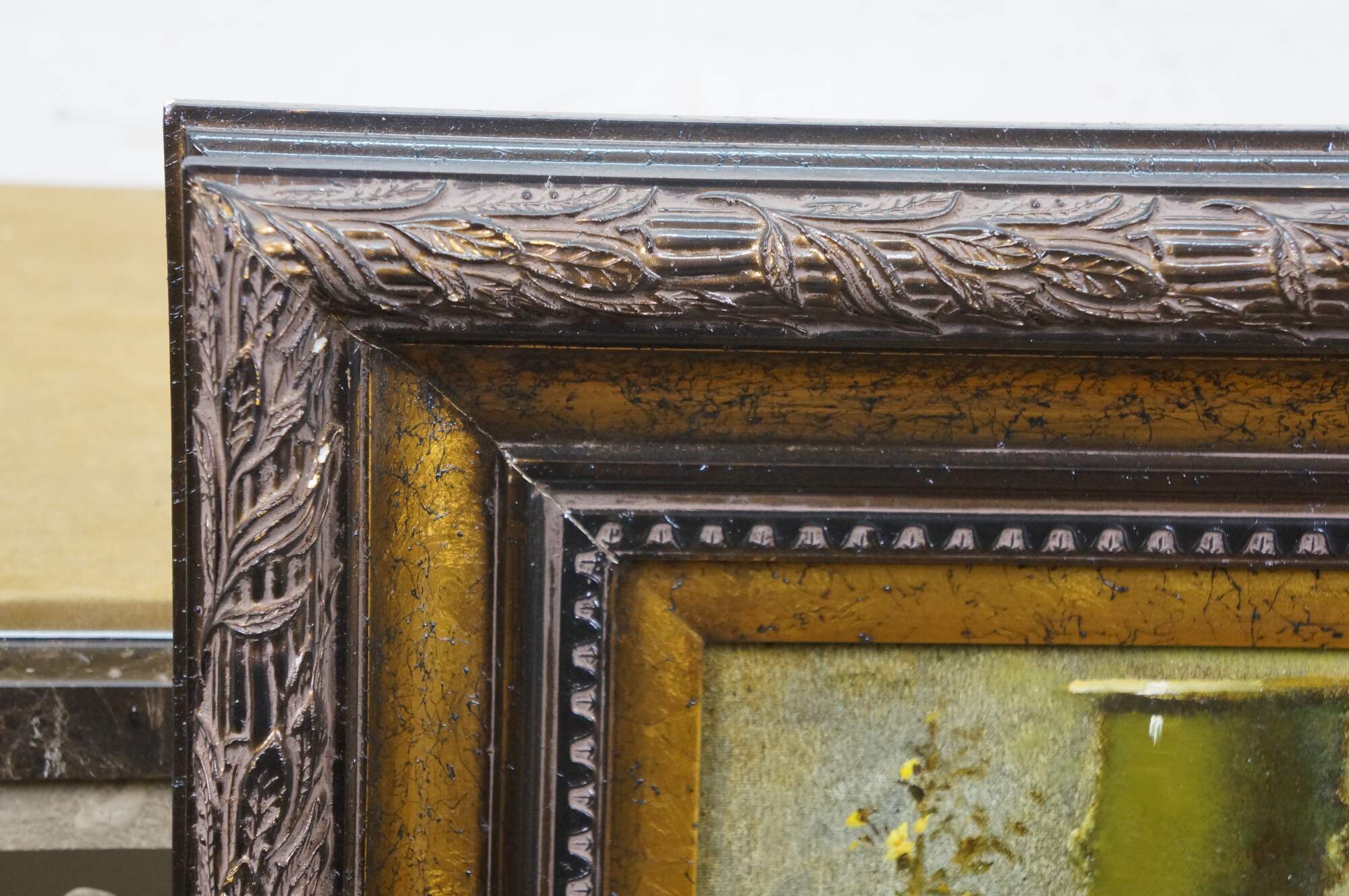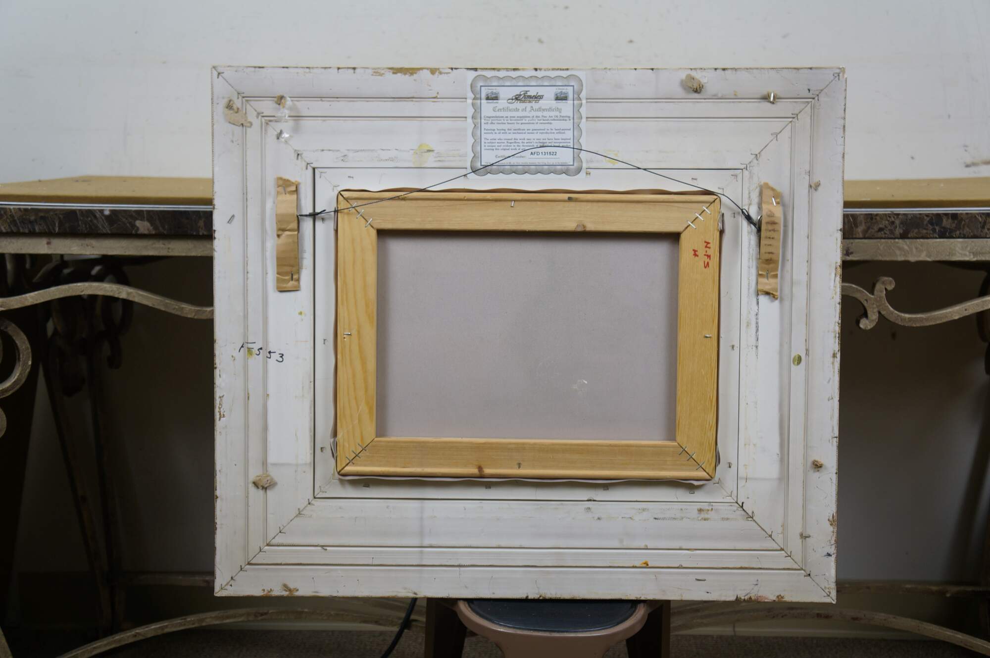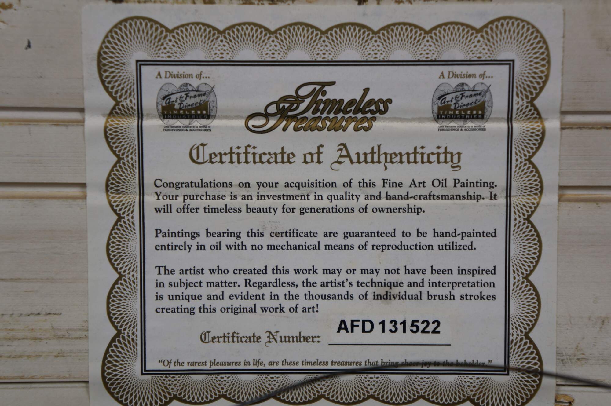 Late 20th century oil on canvas still life painting showing a brown and white crock, green vase, and white pot with yellow flowers on a table. Signed, lower right. Produced by Timeless Treasures. Certificate of Authenticity Number AFD131522. Wood & gesso frame with brown foliate and egg and dart borders and gilt bevel.