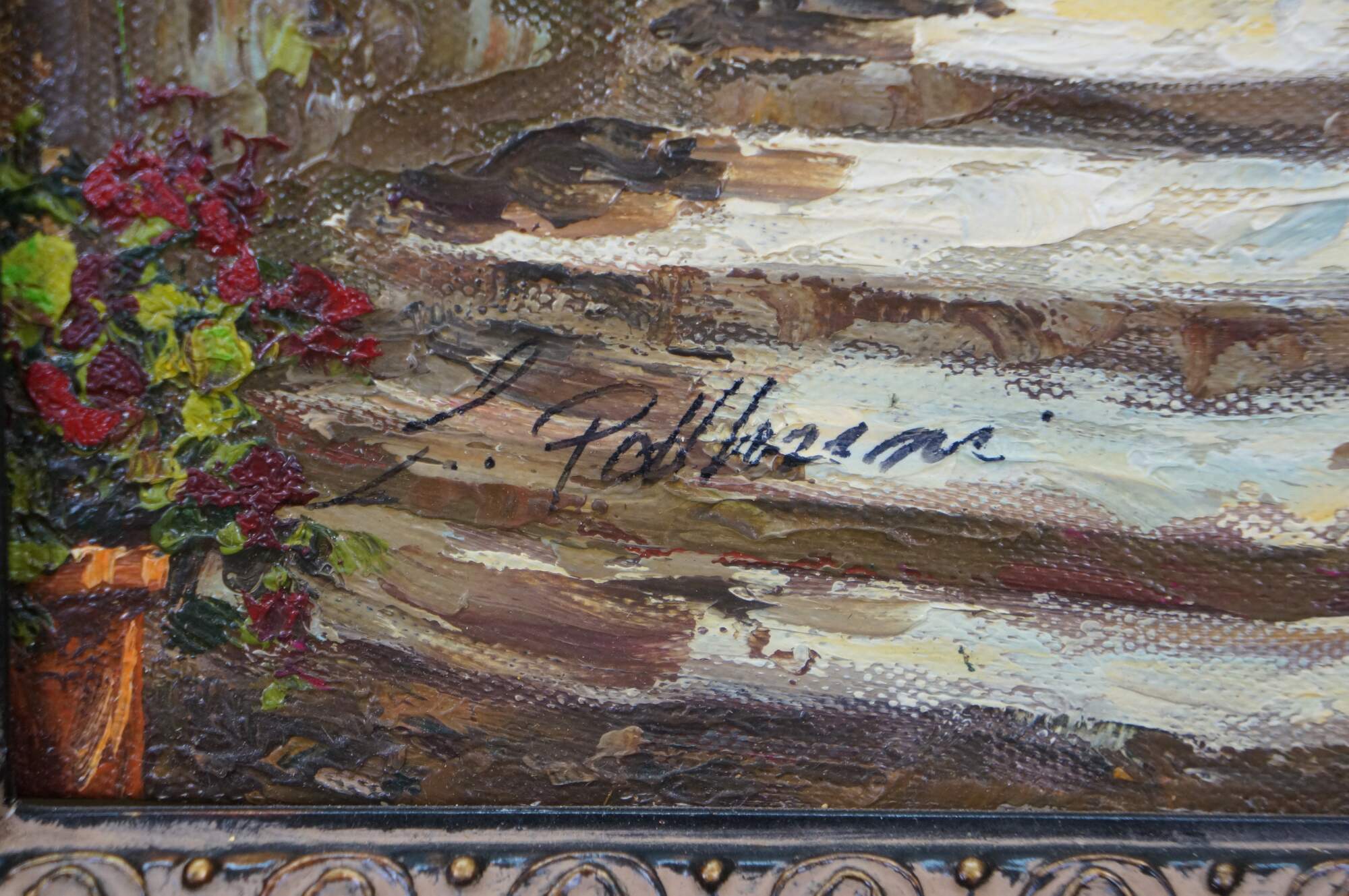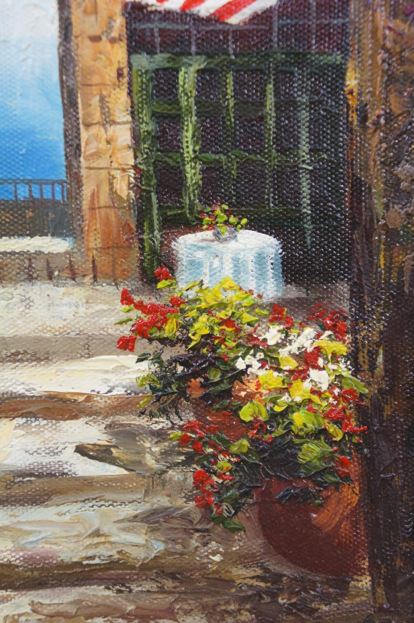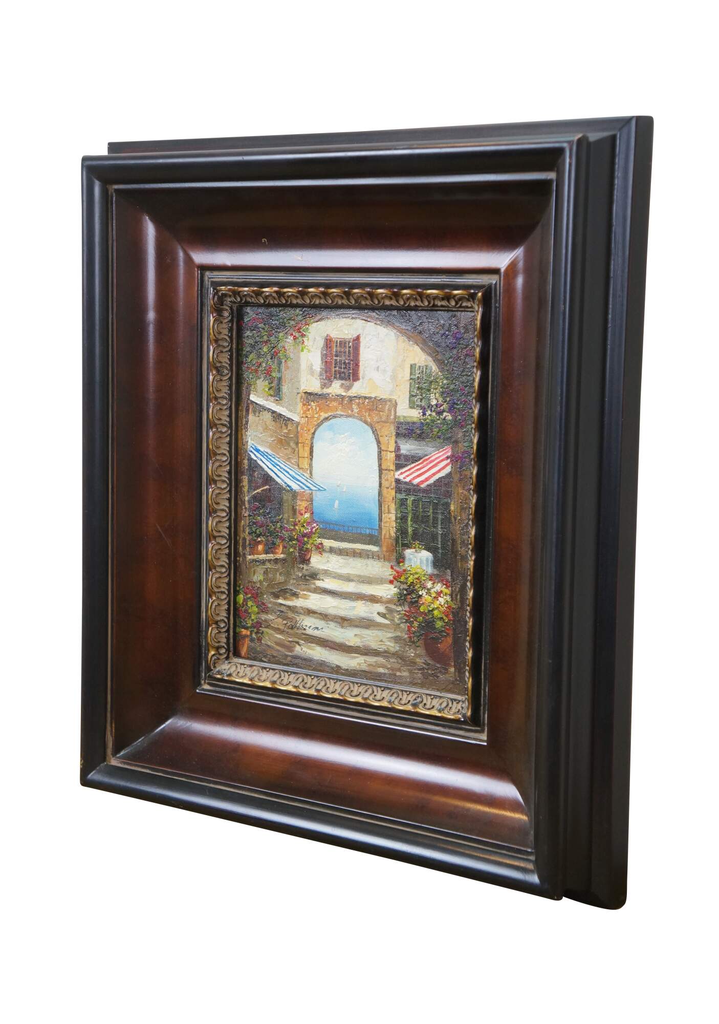 Late 20th century oil on canvas painting showing a Mediterranean courtyard with steps leading to an archway to a view of blue water dotted with sailboats. Signed, lower left. Produced for Timeless Treasures. Certificate of Authenticity Number AFD164440. Beveled wood tone composite frame with girl foliate detail.