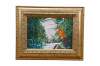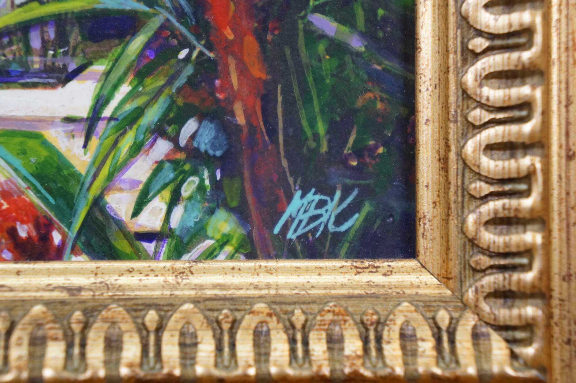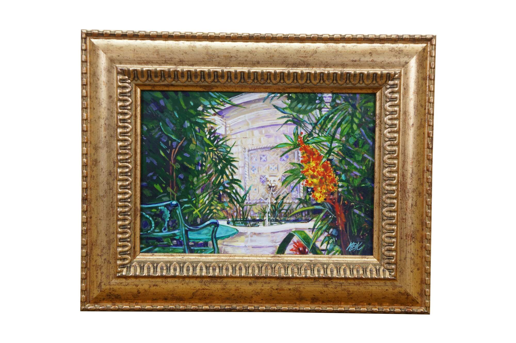 Late 20th century oil on board painting of a marble lion head fountain surrounded by tropical plants and a green bench. Signed MBK, lower right. Gilt composite frame with egg and dart border and beaded edge.