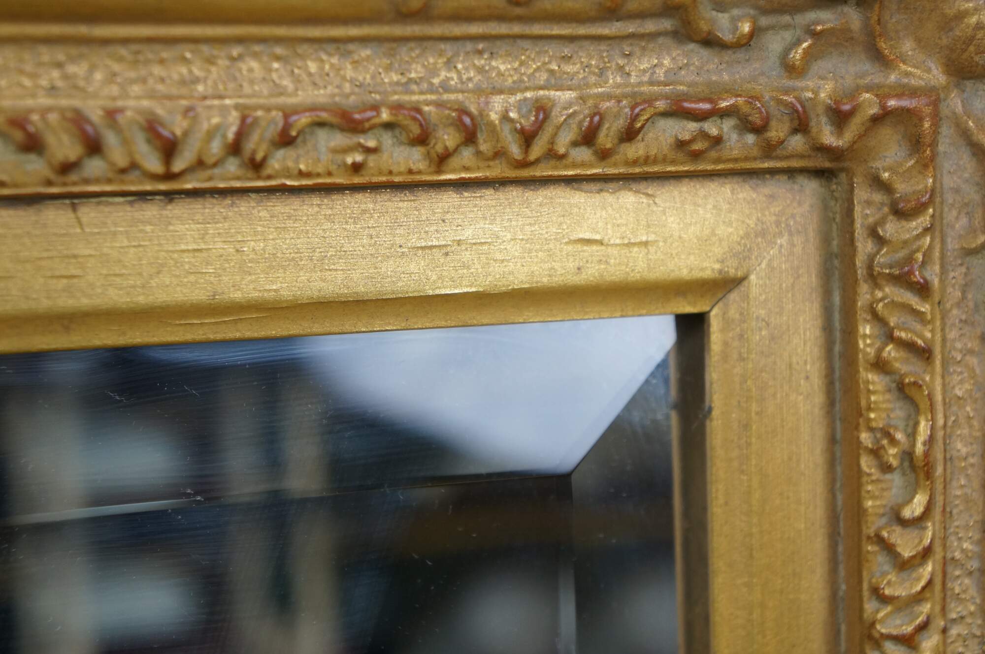 Late 20th century rectangular wall mirror with beveled glass. Gilt French baroque / rococo composite frame with foliate vines and scallop shell corners.