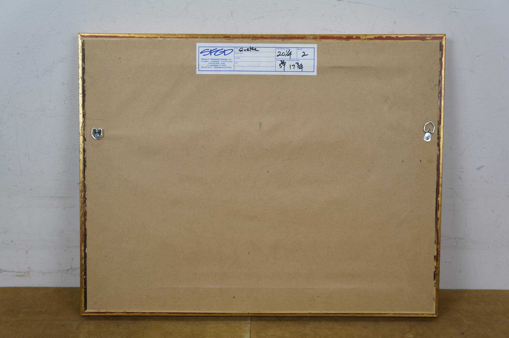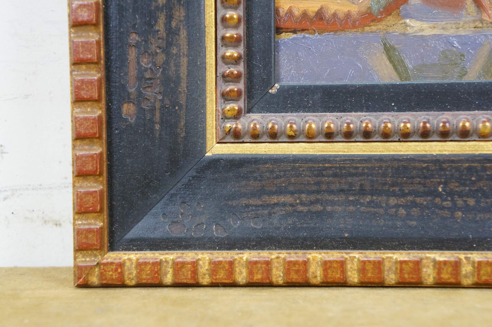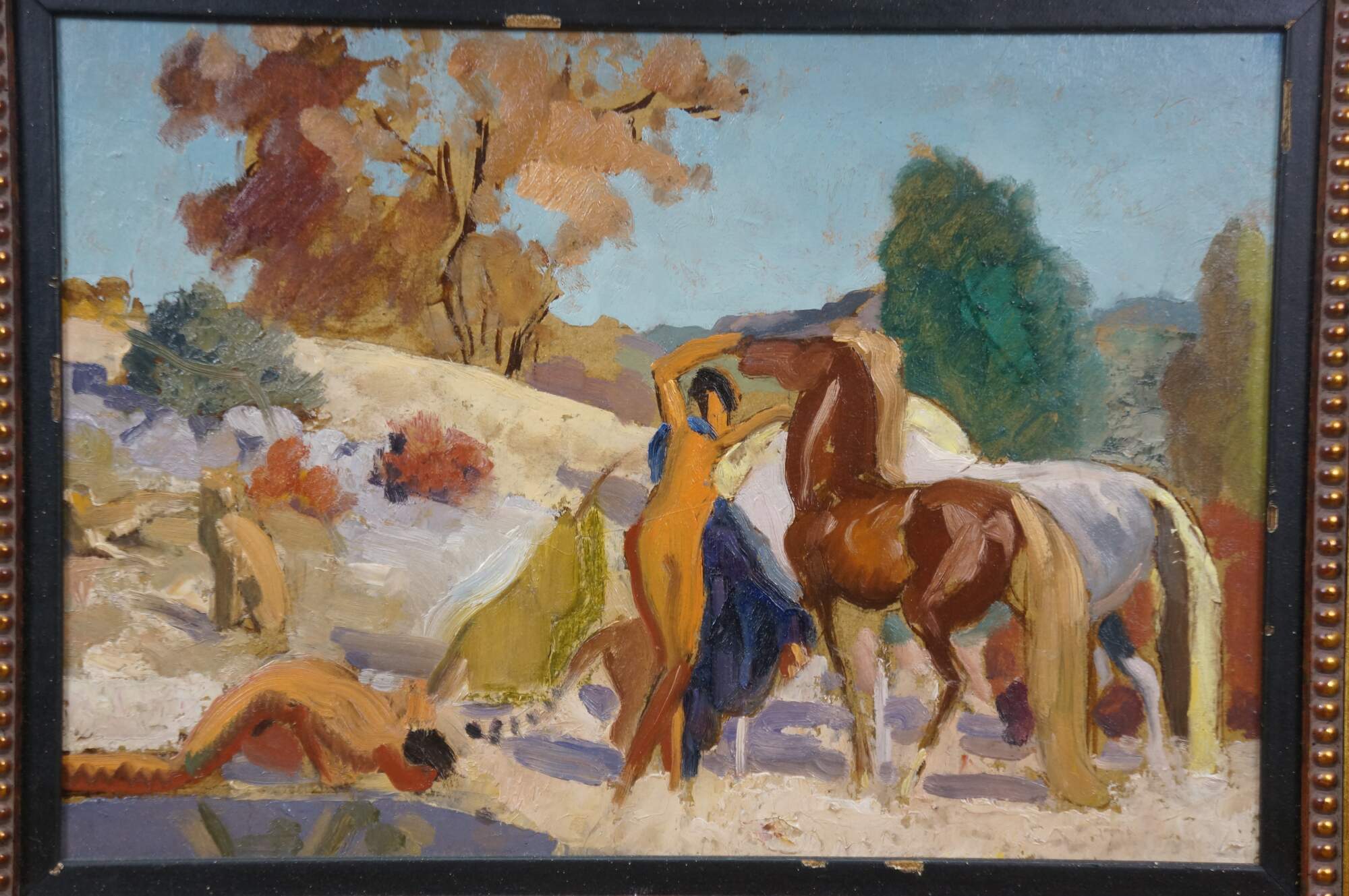 Late 20th century oil painting on board styled after "Les Dioscures (The Dioscuri)" by Robert Eugène Pougheon. An impressionist / expressionist landscape showing Castor and Pollox, two sons of Zeus at a watering hole with horses and other animals. Black and gilt composite frame with beaded edges.