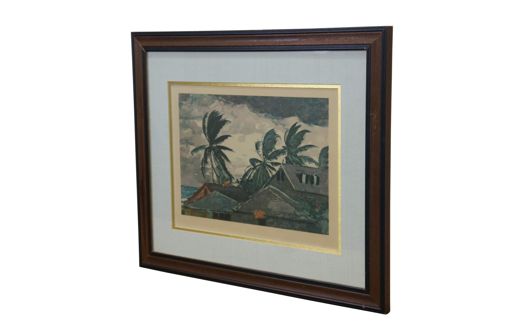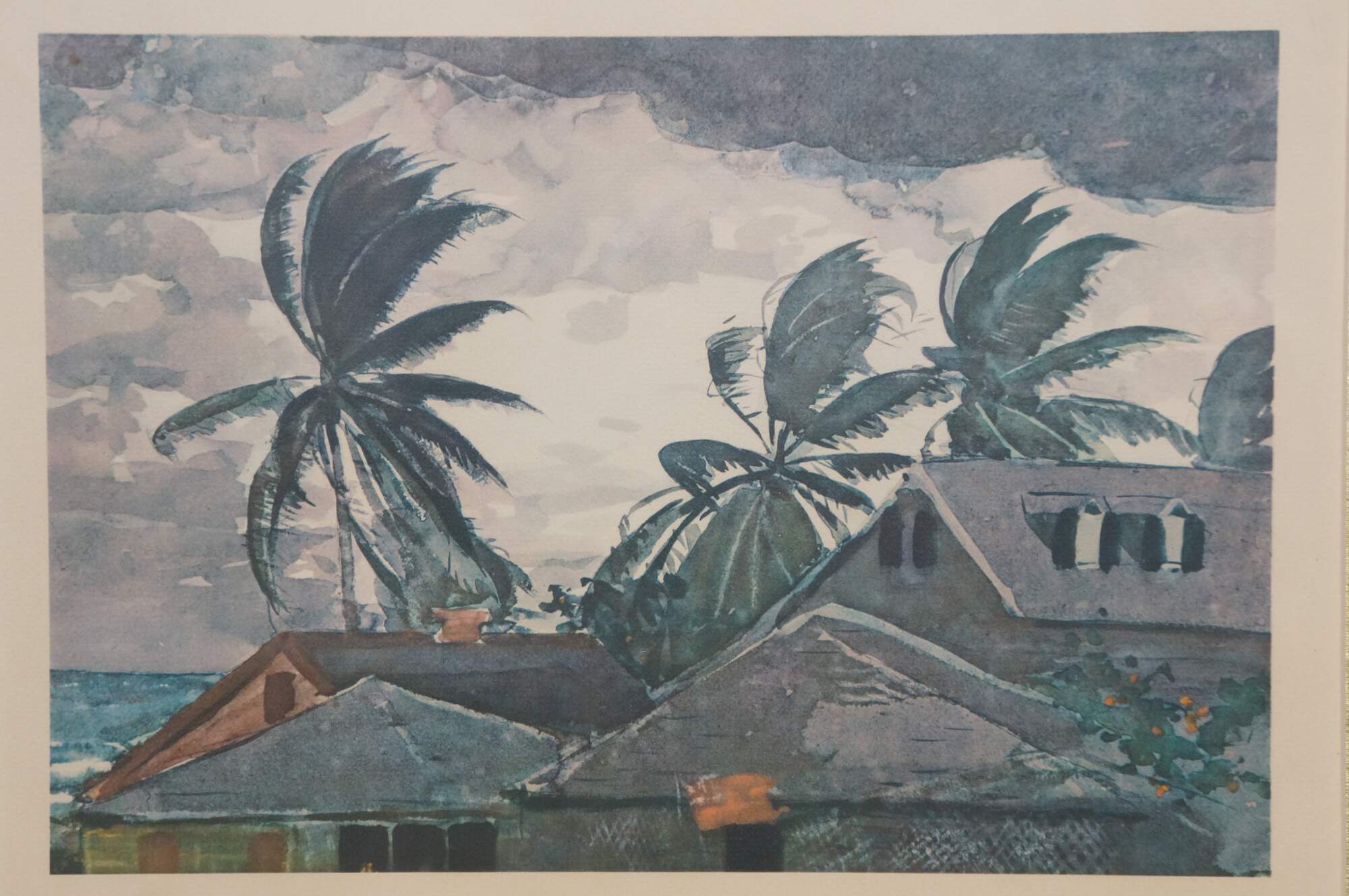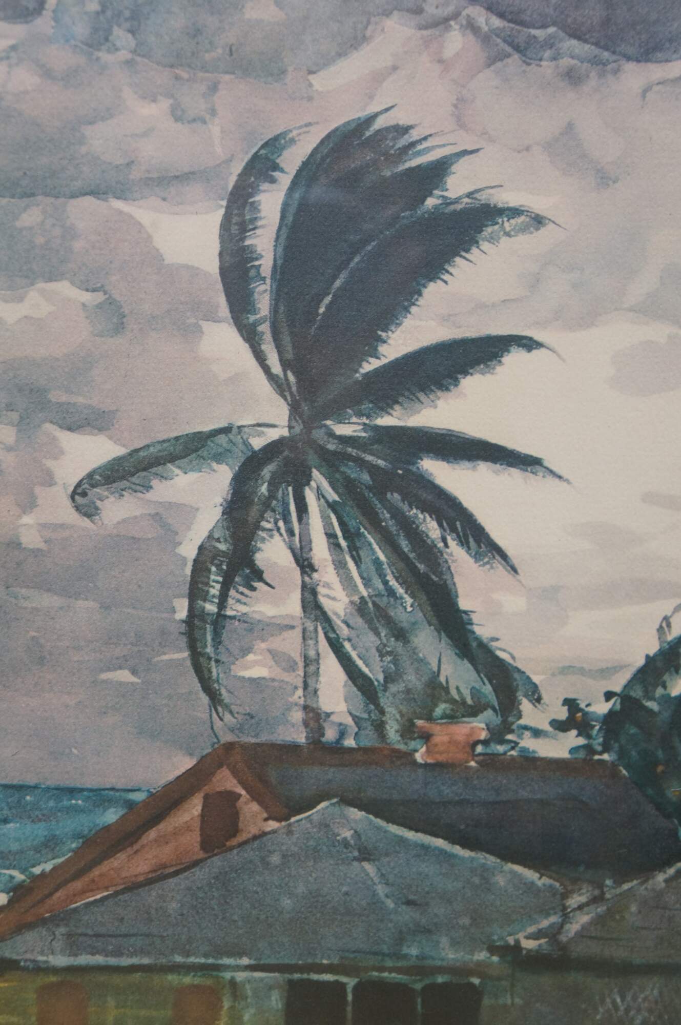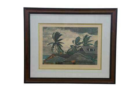 Vintage print after an original watercolor painting titled (Hurricane, Bahamas) created by American artist Winslow Homer in 1898. Winslow Homer (1836–1910) painted this scene during a period when he was deeply absorbed by the power of the sea. The painting captures the dramatic atmosphere of a storm approaching, with palm trees bending under strong winds over coastal houses in the Bahamas.