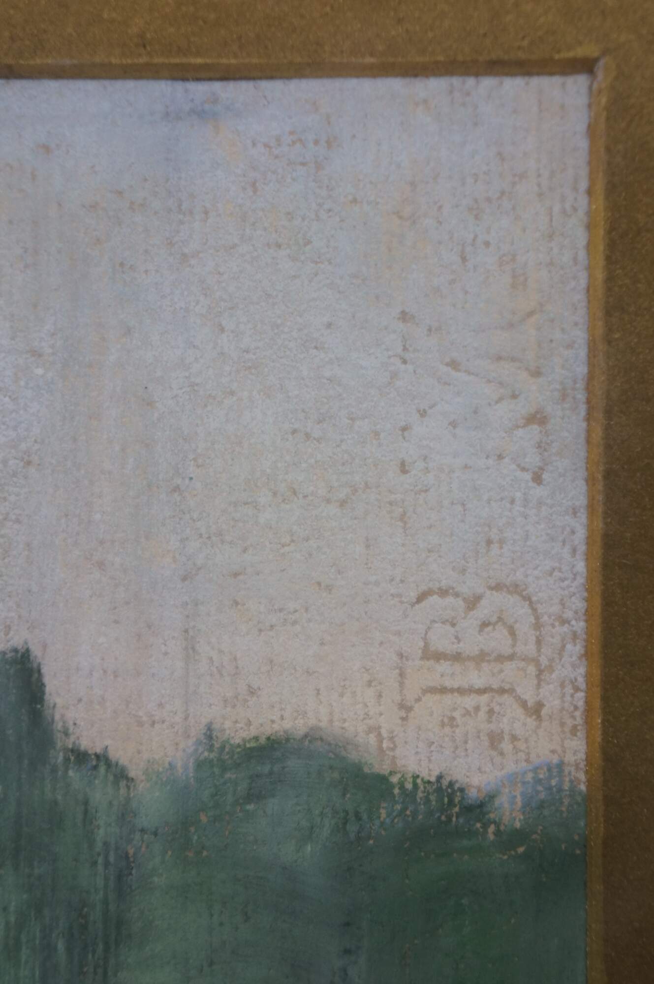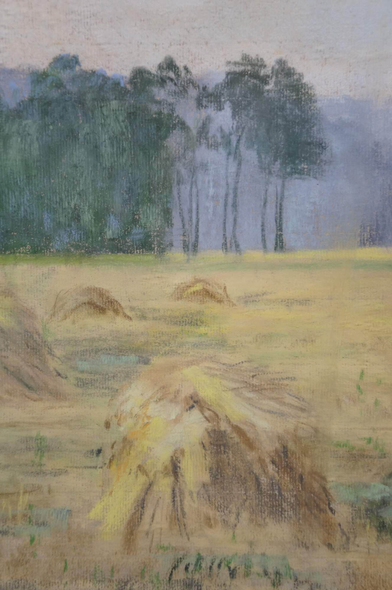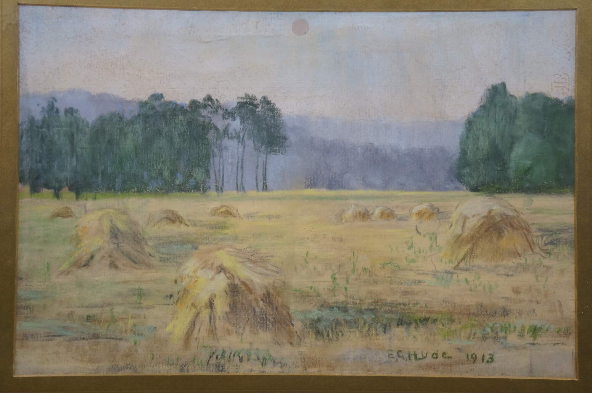 Antique 1913 Emily G. Hyde impressionist pastel on paper painting featuring a rural Indiana country farm / field landscape with haystacks / bales or sheaves under a hazy sky. Gold gesso frame.