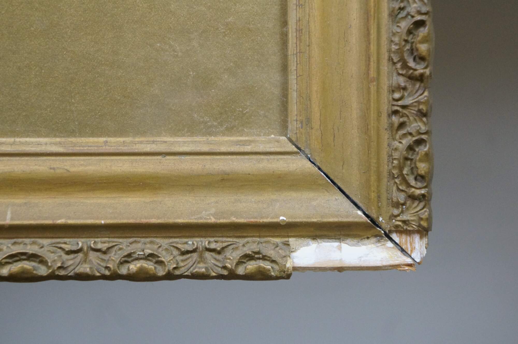 Wear and distressing from age, repair to canvas, finish loss, trim damage to frame, splitting / crazing.