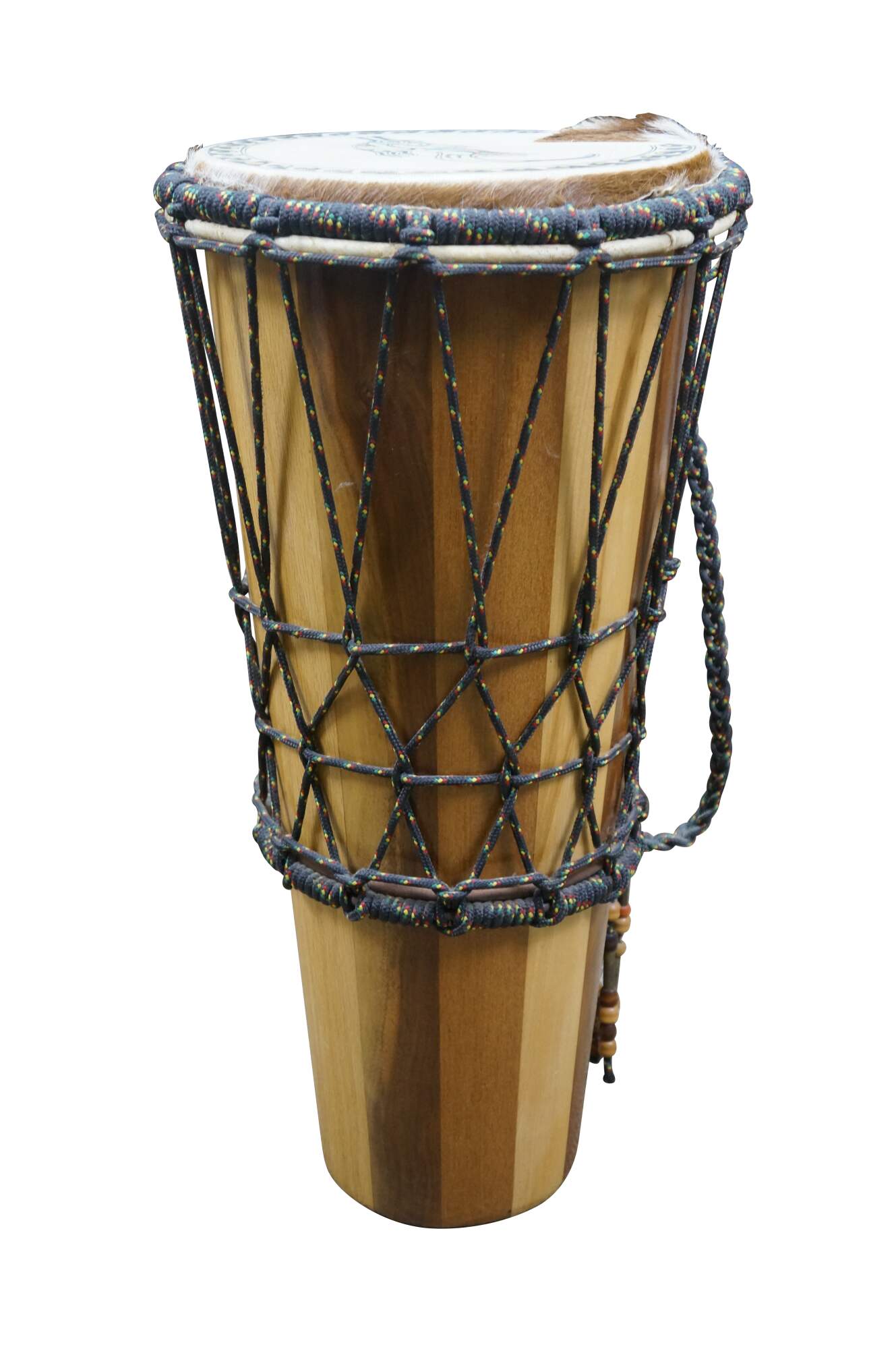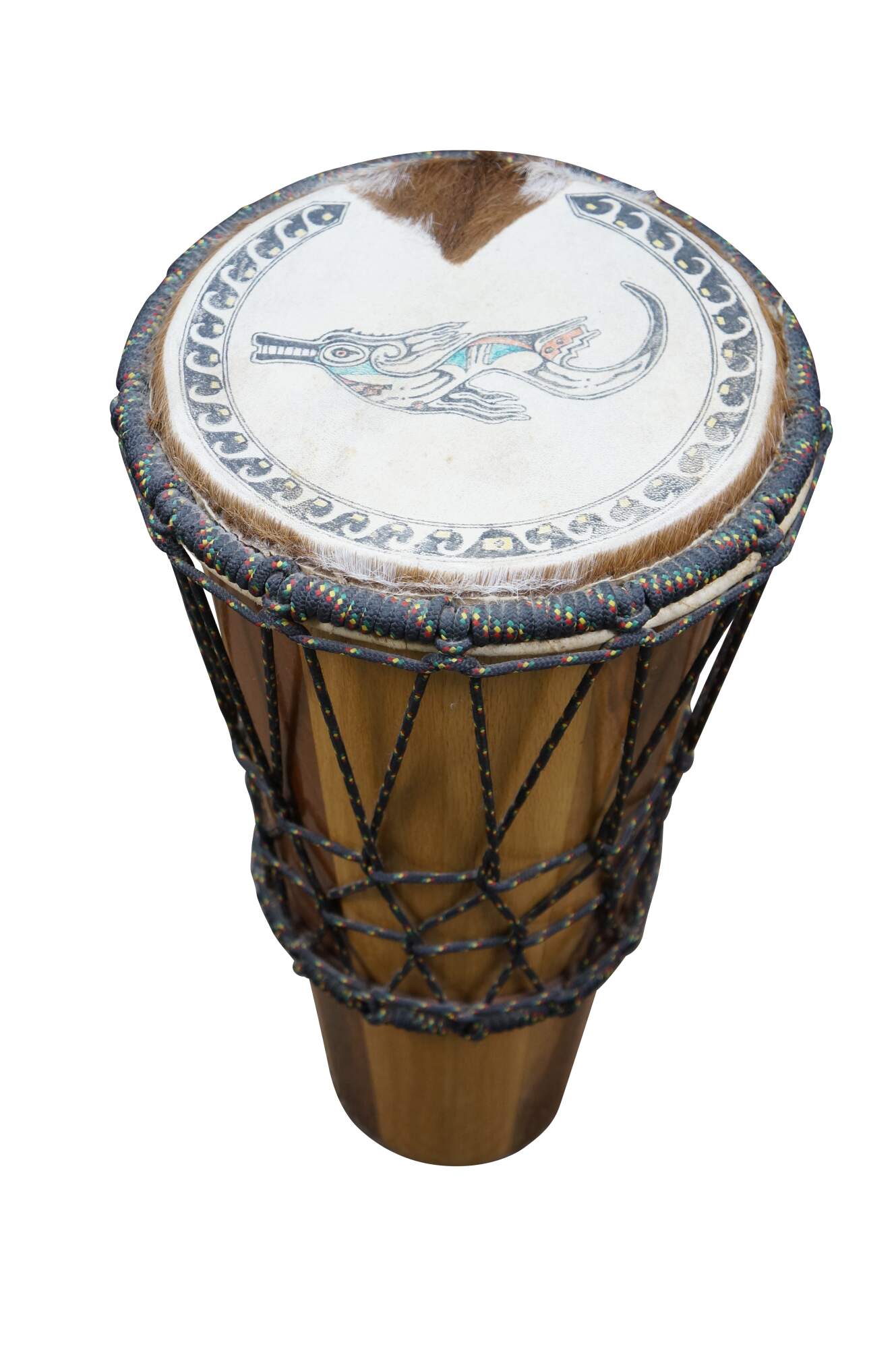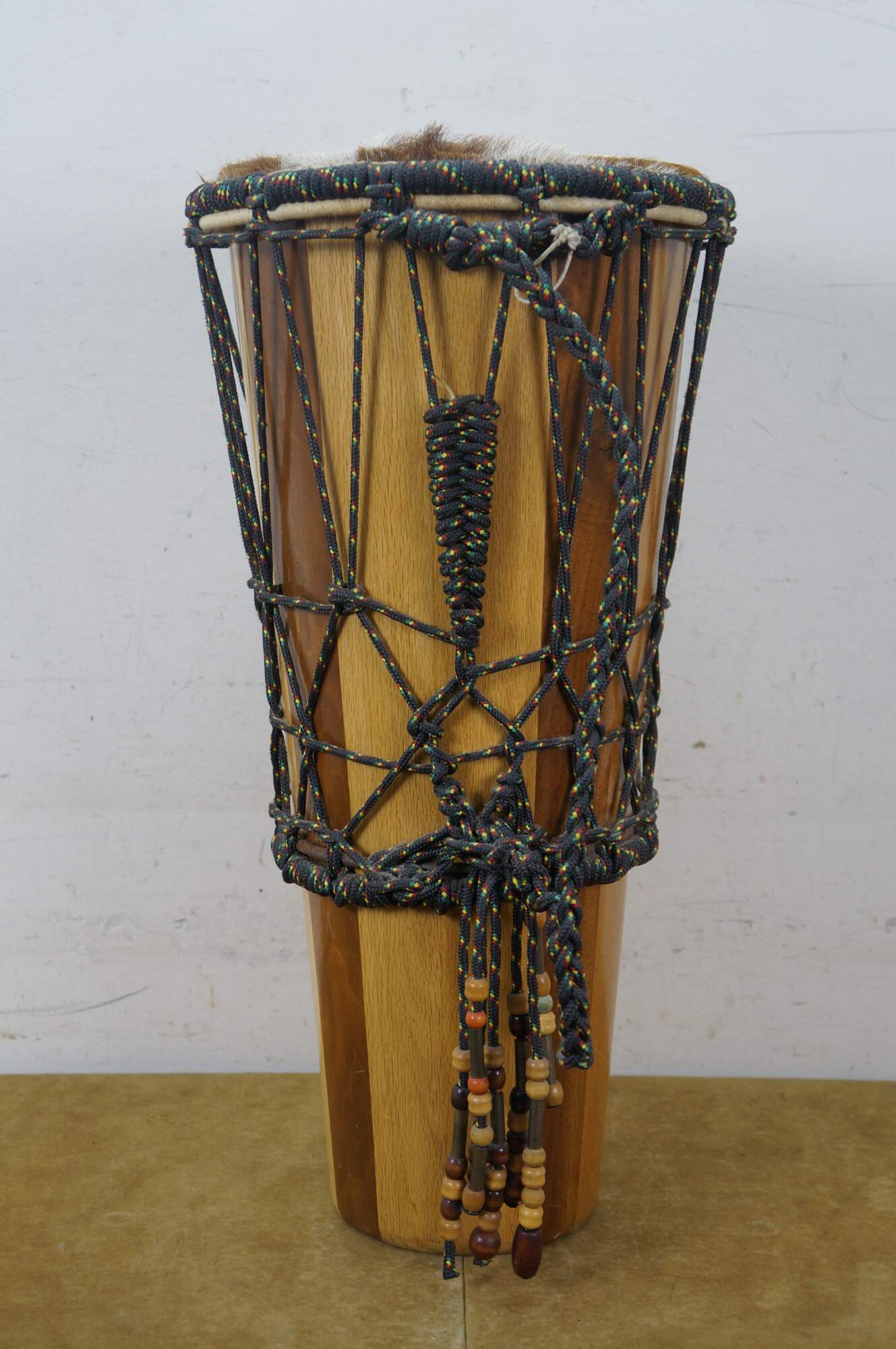 Late 20th century ashiko drum - tapered body of multi-toned panels of hardwood, toped with an 10" goat skin head, painted with folk art / tribal wave and animal design, bound with black speckled paracord.