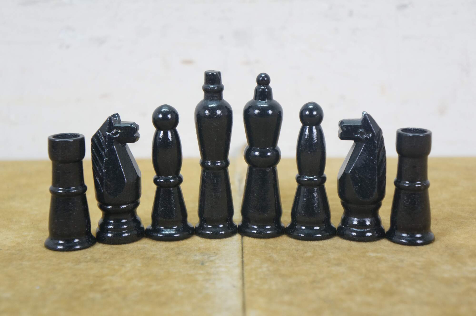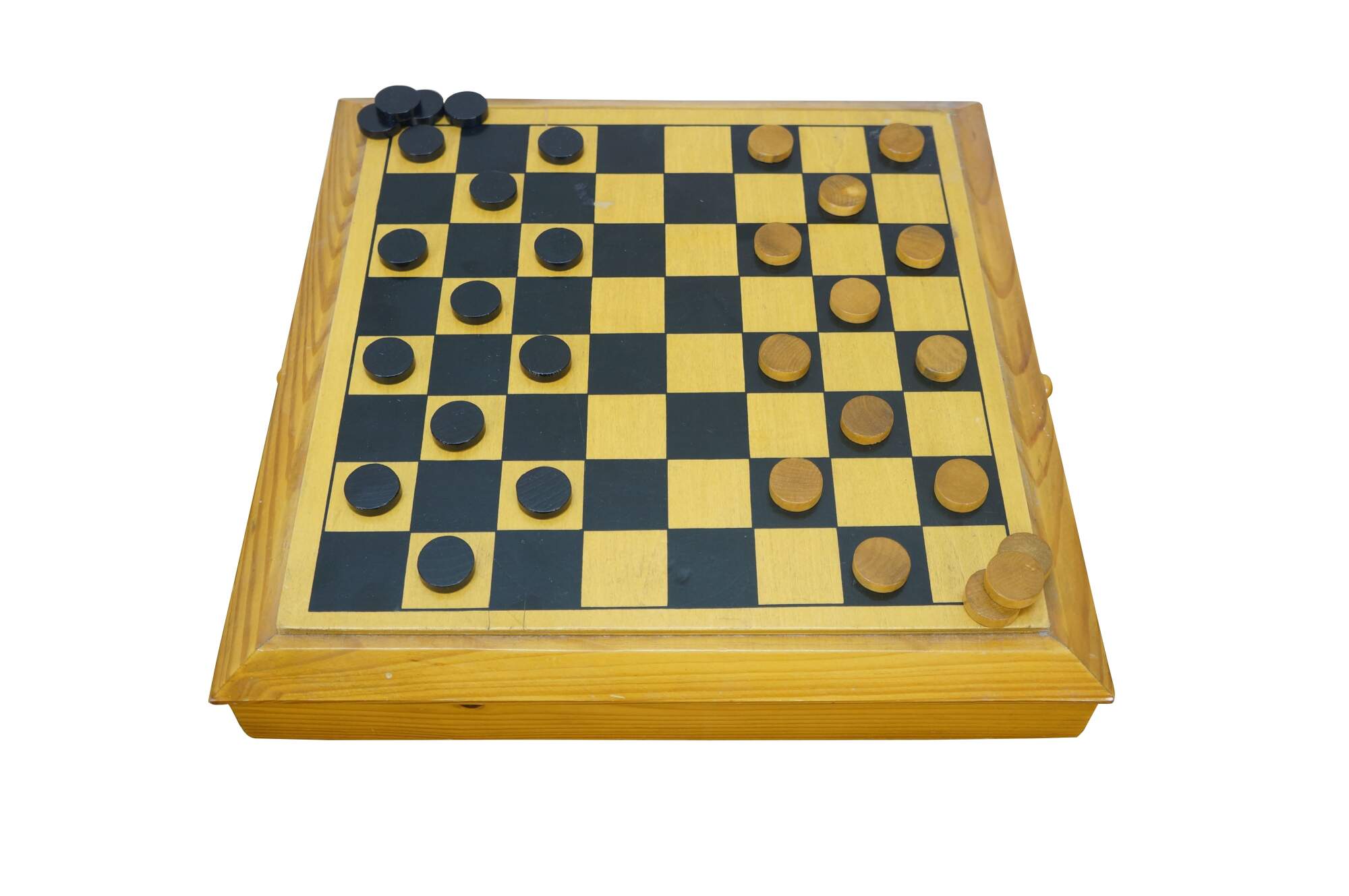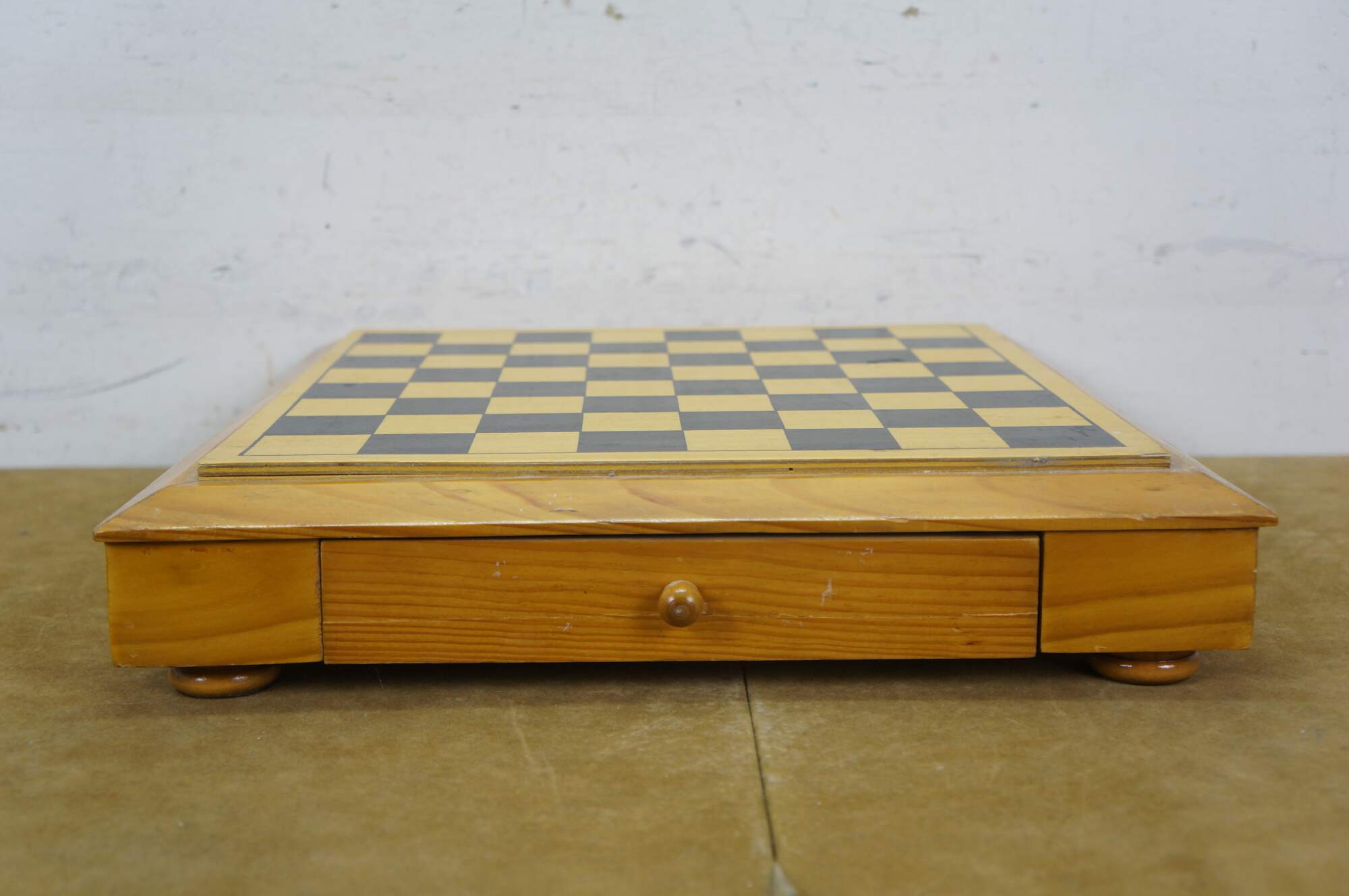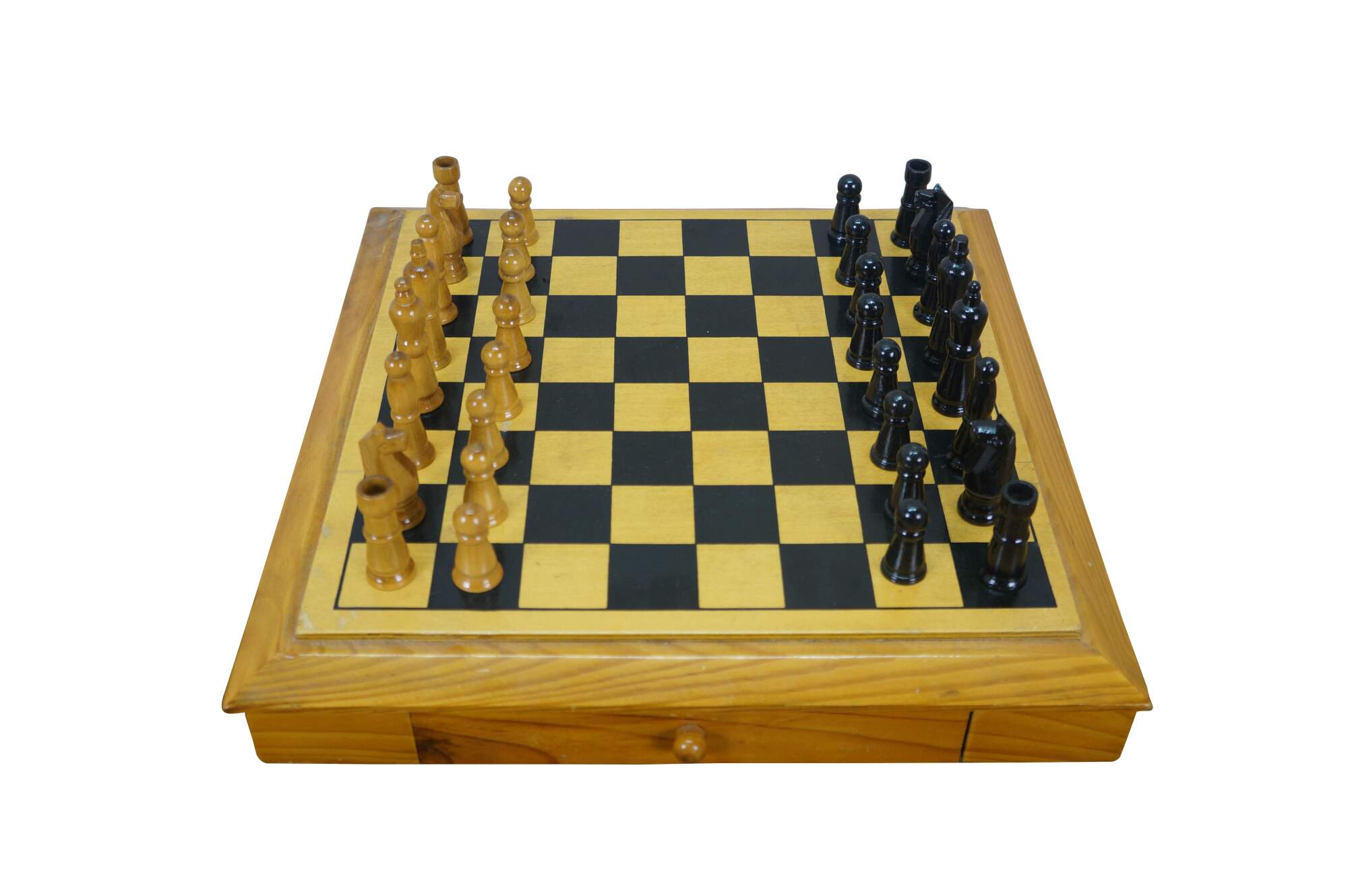 Late 20th century wooden tabletop chess board in black and natural wood tone, with two storage drawers. Includes a full 32 piece set of small wooden chess pieces and 31 checkers (possibly original to the board). Also includes a full set plus a spare Queen for each side of larger chess pieces with felted bases.