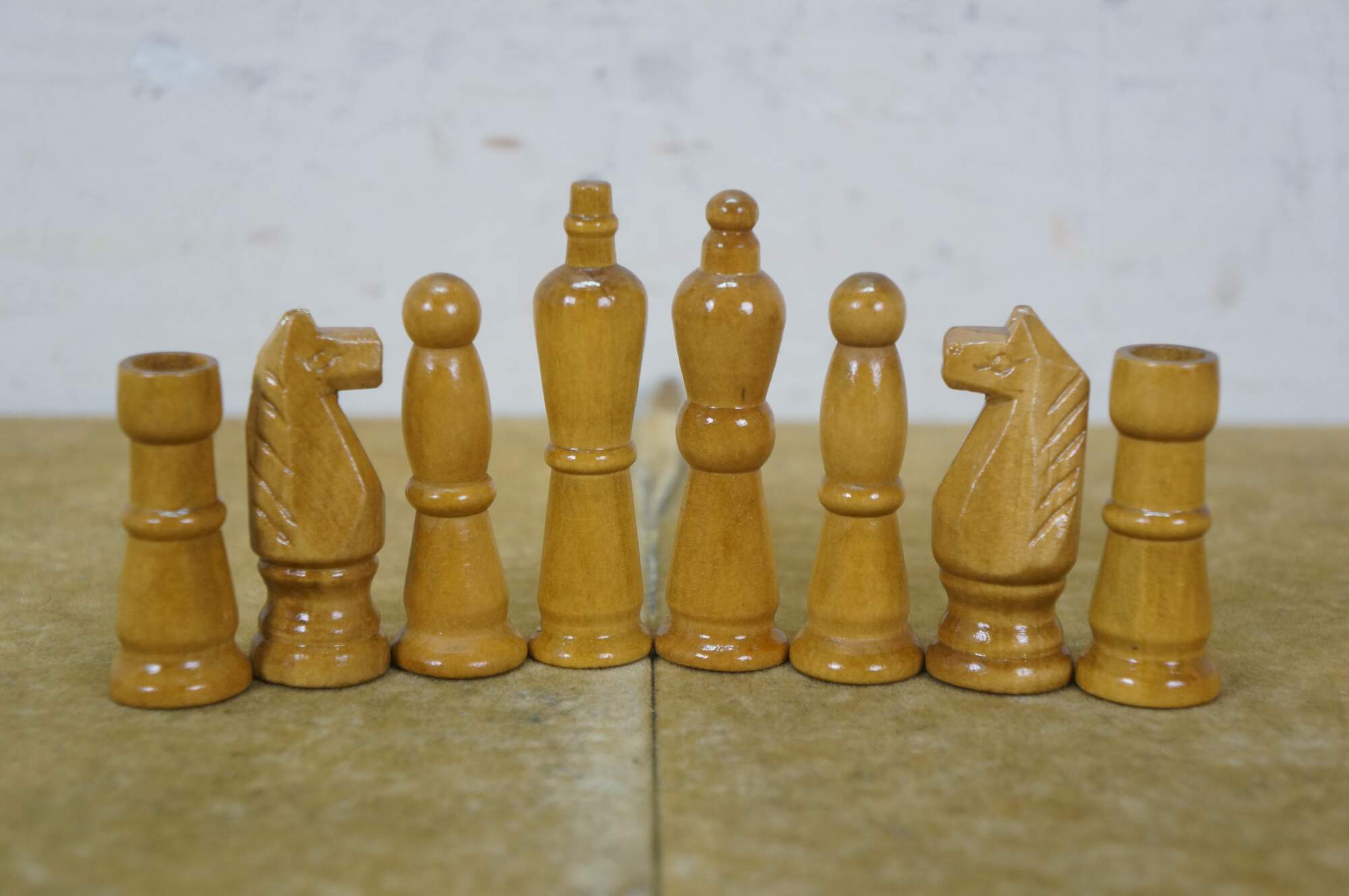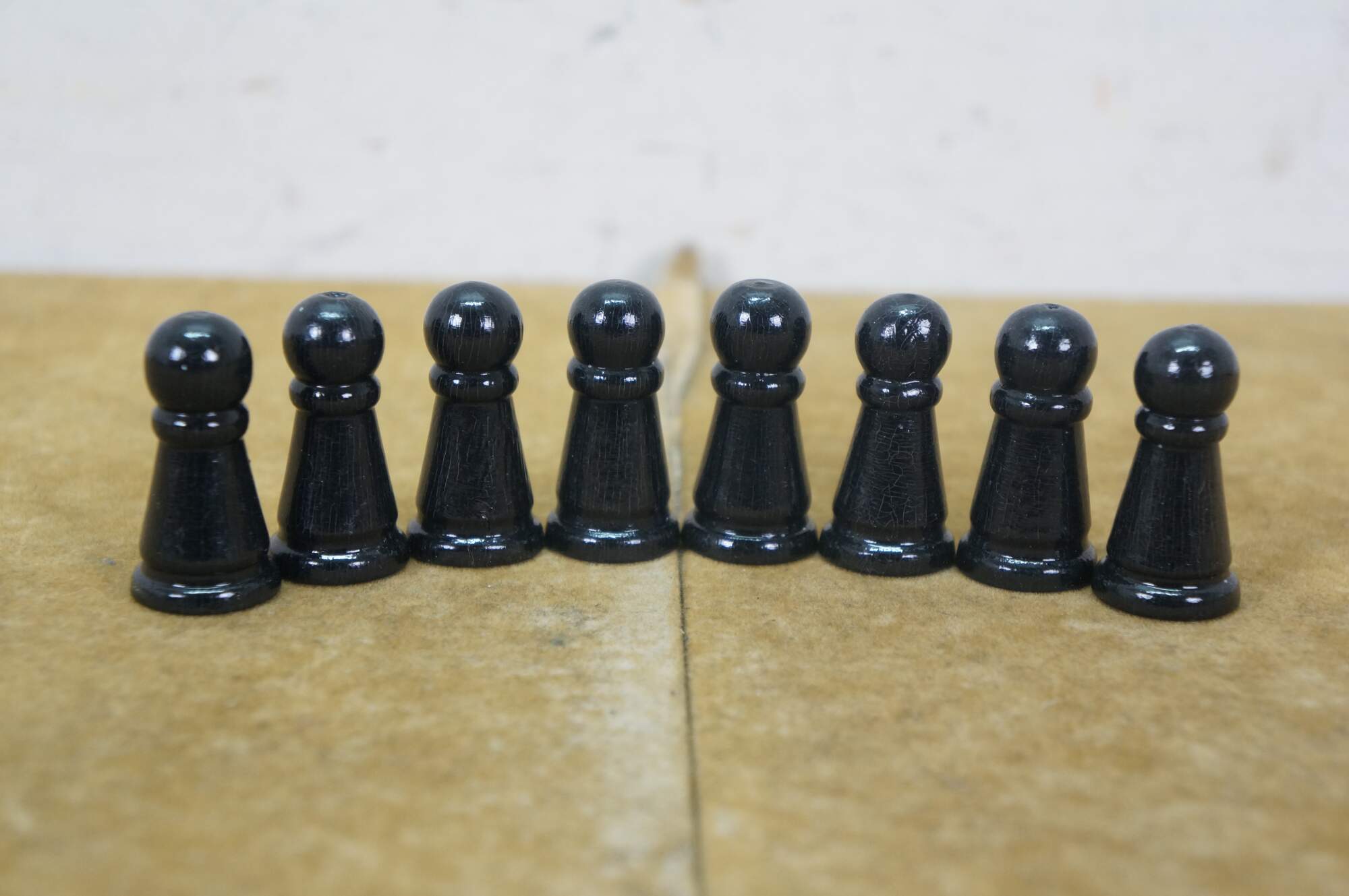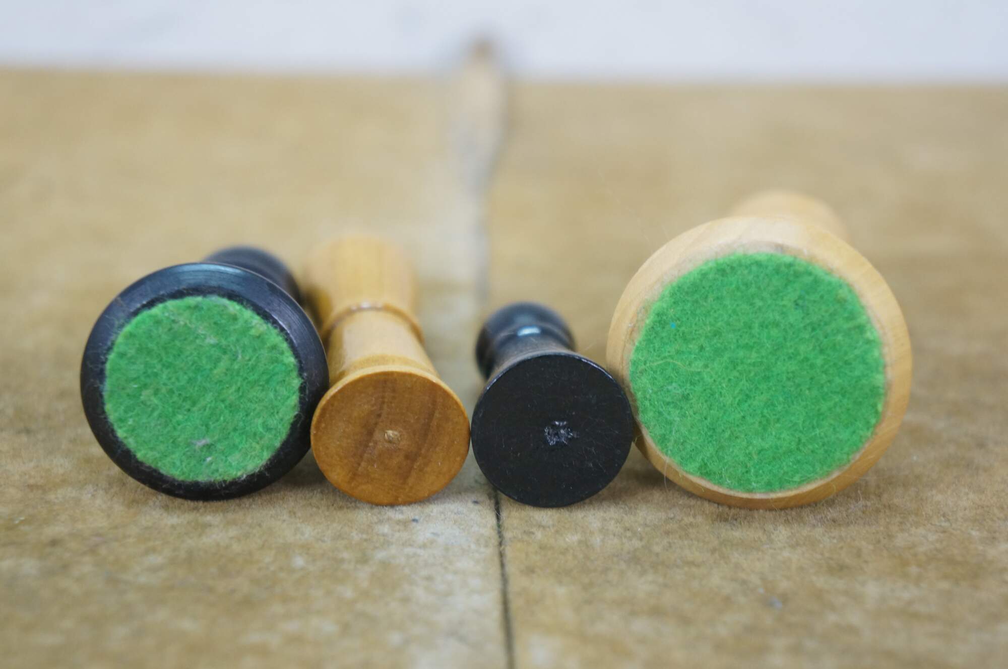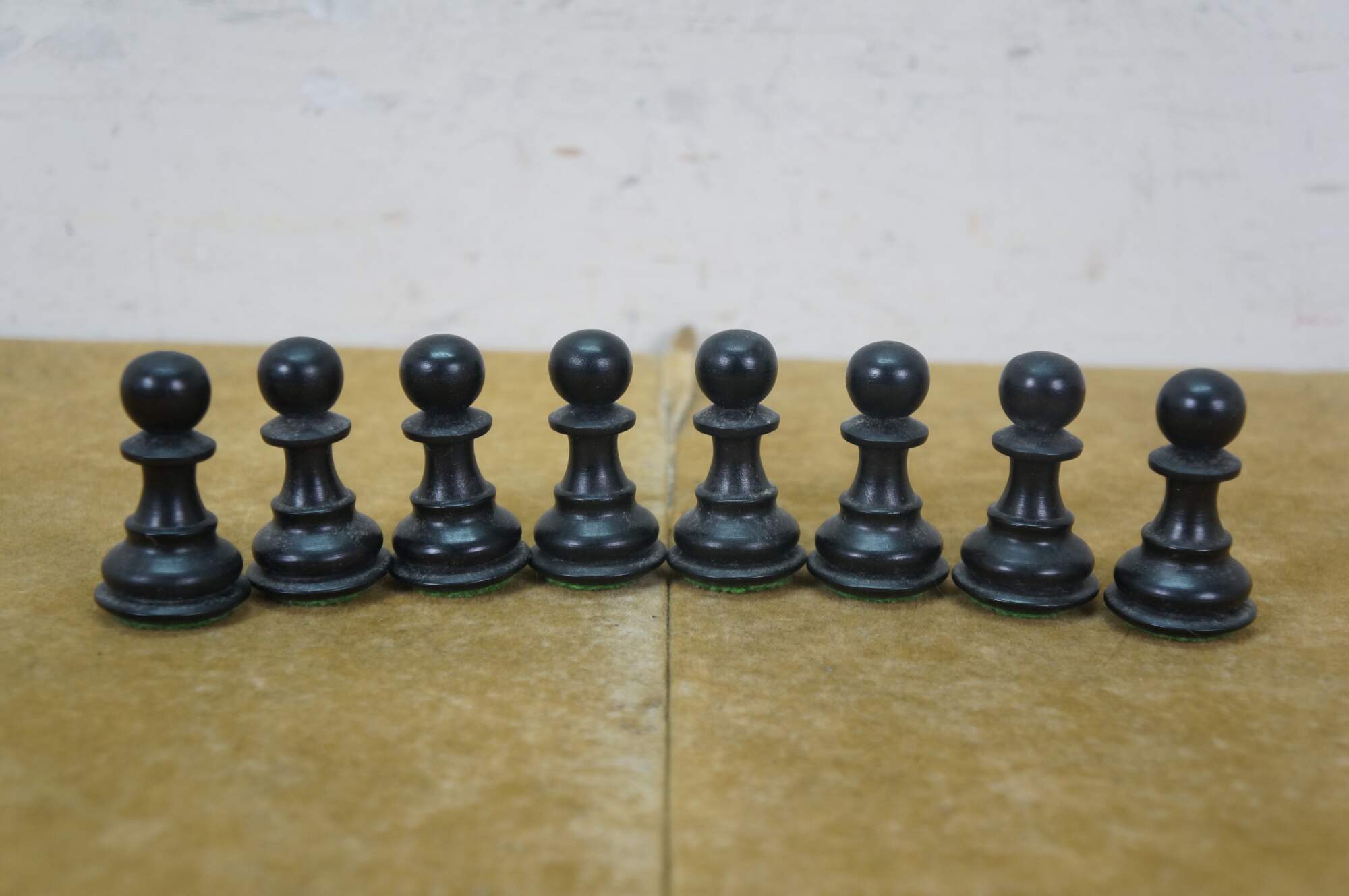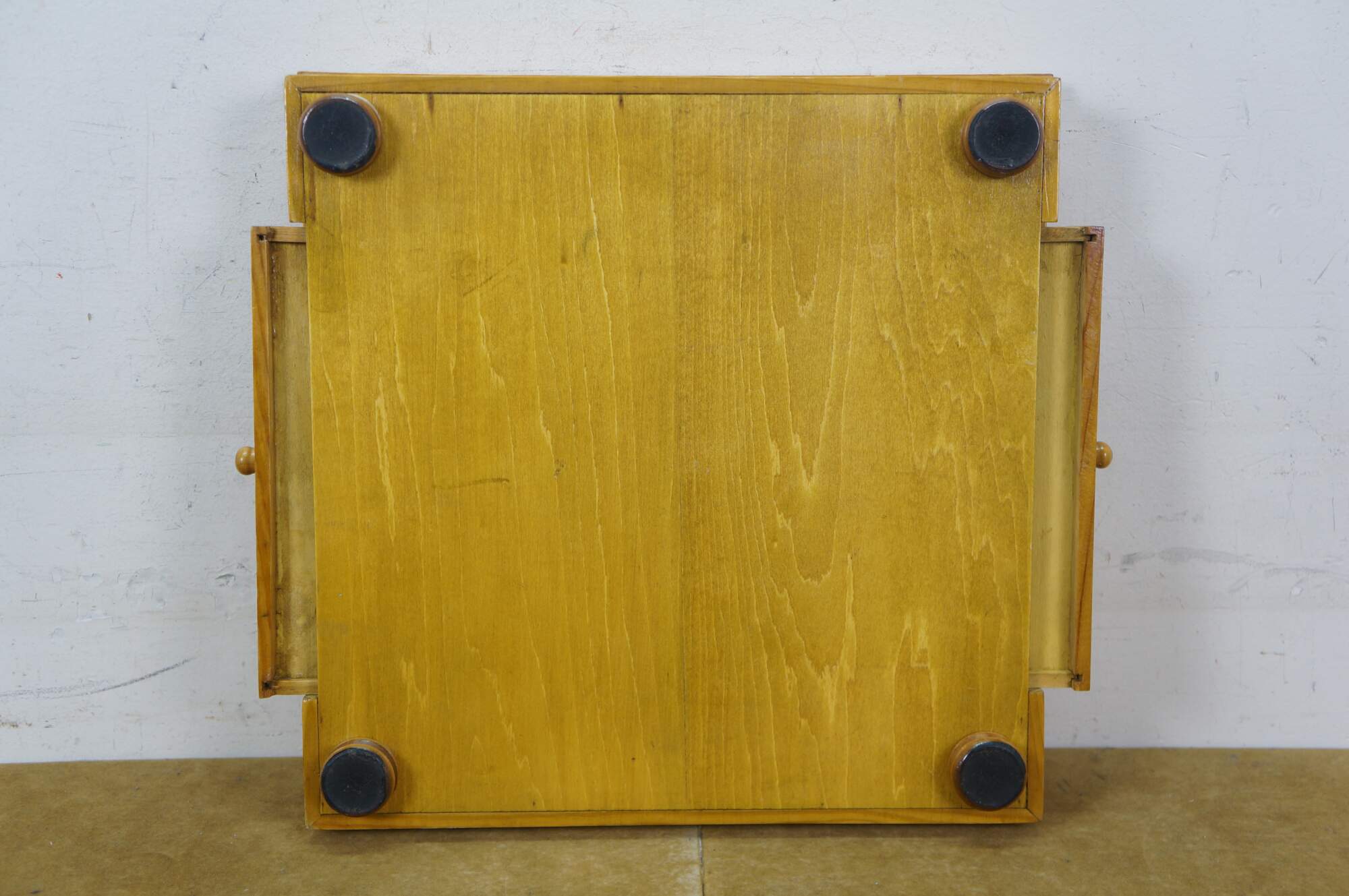 Late 20th century wooden tabletop chess board in black and natural wood tone, with two storage drawers. Includes a full 32 piece set of small wooden chess pieces and 31 checkers (possibly original to the board). Also includes a full set plus a spare Queen for each side of larger chess pieces with felted bases.