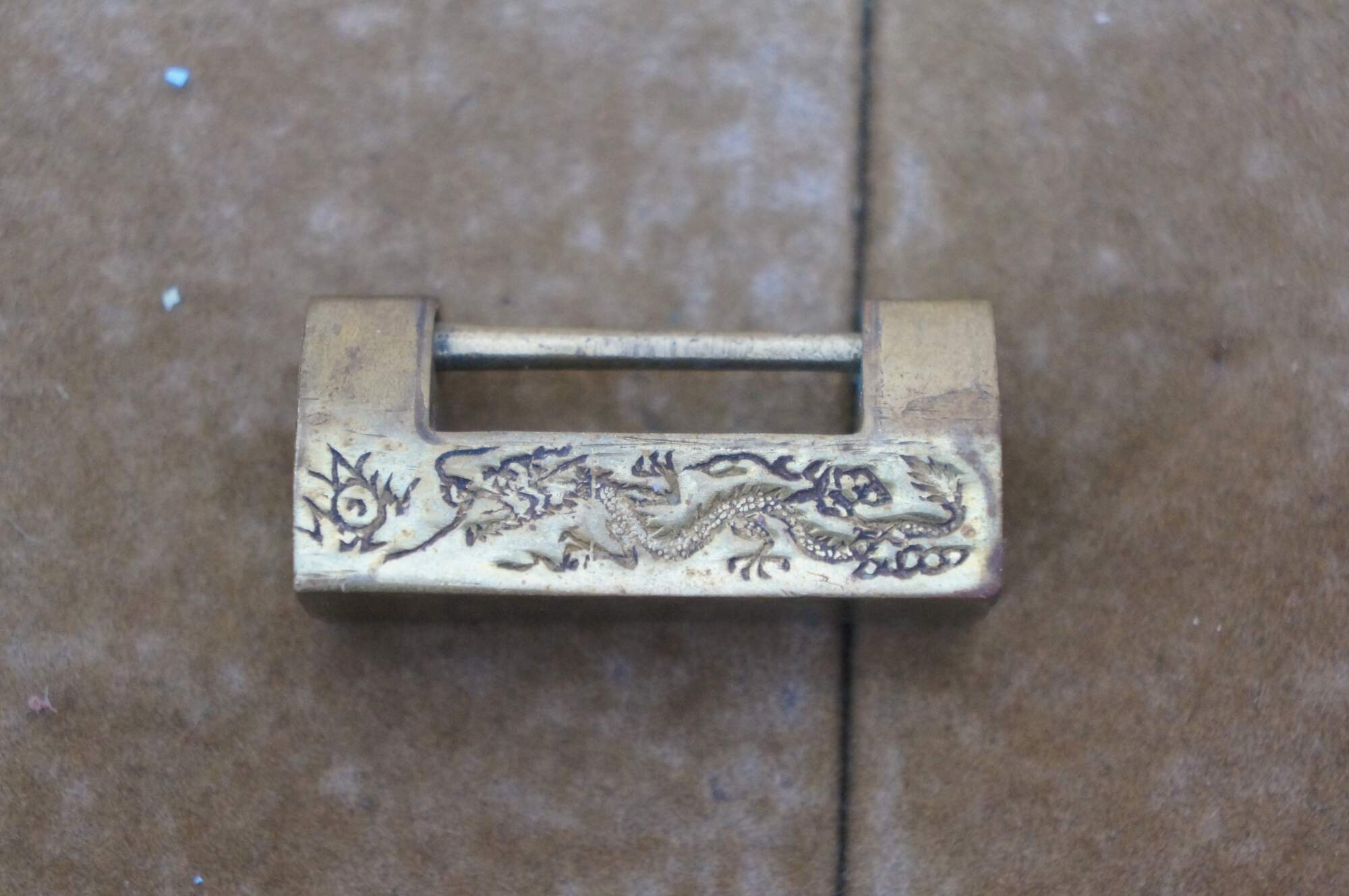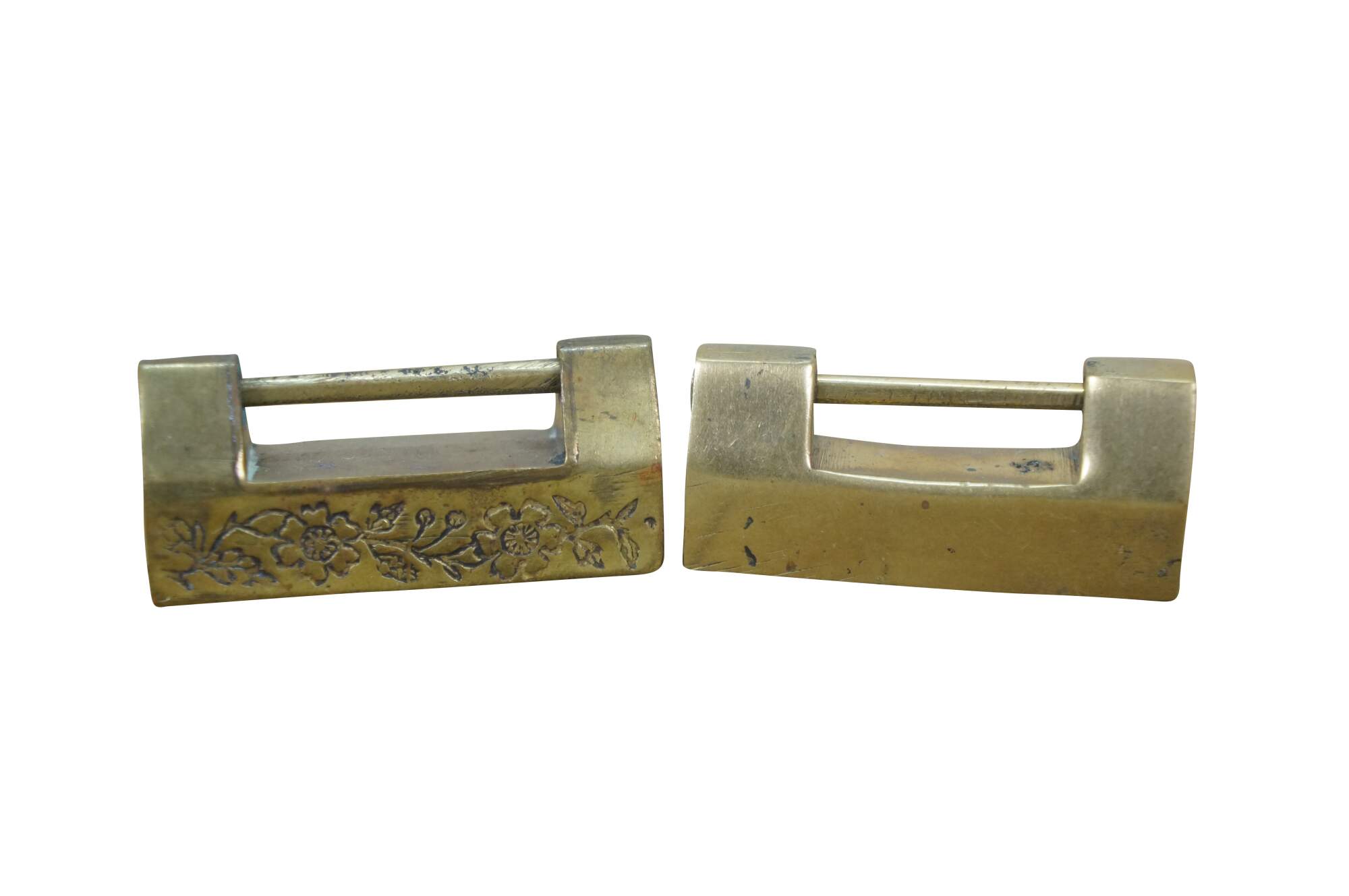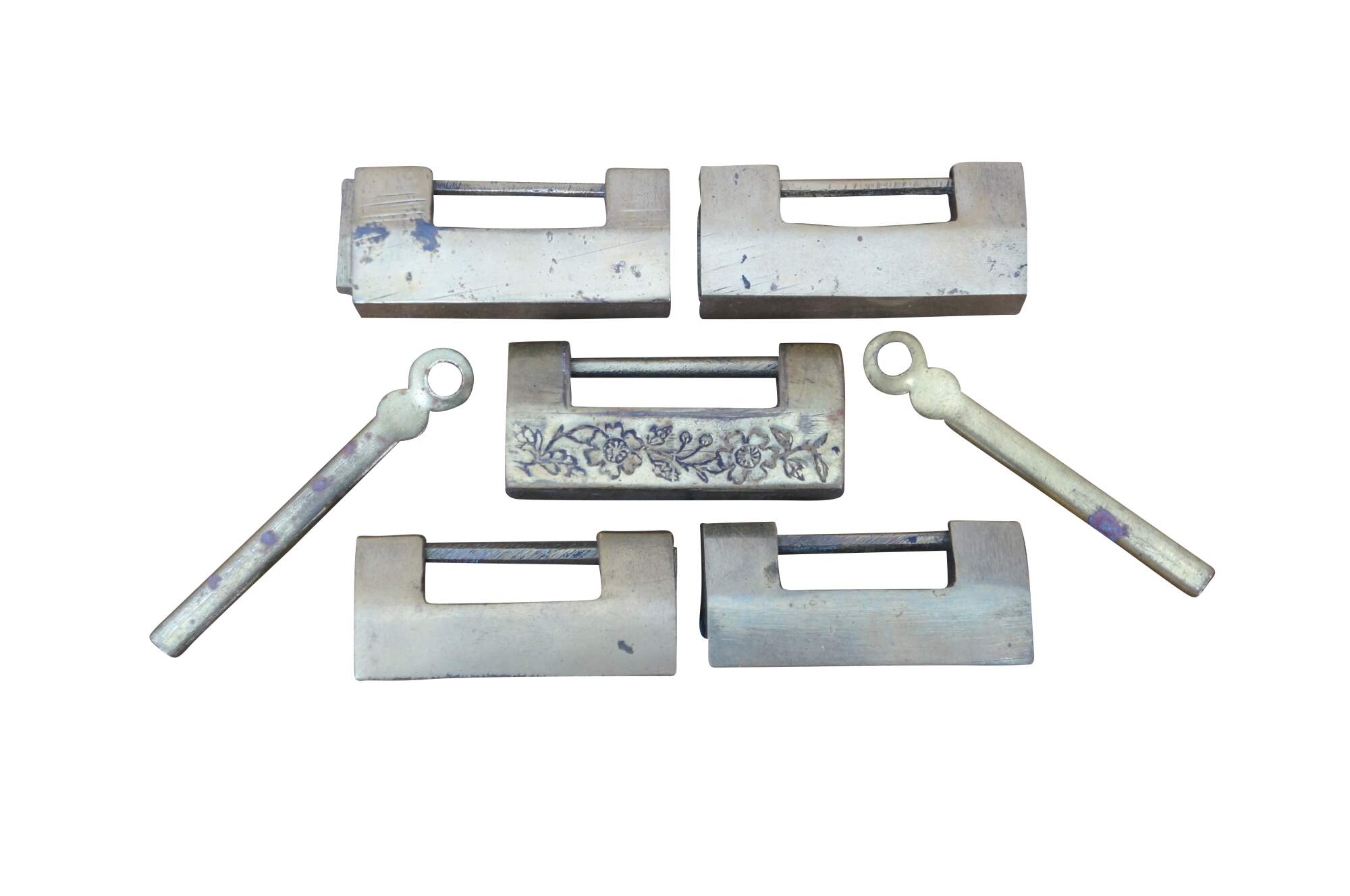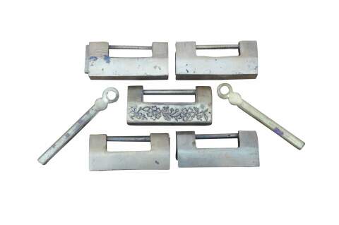 Lot of five mid to late 20th century Chinese sliding brass padlocks and two keys. Four locks plain. One marked Made in Hong kong. One lock etched on one side with flowers and on the other with a dragon.