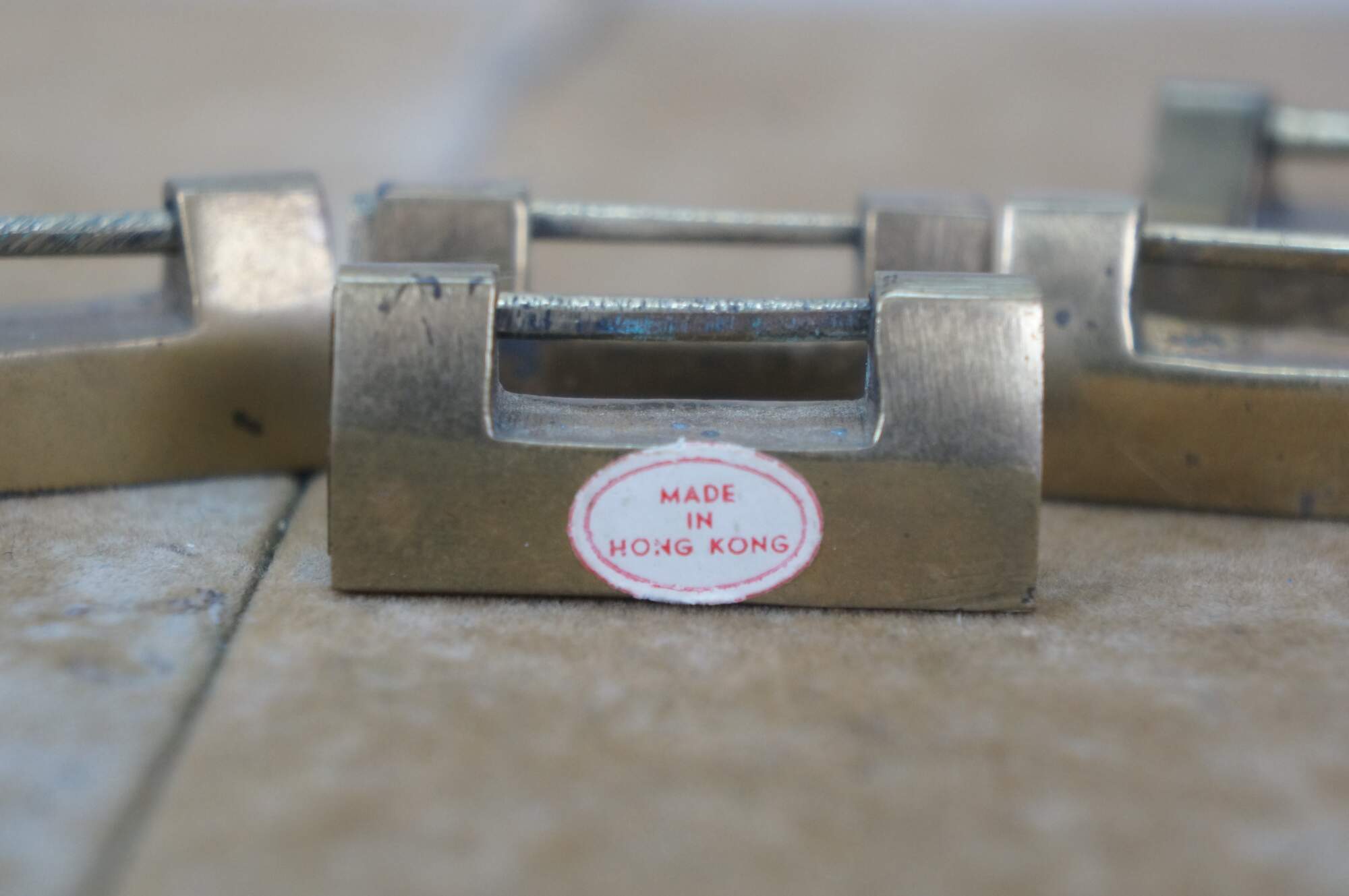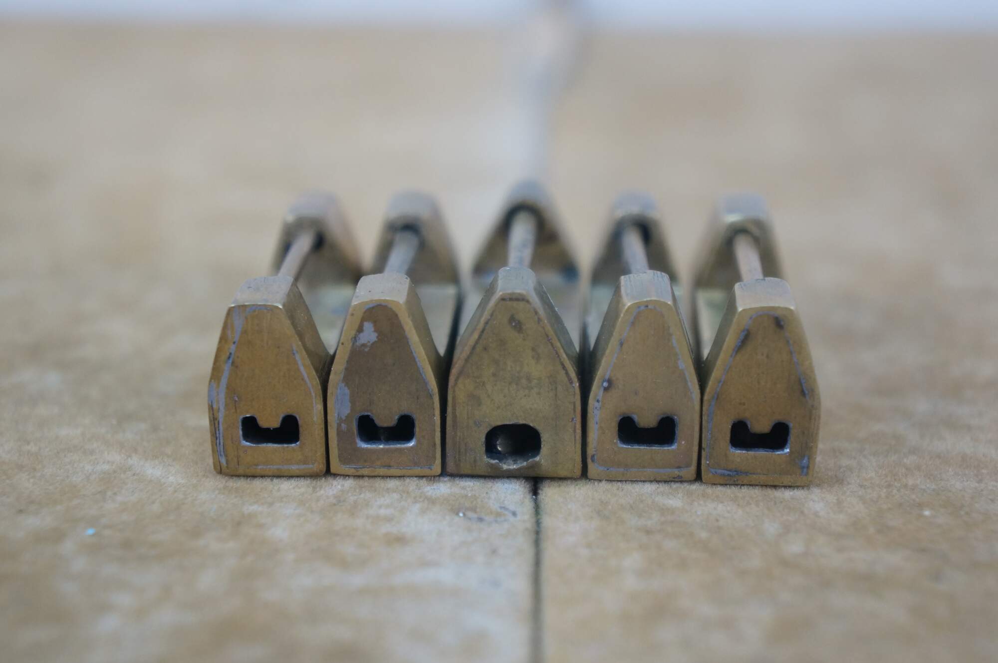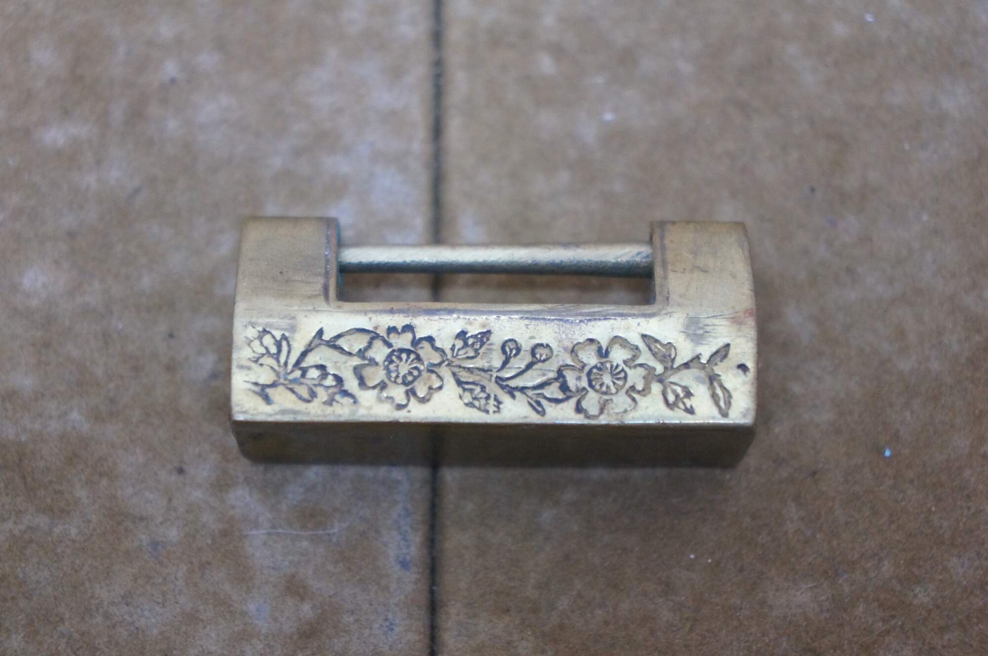 Lot of five mid to late 20th century Chinese sliding brass padlocks and two keys. Four locks plain. One marked Made in Hong kong. One lock etched on one side with flowers and on the other with a dragon.