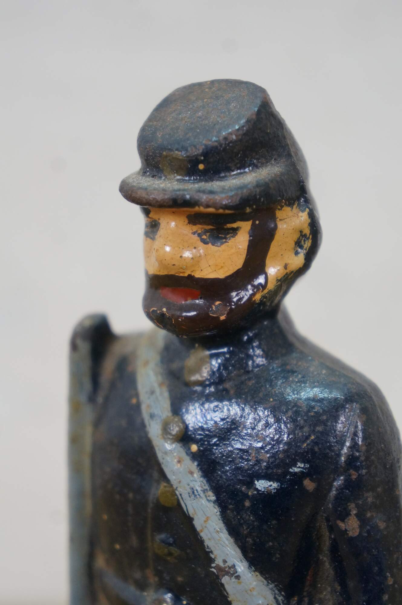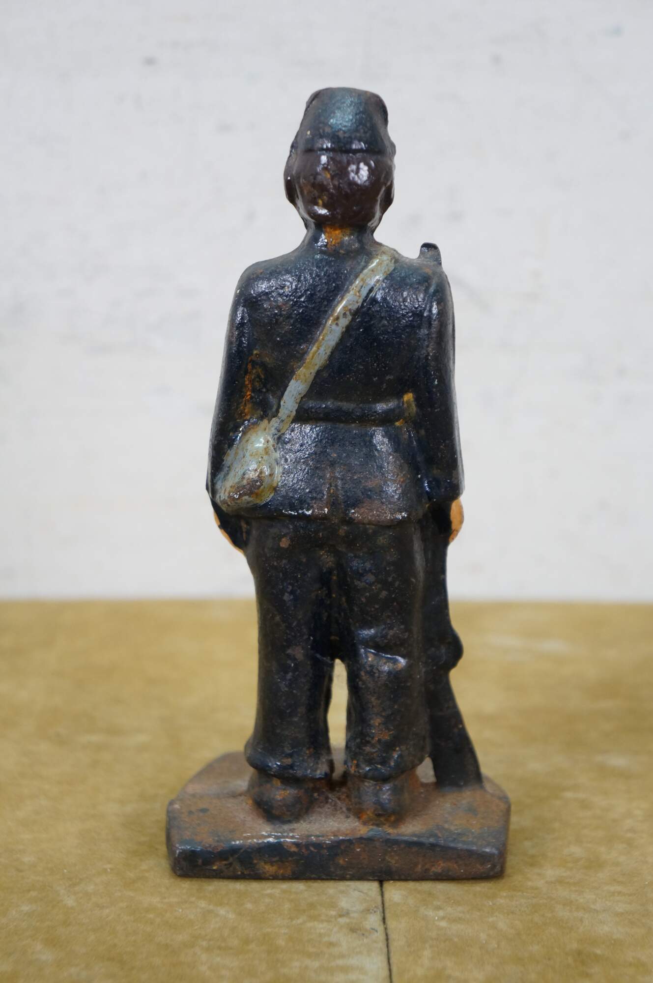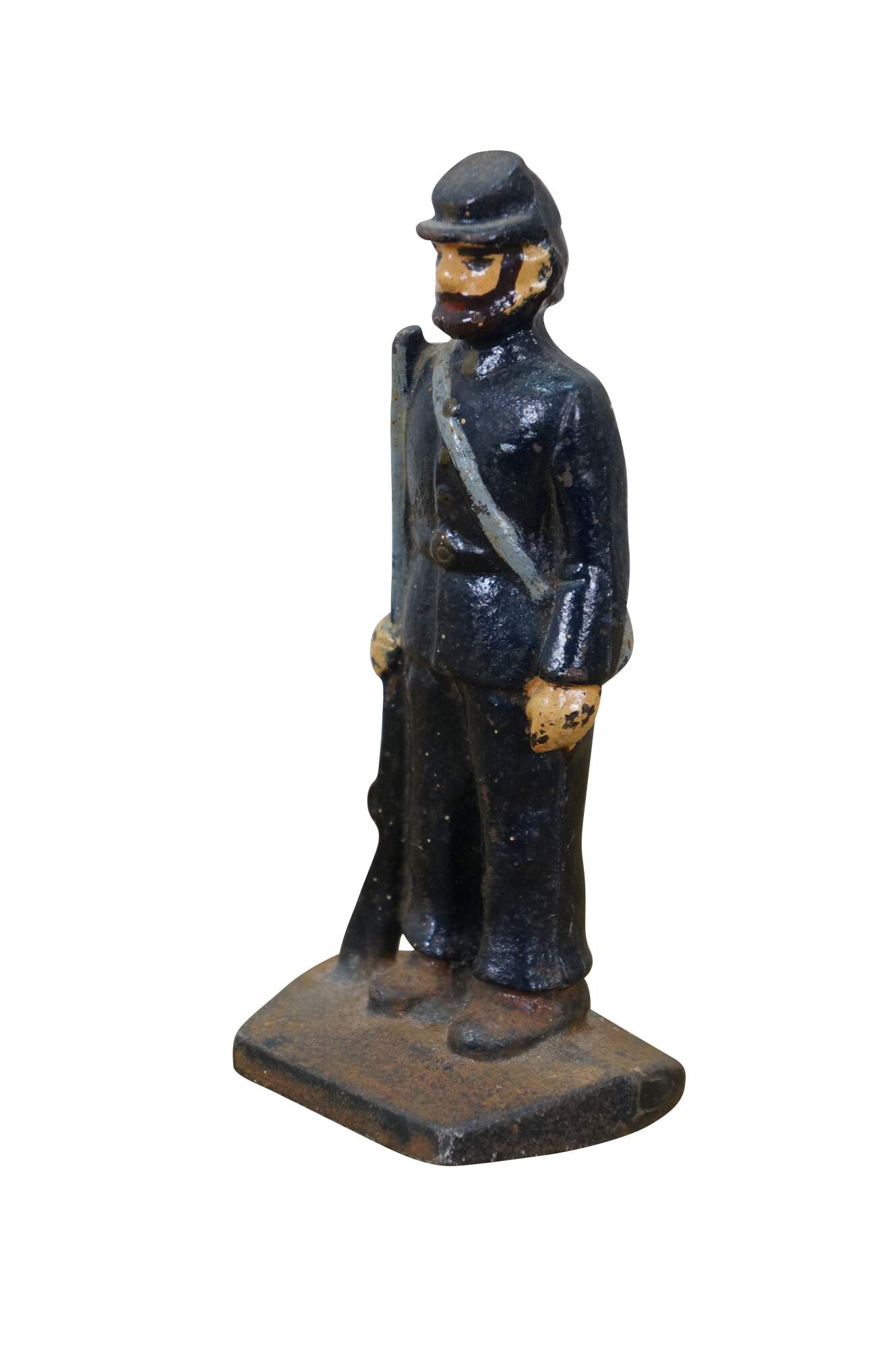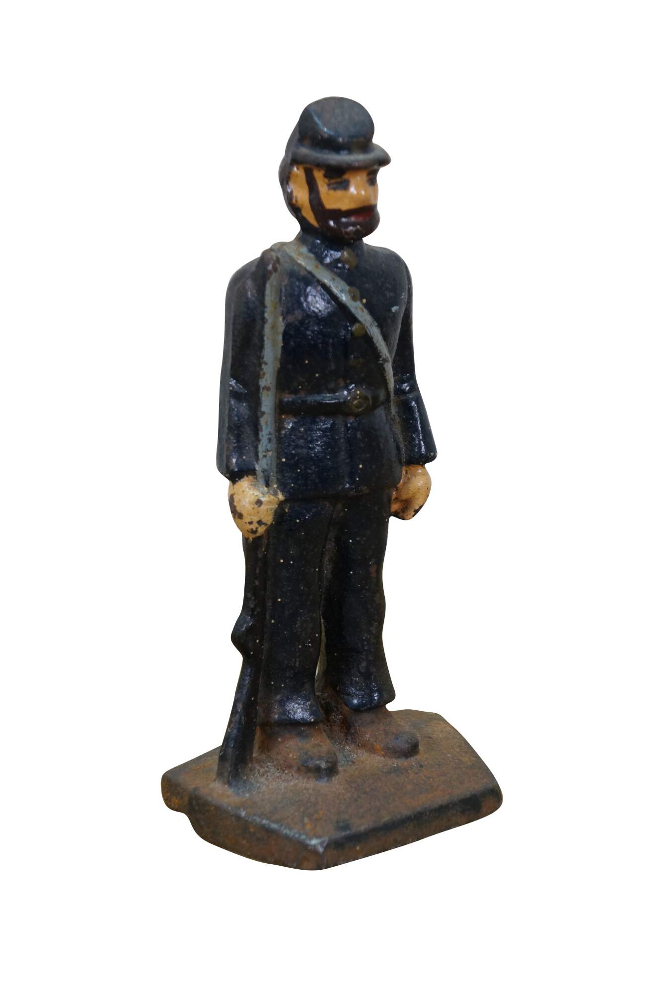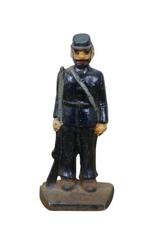 Late 19th to early 20th century cast iron figurine / sculpture - likely a door stop or bookend - in the shape of an American Civil War era Union soldier with a rifle, painted with navy blue uniform and brown beard.