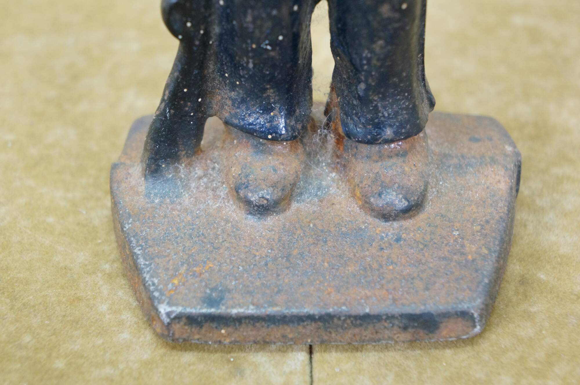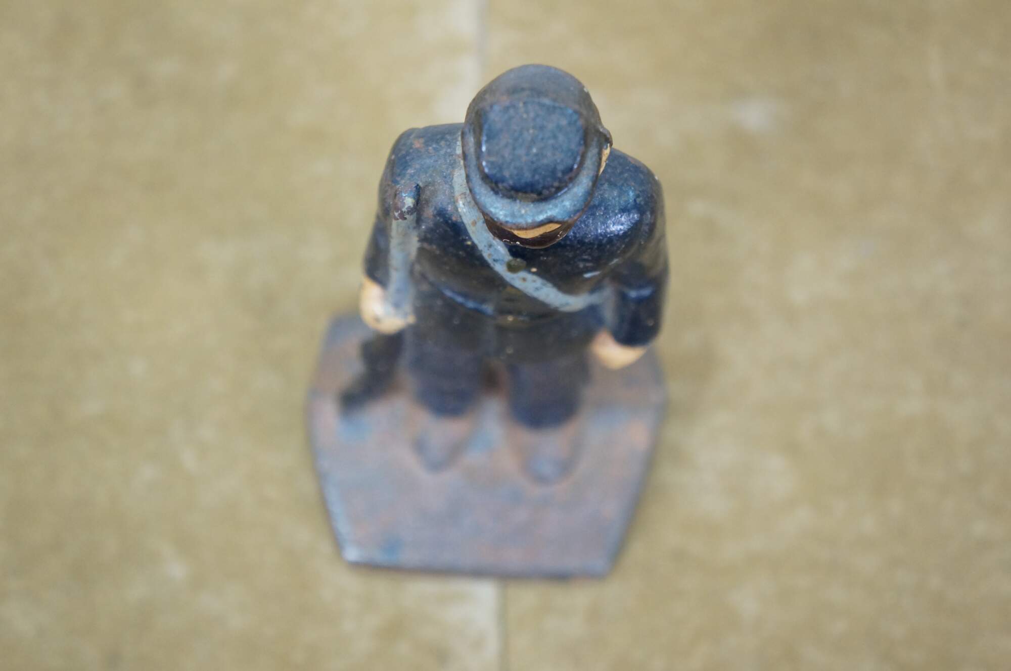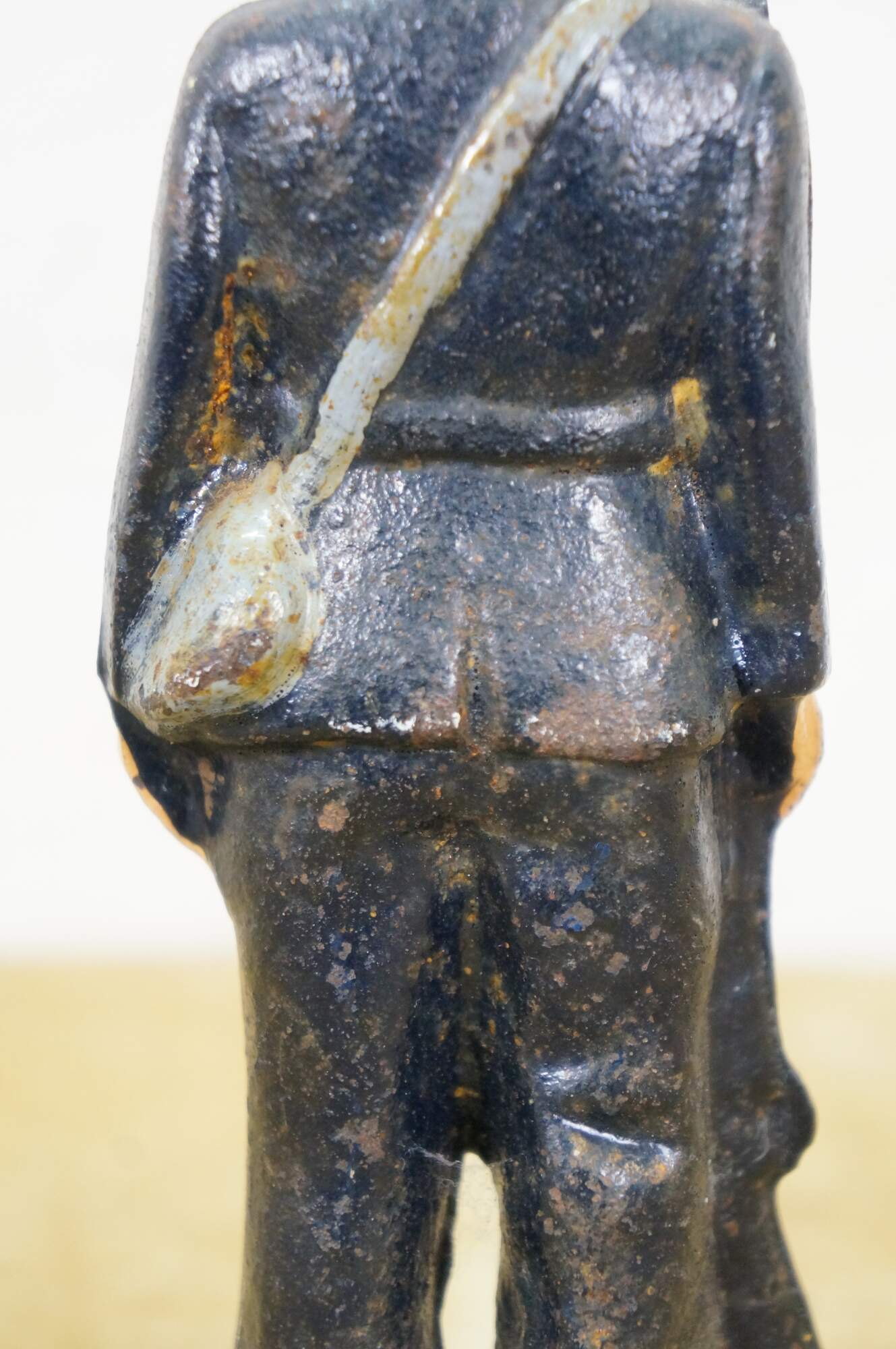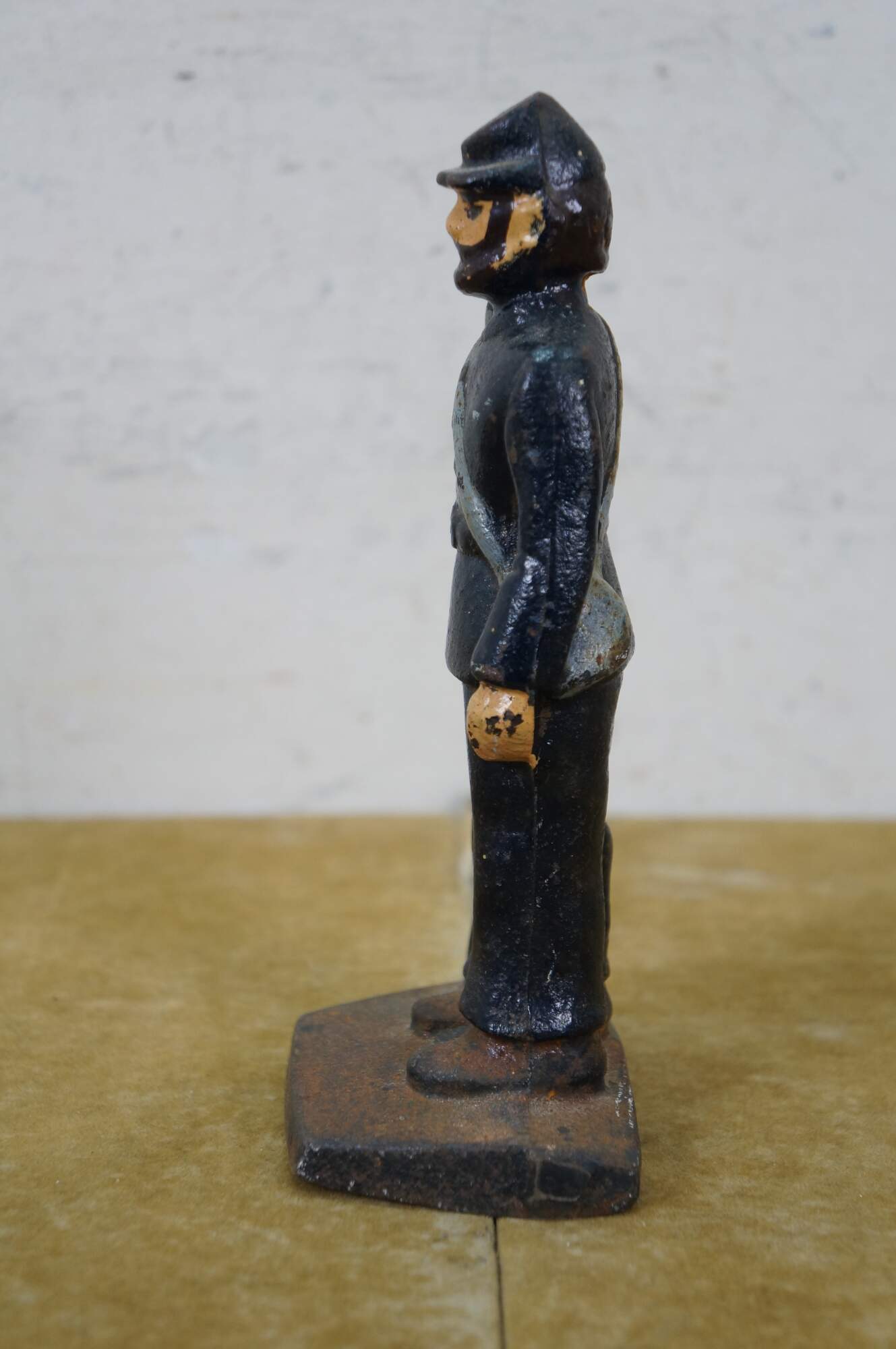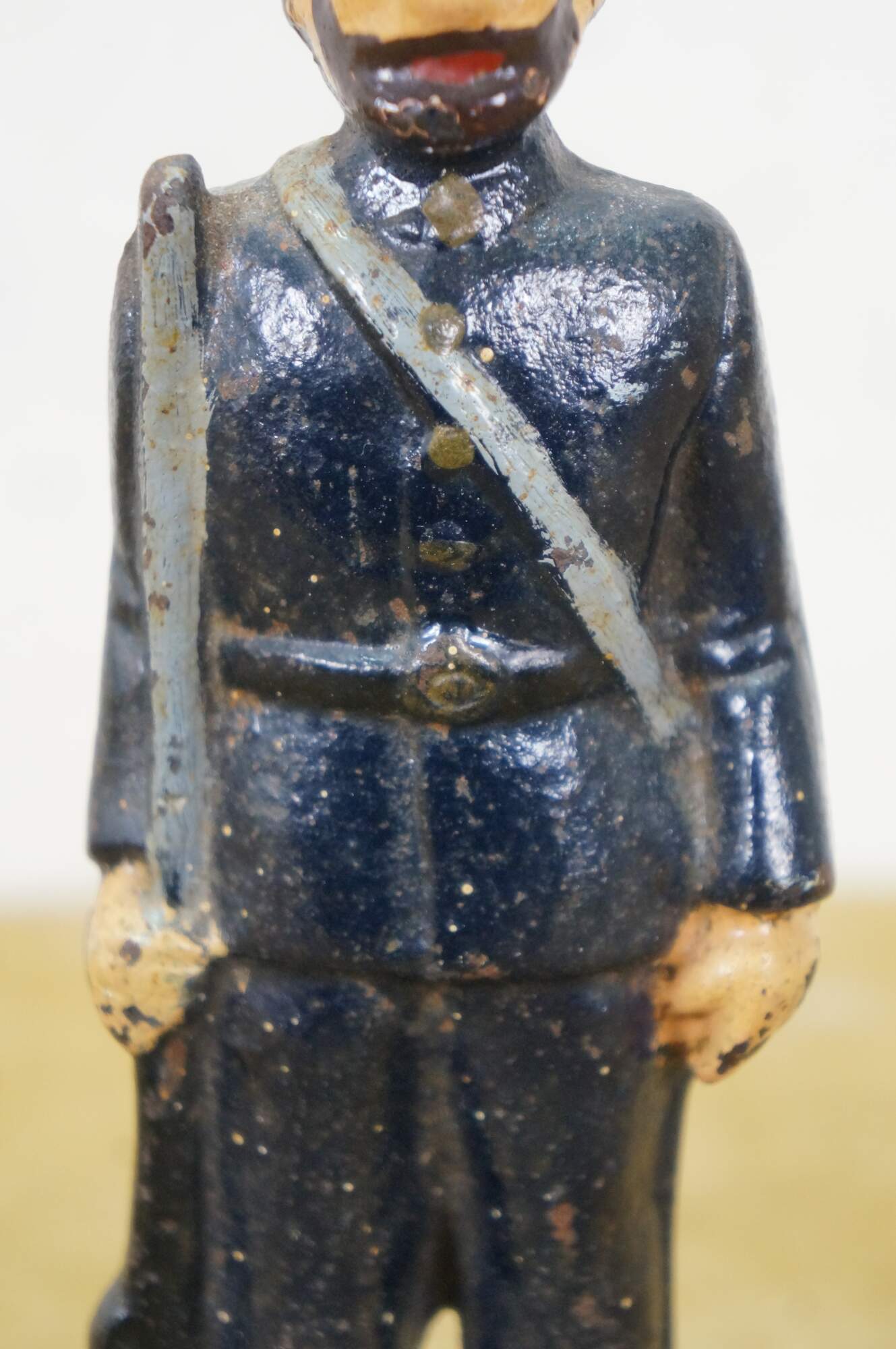 Late 19th to early 20th century cast iron figurine / sculpture - likely a door stop or bookend - in the shape of an American Civil War era Union soldier with a rifle, painted with navy blue uniform and brown beard.