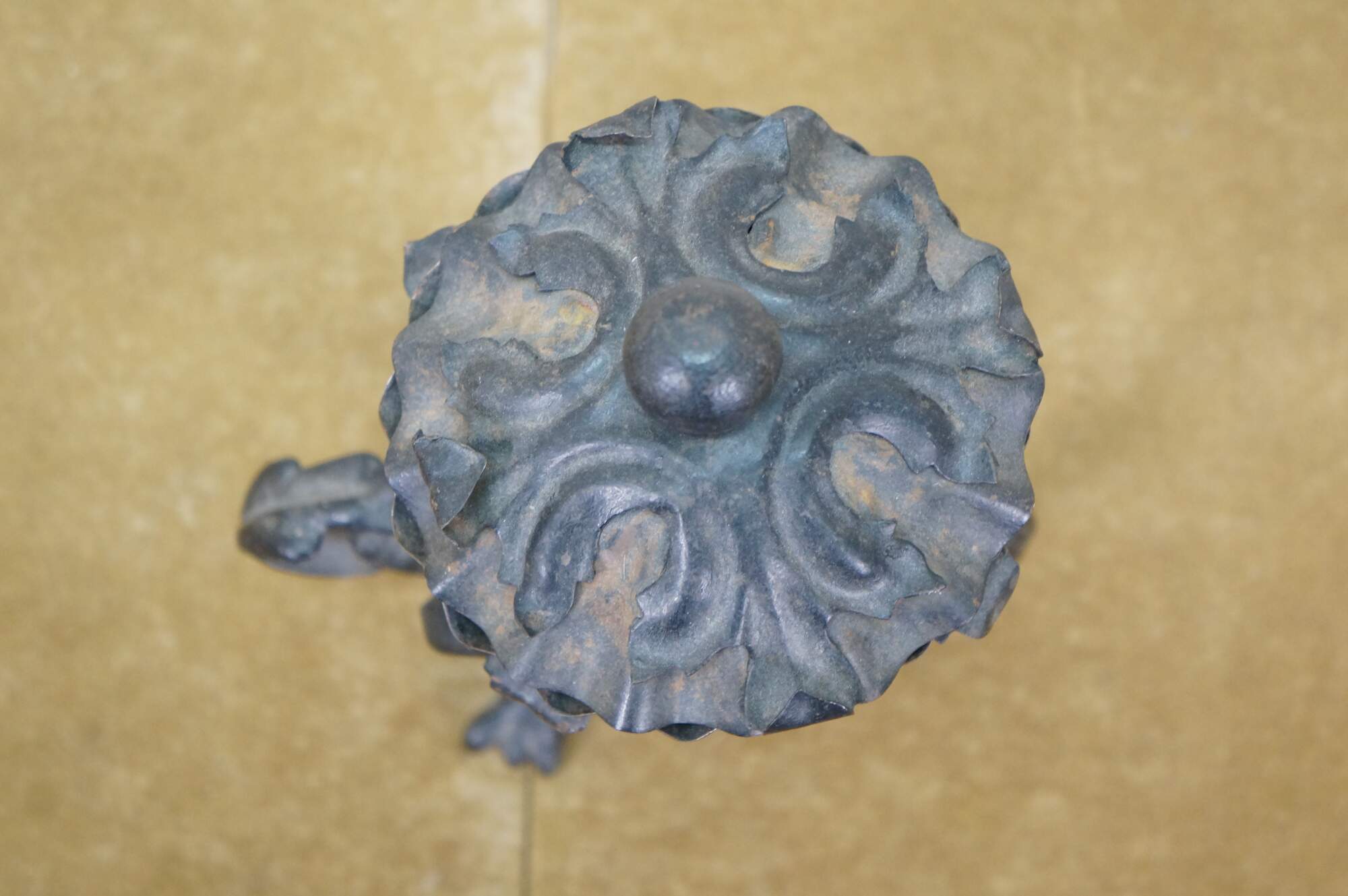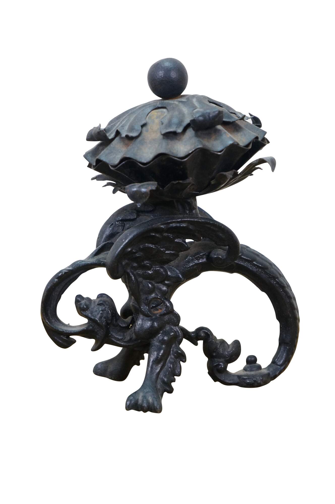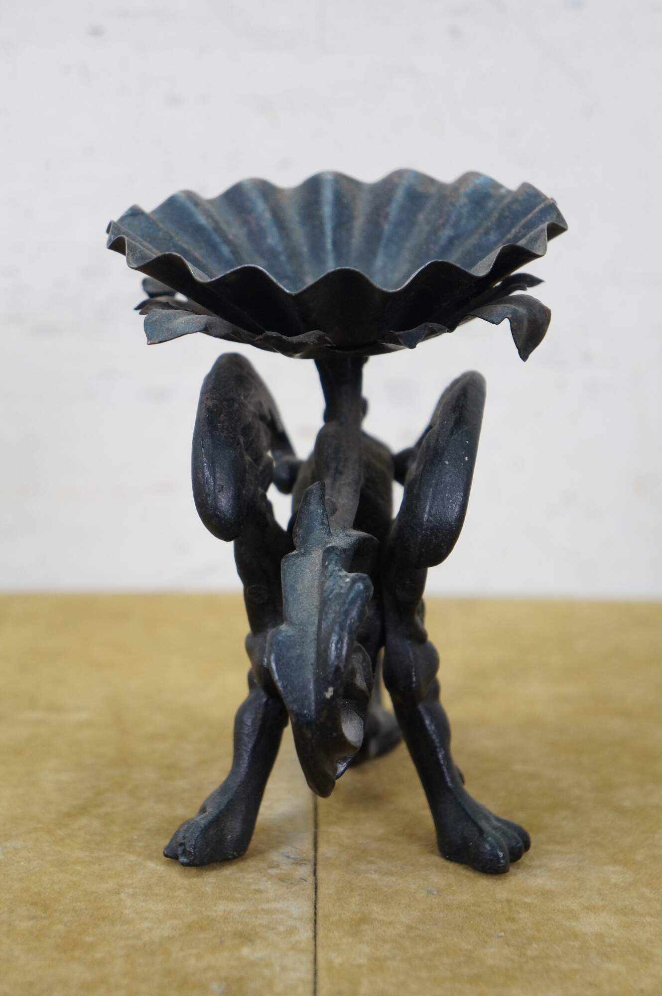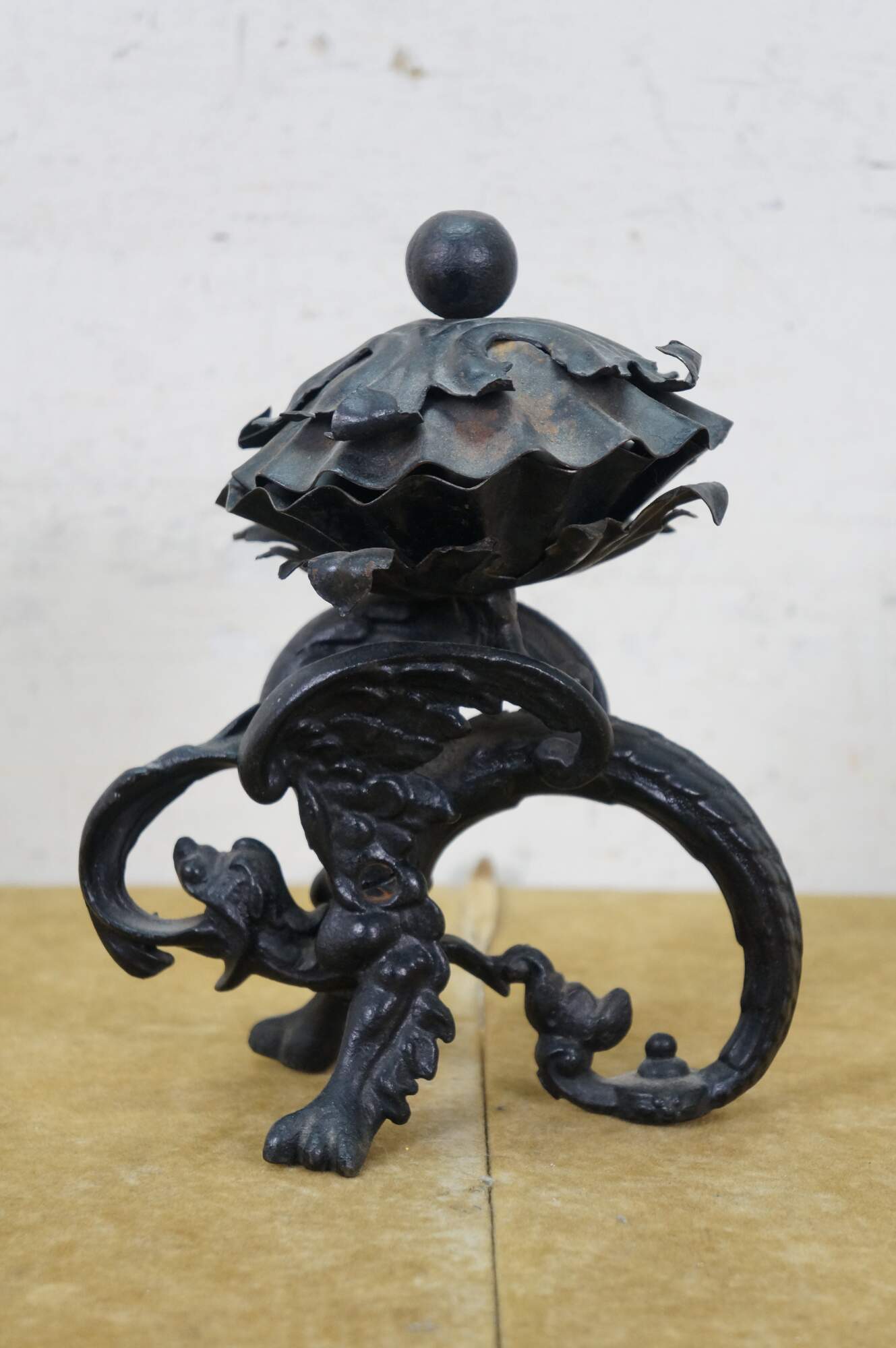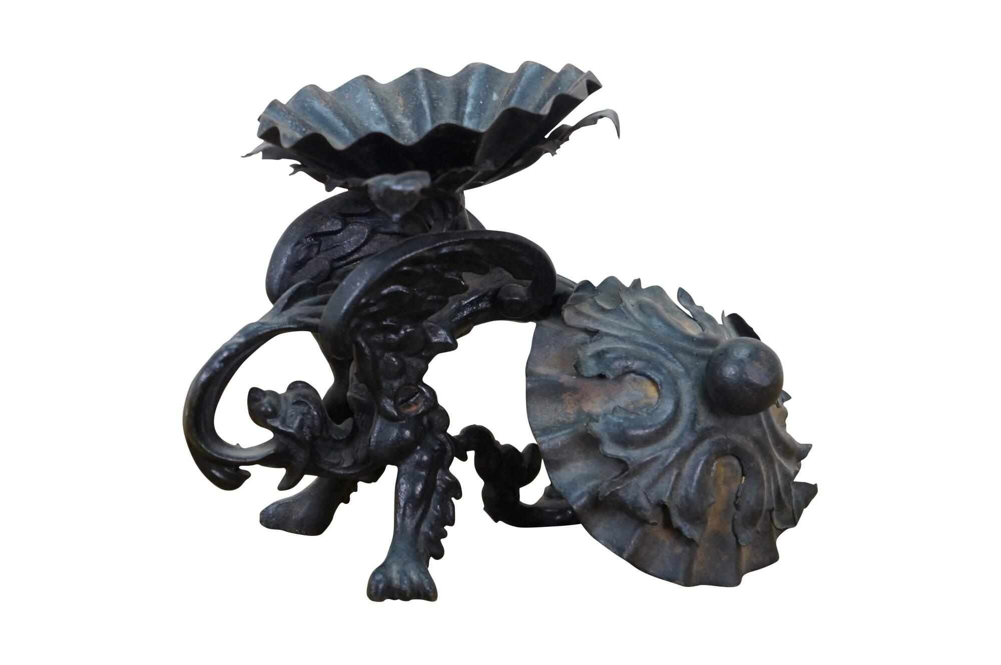 Circa mid to late 20th century black cast iron dragon or griffon breathing fire, supporting a clam shell shaped lidded candy dish / compote / incense / votive / candle holder.