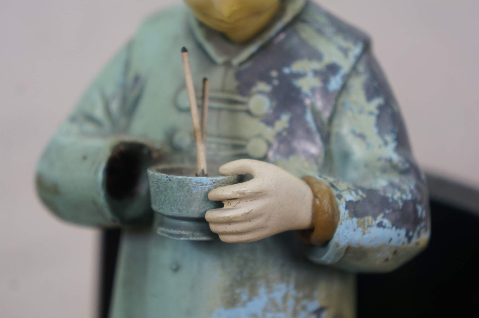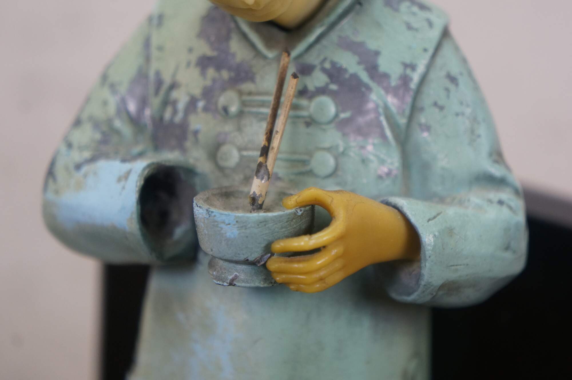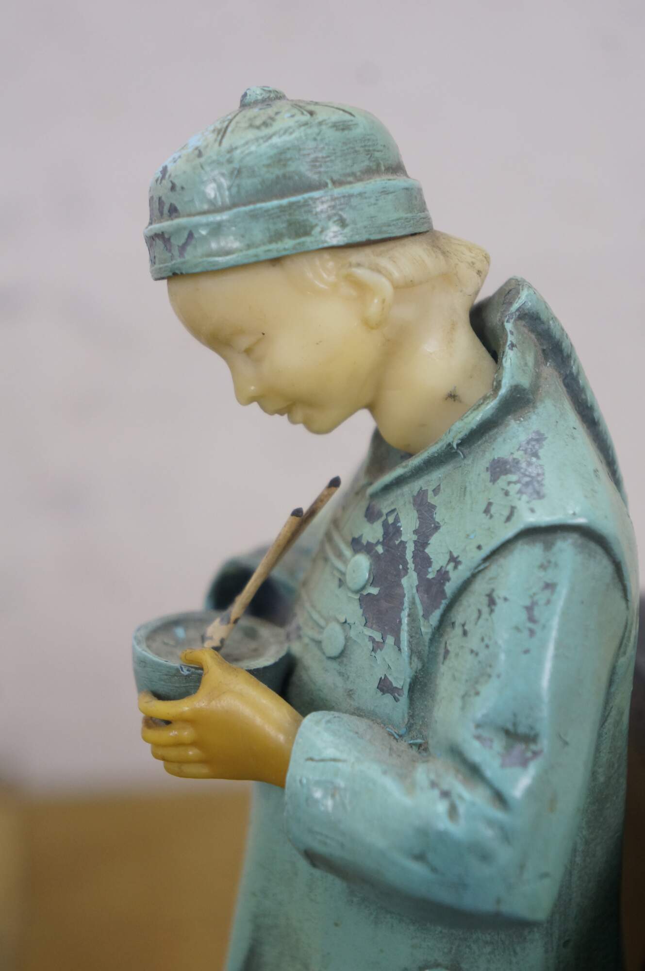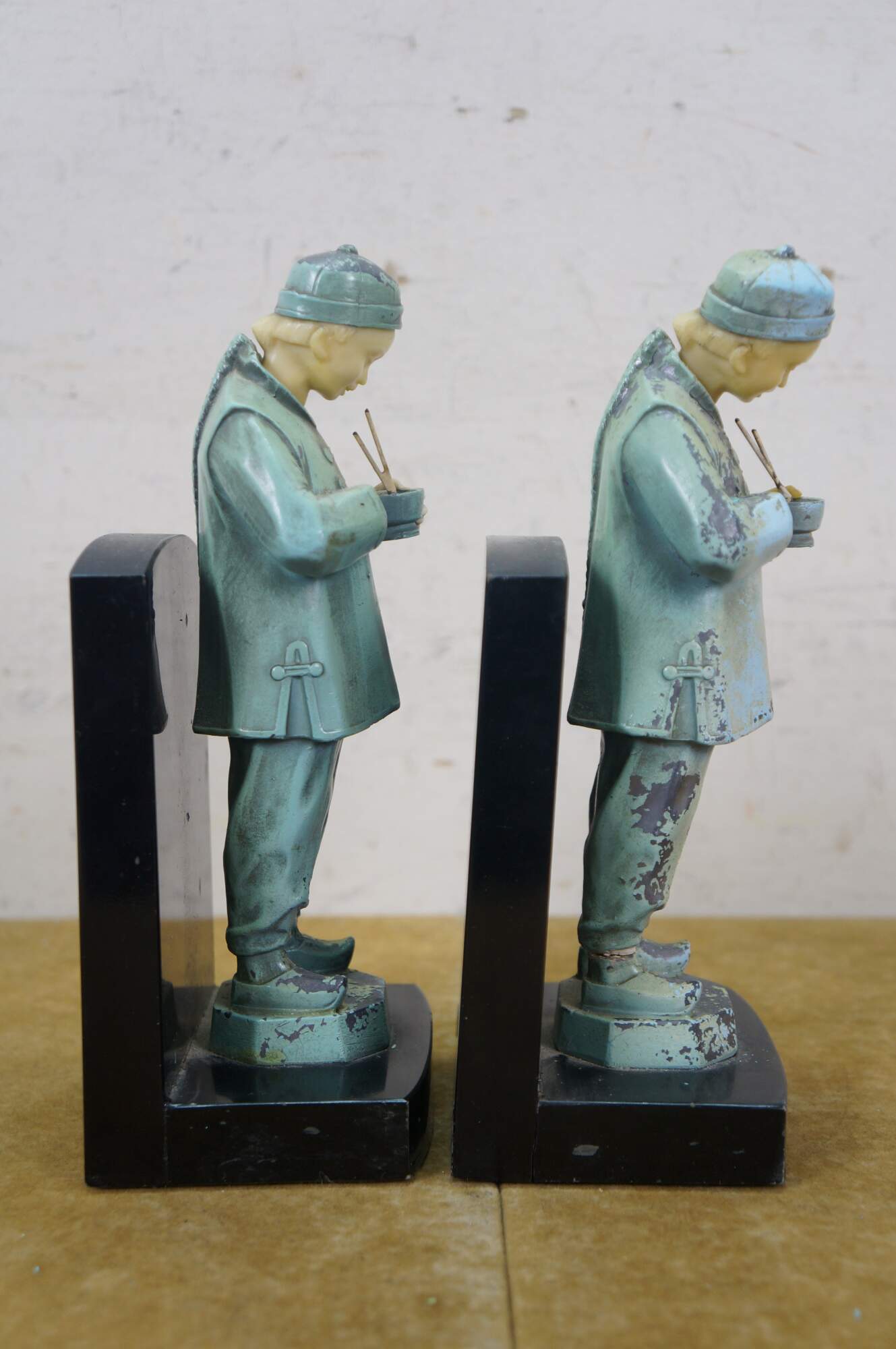 Early 20th century, circa 1930's, pair of cold painted spelter bronze figural bookends attributed to J.B. Hirch. Metal figurines with plastic/celluloid hands and heads, in the shape of men in light blue-teal painted Chinese clothing, holding a bowls with chopsticks. Mounted on L-shaped plinths of black marble.