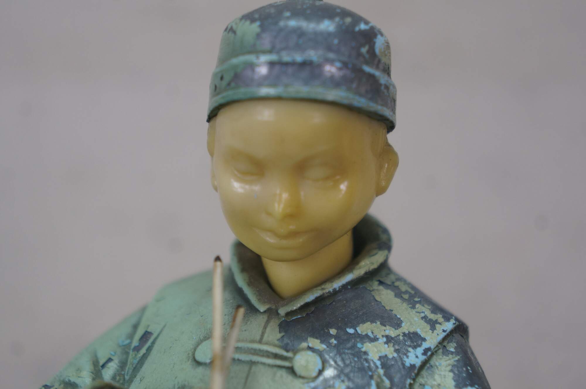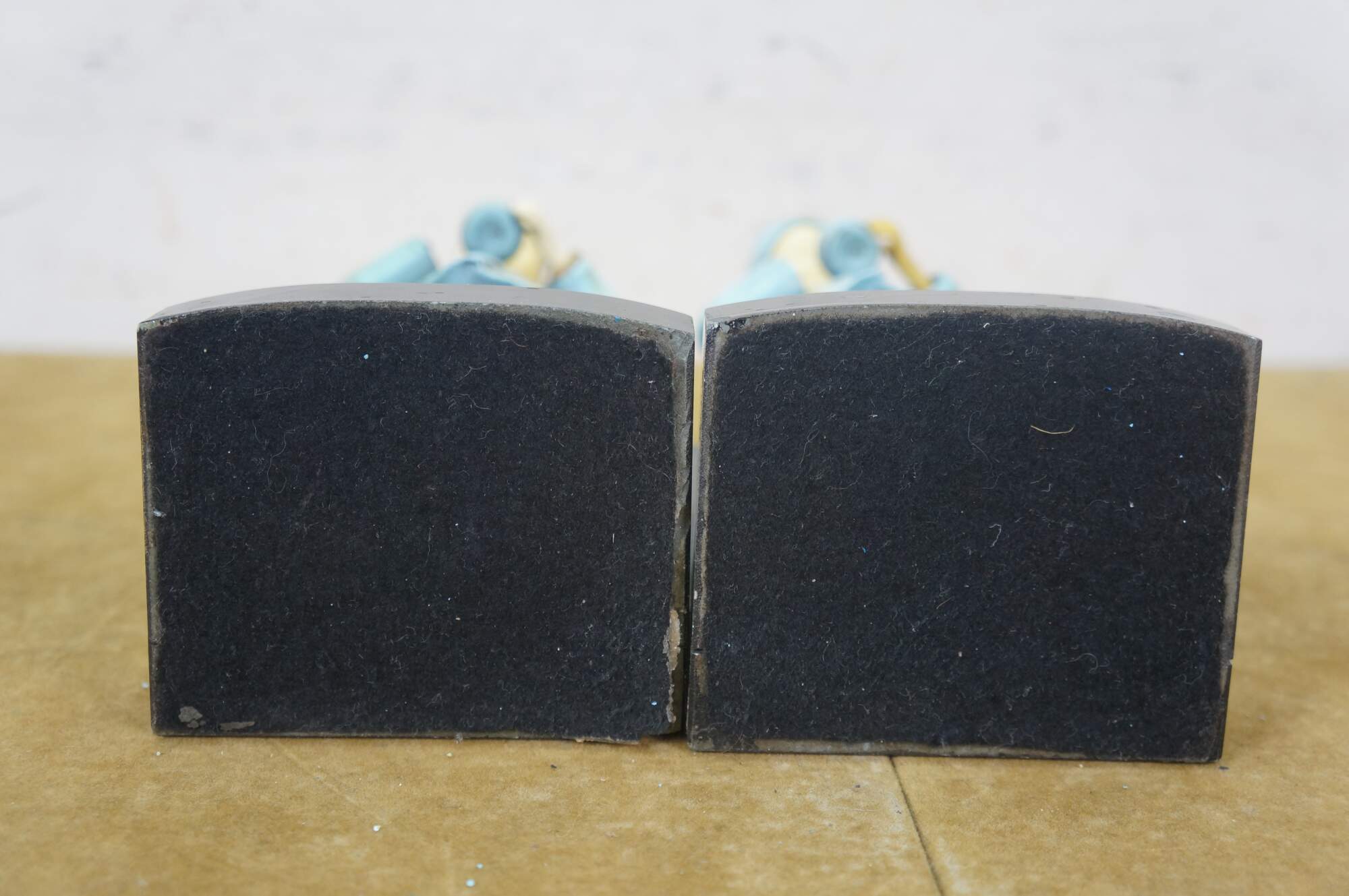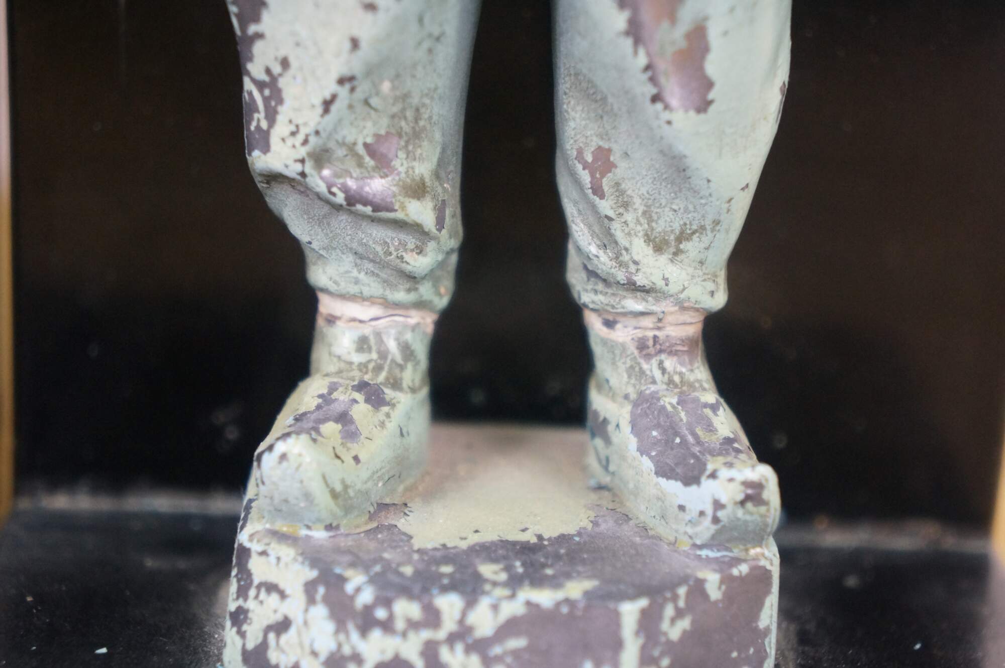 Paint loss, chipping, missing hands, hand replaced, cracked ankles on one.