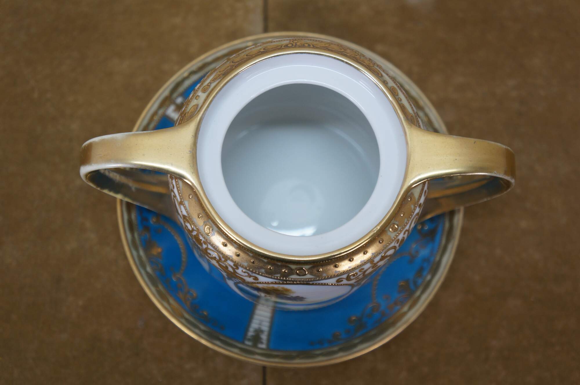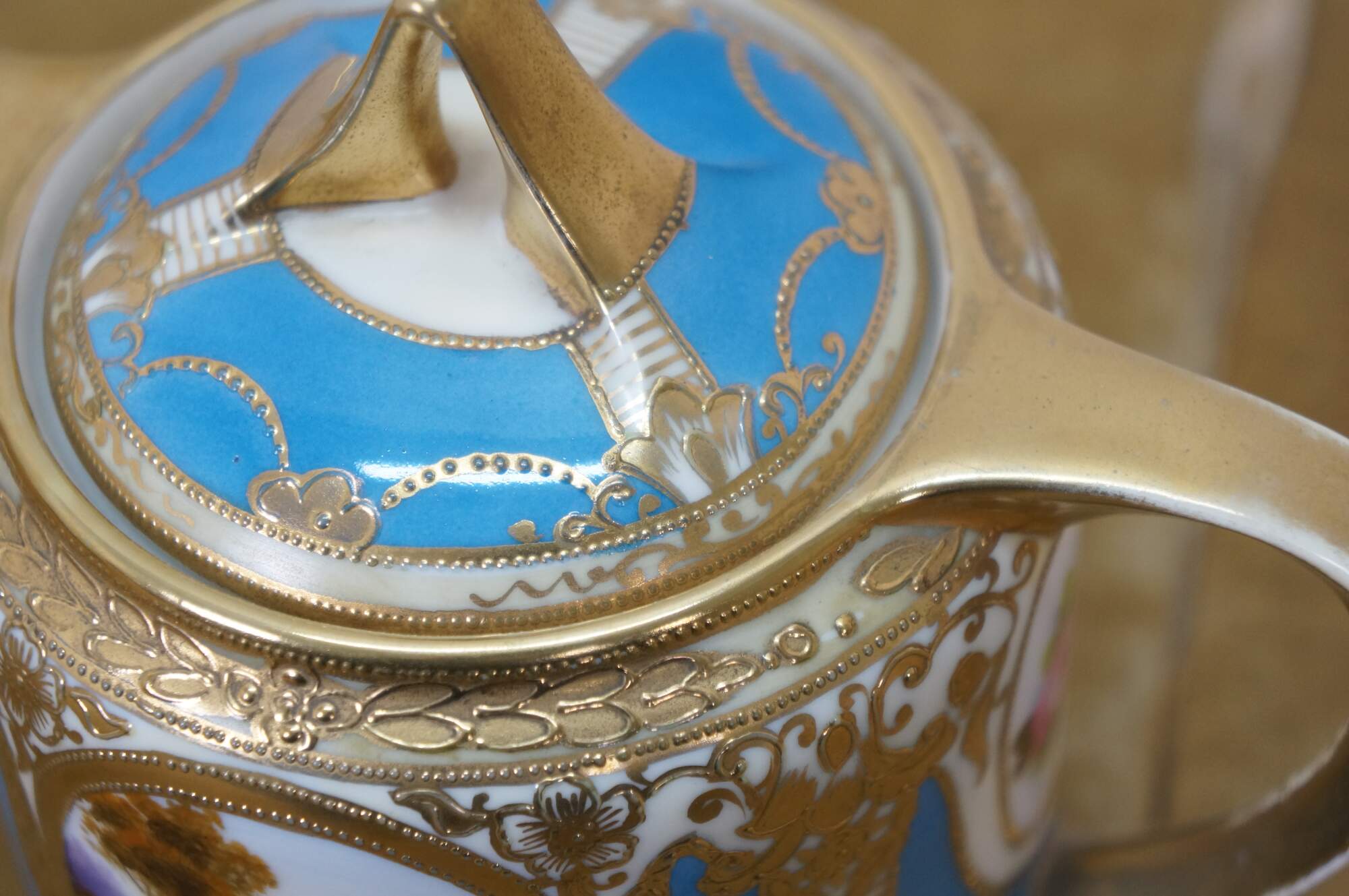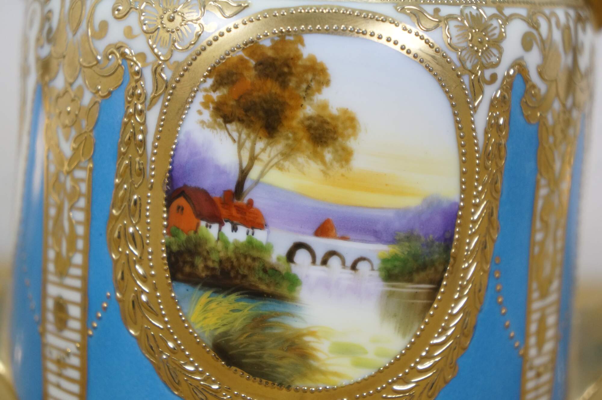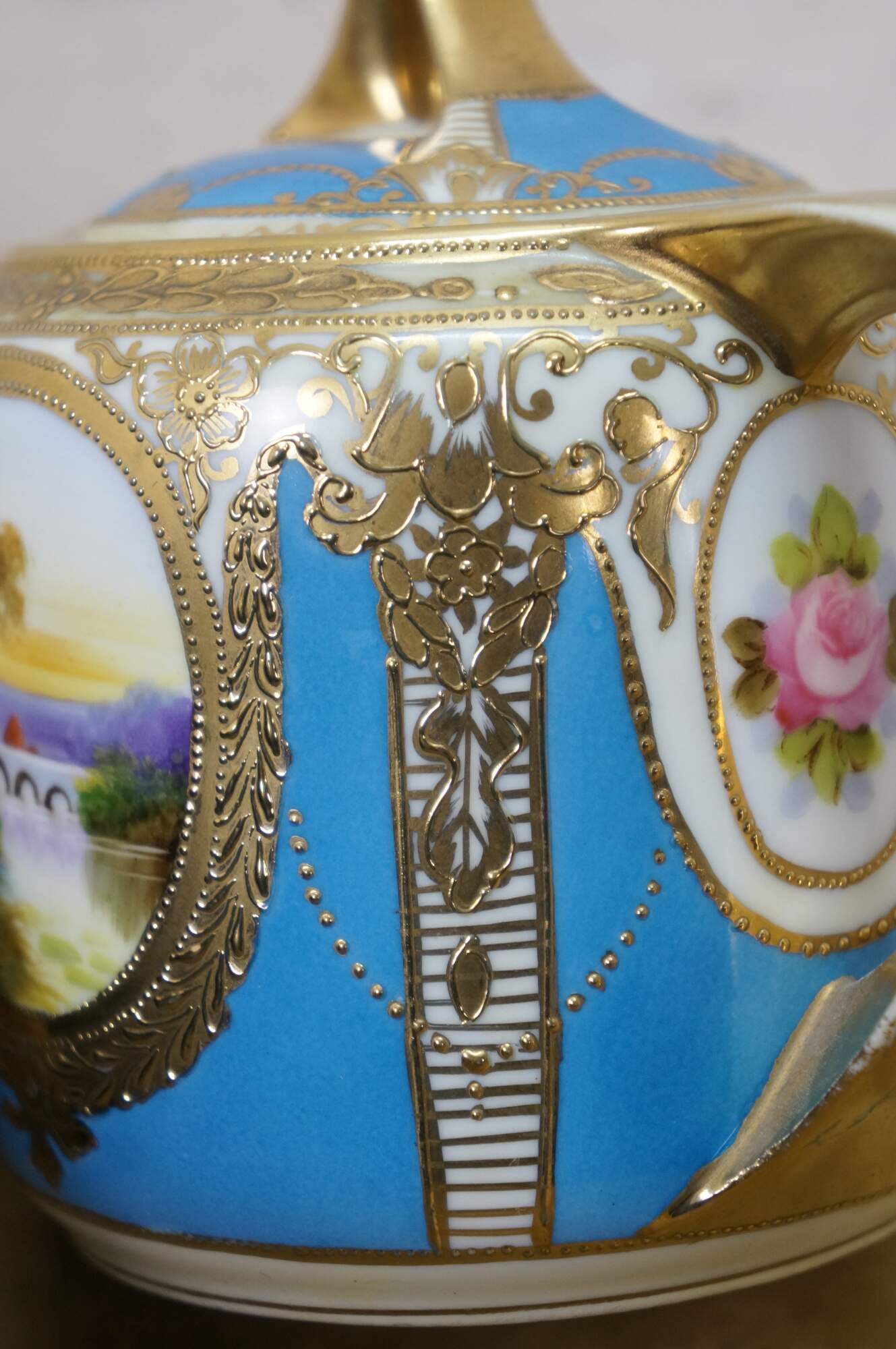 Early to mid 20th century Noritake porcelain sugar bowl with lid, spoon and underplate. Imitates the look of French Sevre style porcelain with turquoise blue panels framed in gilt moriage floral swags and details; sides hand painted with miniature country landscapes and pink roses. Mark used circa 1918-1940s.