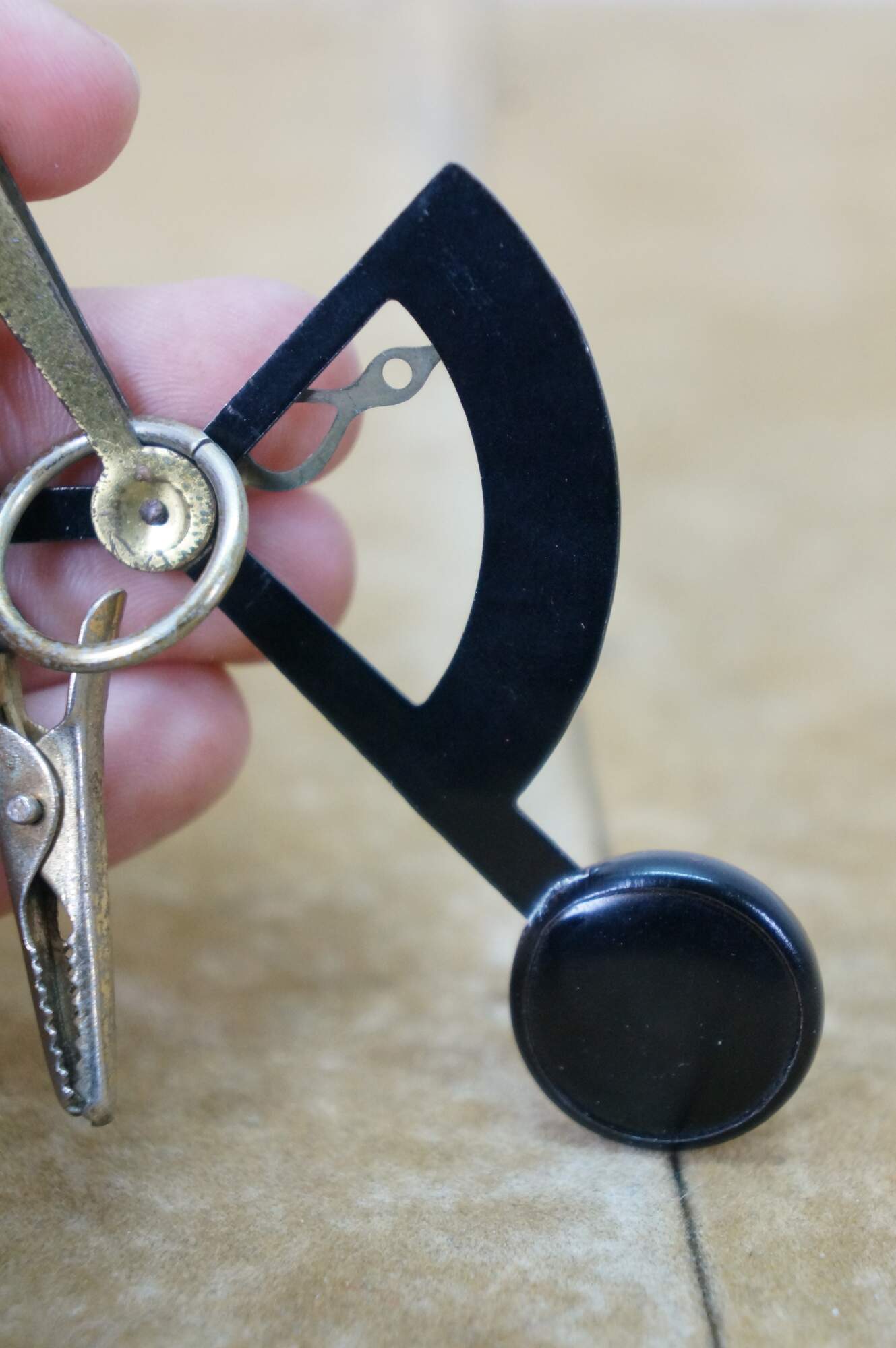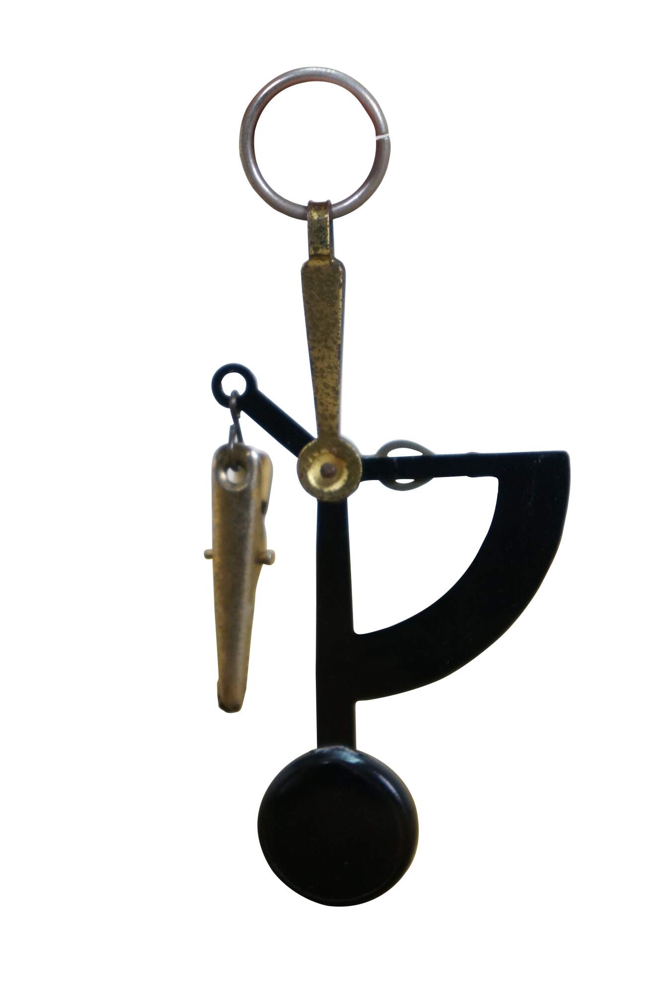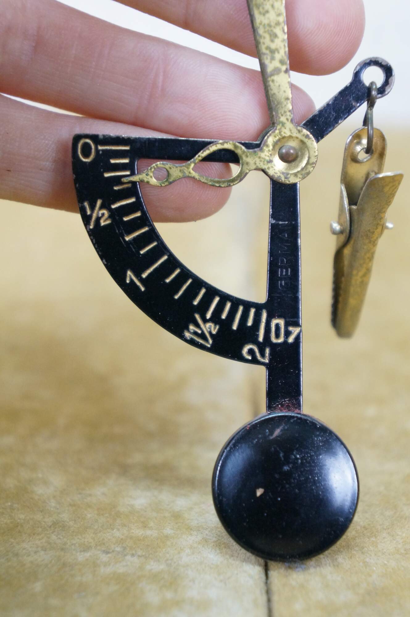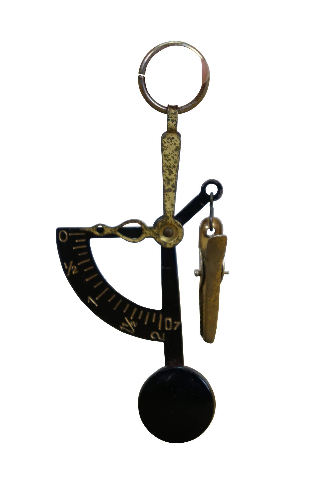Vintage 20th century pocket sized hand held postal / letter scale. Suspends from the finger on a metal ring, brass weight indicator, black enameled weighted scale and alligator clip for the letter. Reads up to 2 oz. Includes red morocco leather case with extra slot for postage stamps.