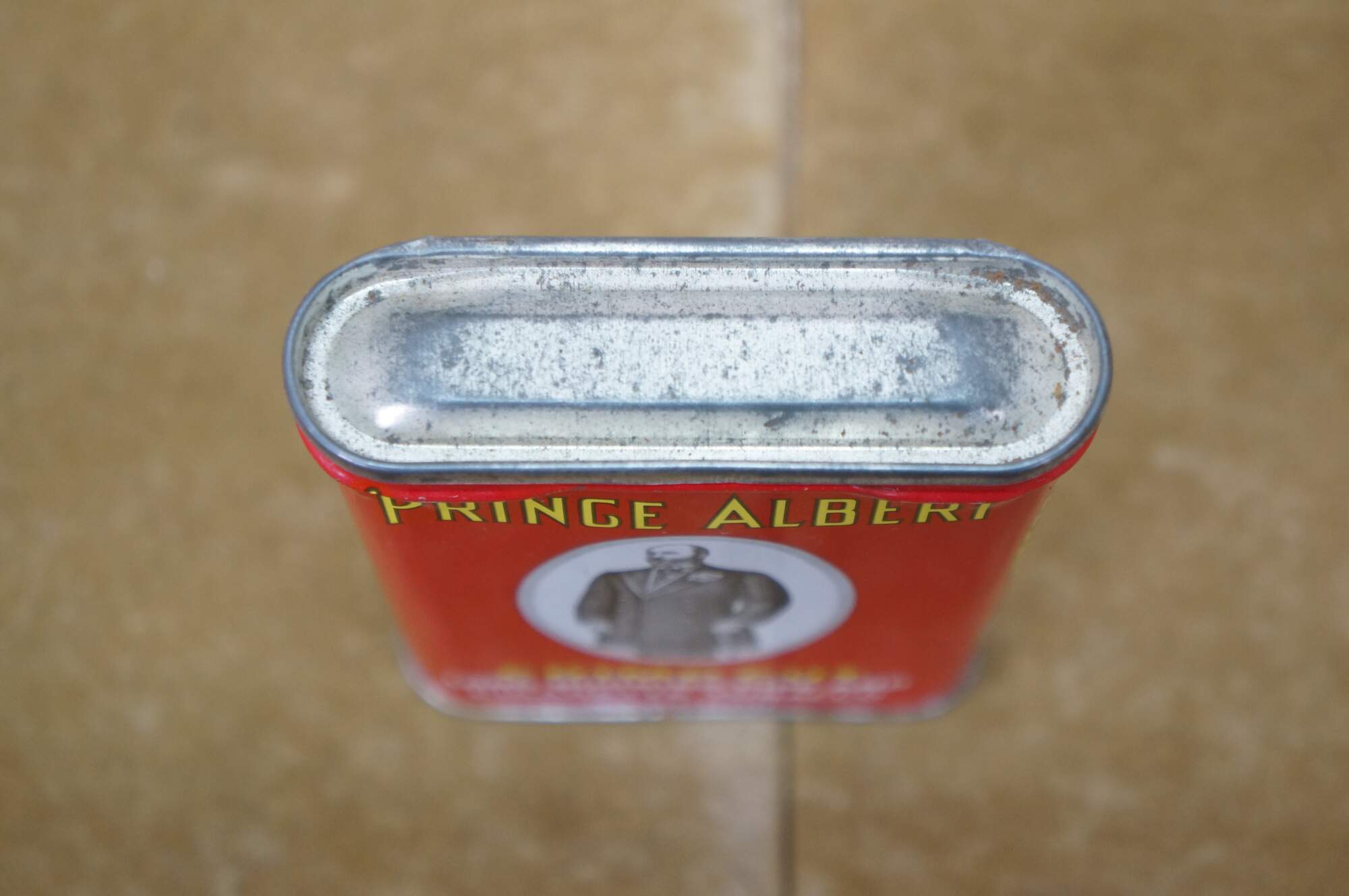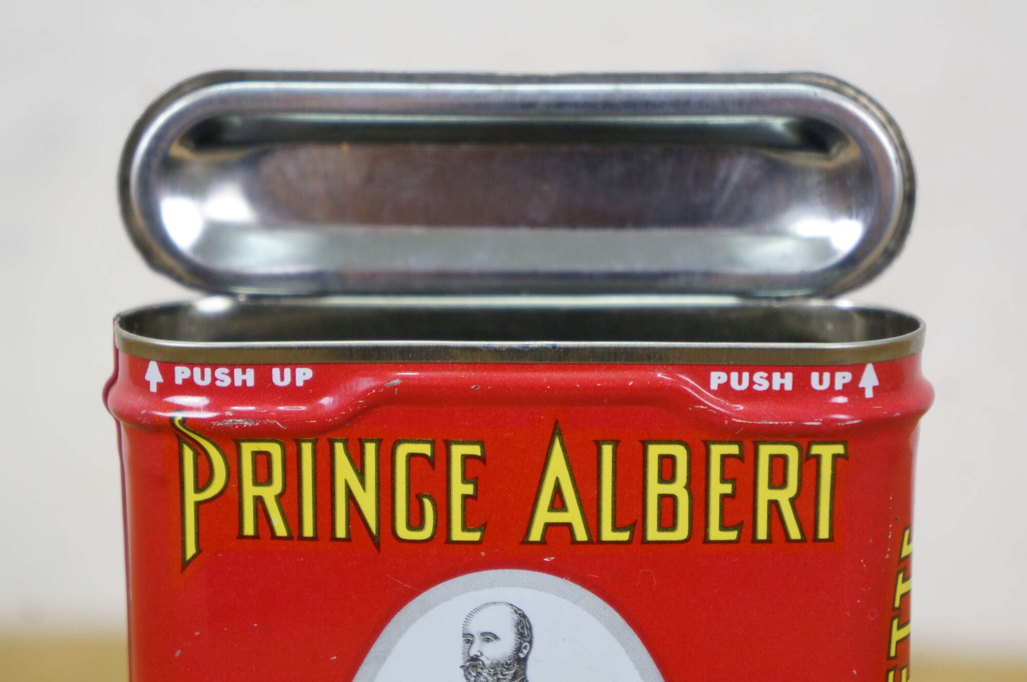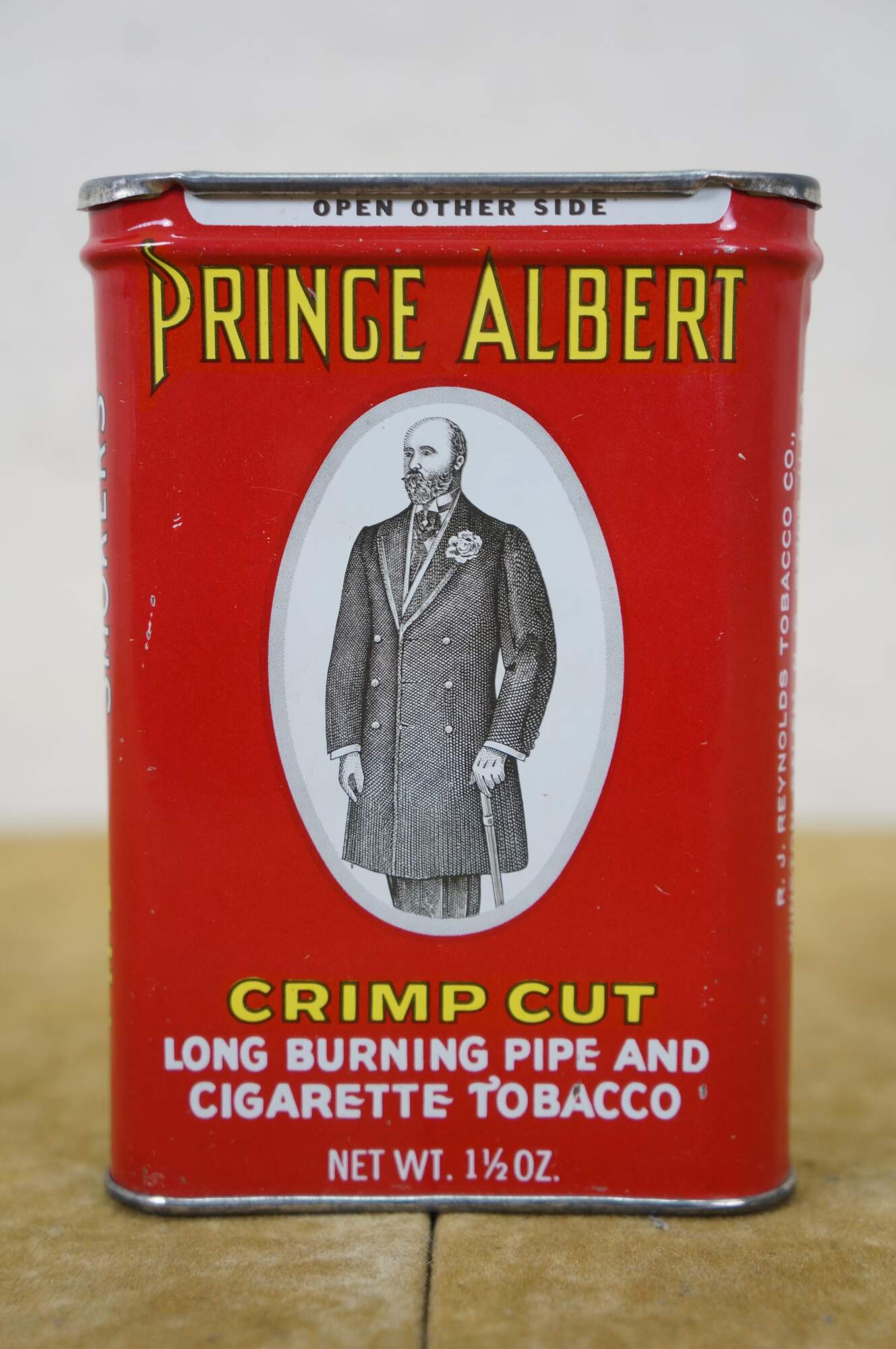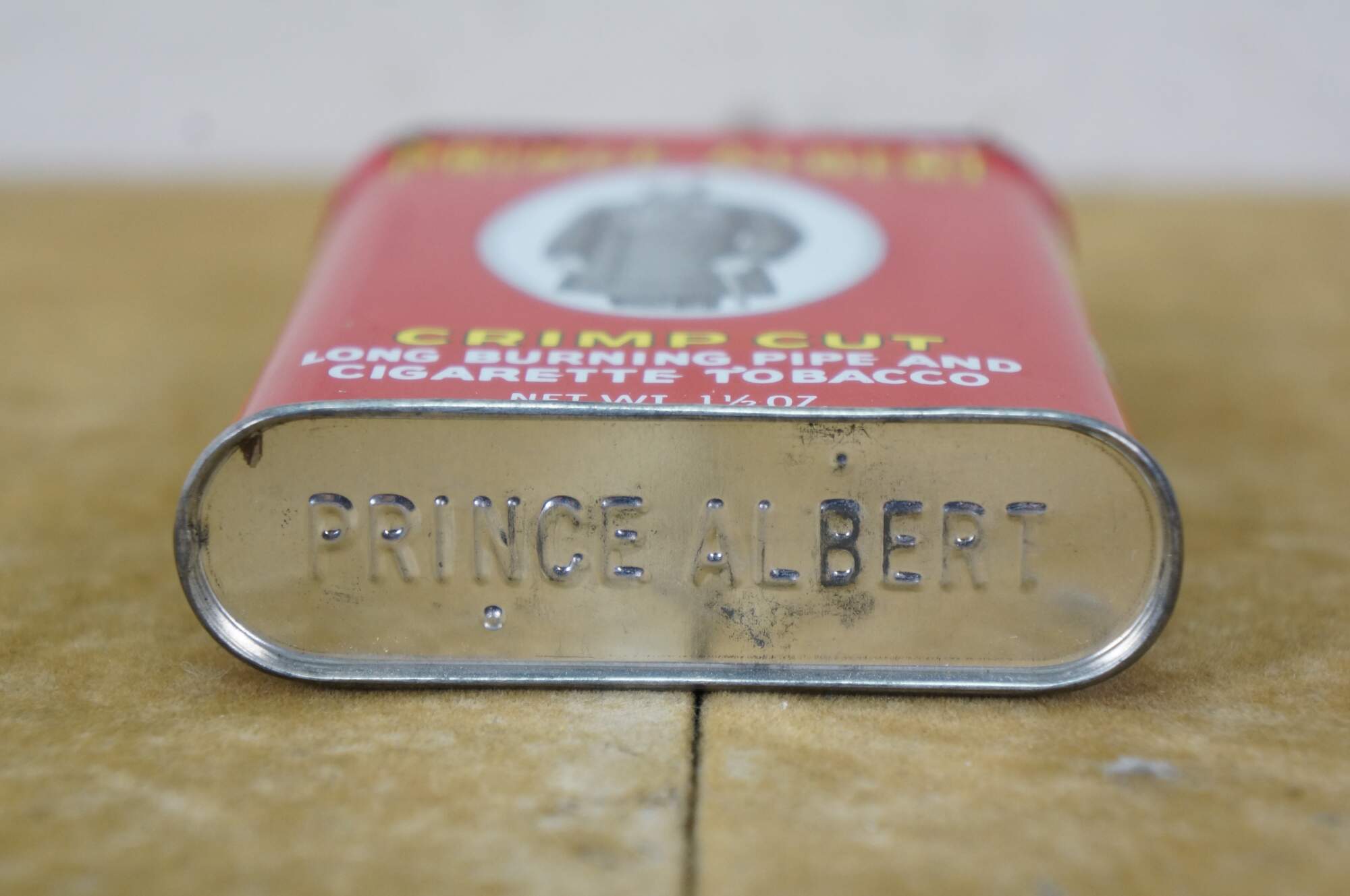 Vintage 20th century Prince Albert Crimp Cut Long Burning Pipe and Cigarette 1 1/2 Oz Tobacco tin. Painted red with yellow text and black and white portrait of Prince Albert. Flip to lid. Embossed brand name on base. Produced by the R.J. Reynolds tobacco Company, Winston-Salem, NC, USA.