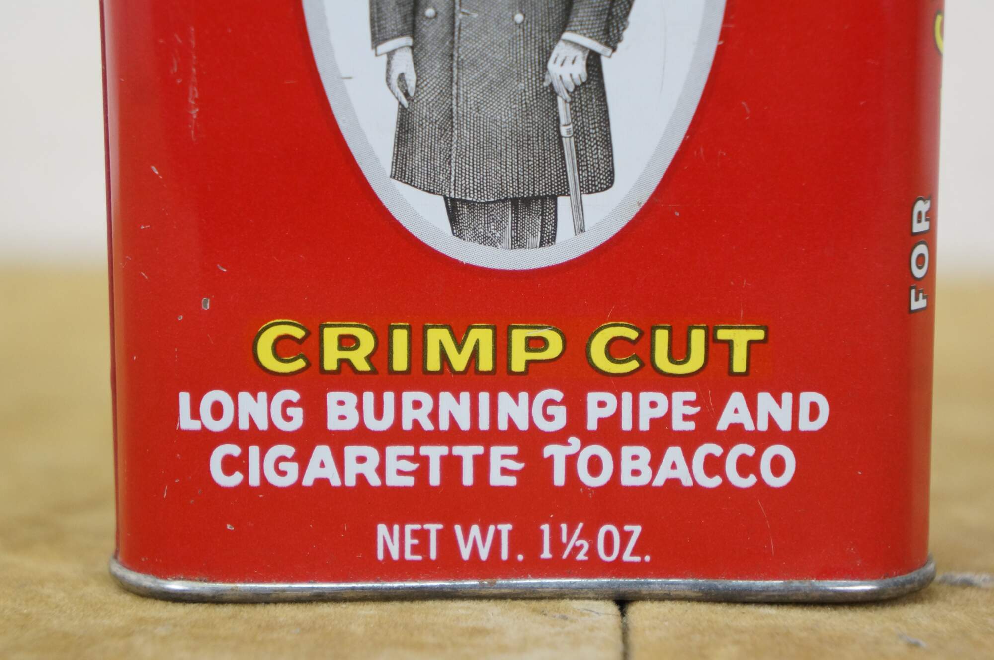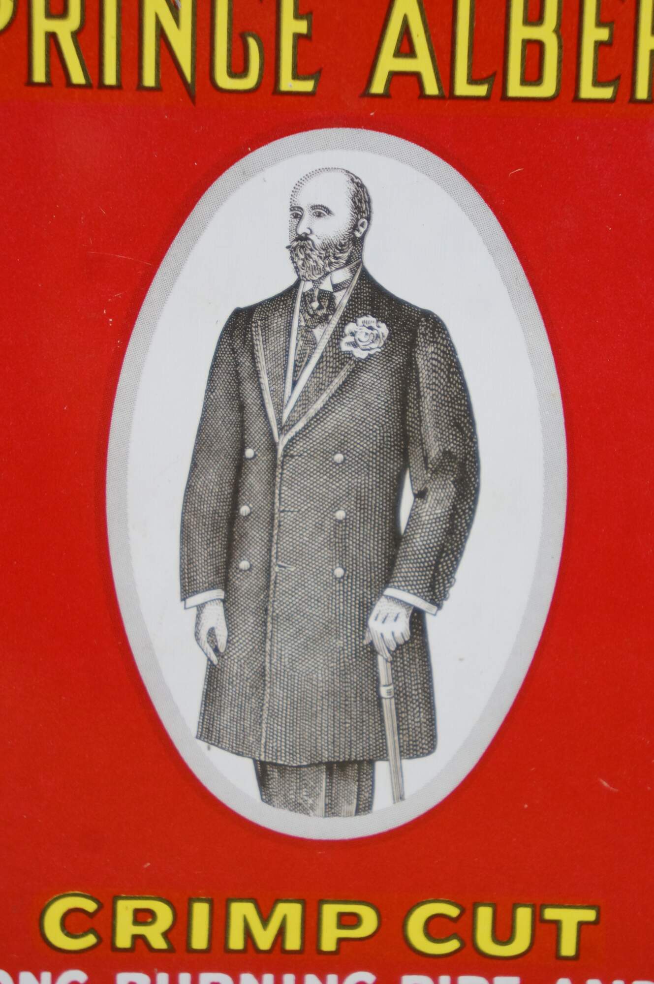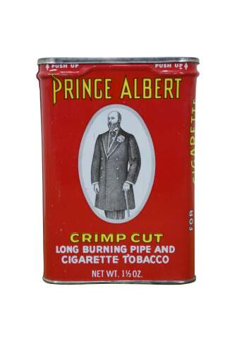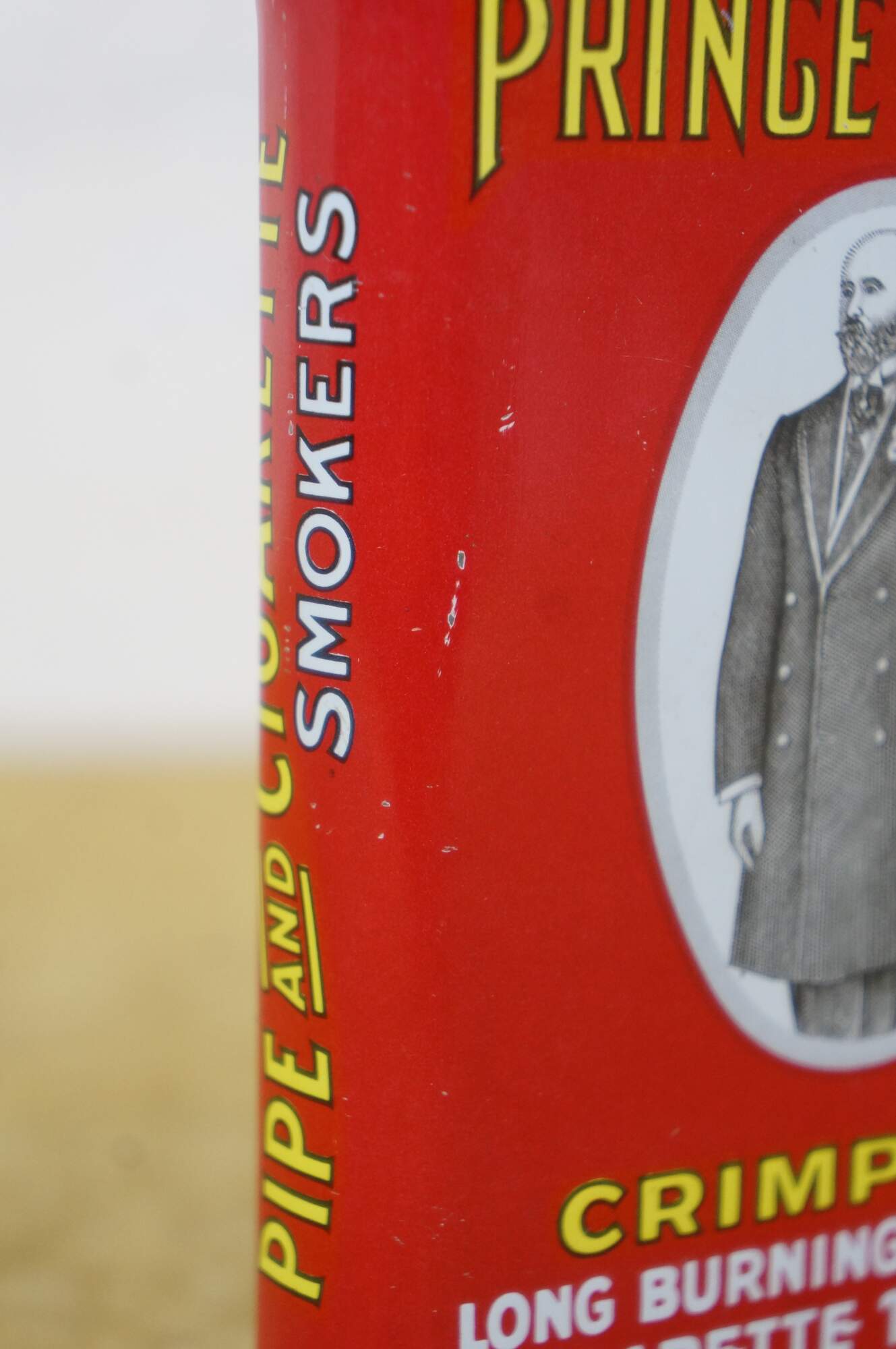 Vintage 20th century Prince Albert Crimp Cut Long Burning Pipe and Cigarette 1 1/2 Oz Tobacco tin. Painted red with yellow text and black and white portrait of Prince Albert. Flip to lid. Embossed brand name on base. Produced by the R.J. Reynolds tobacco Company, Winston-Salem, NC, USA.