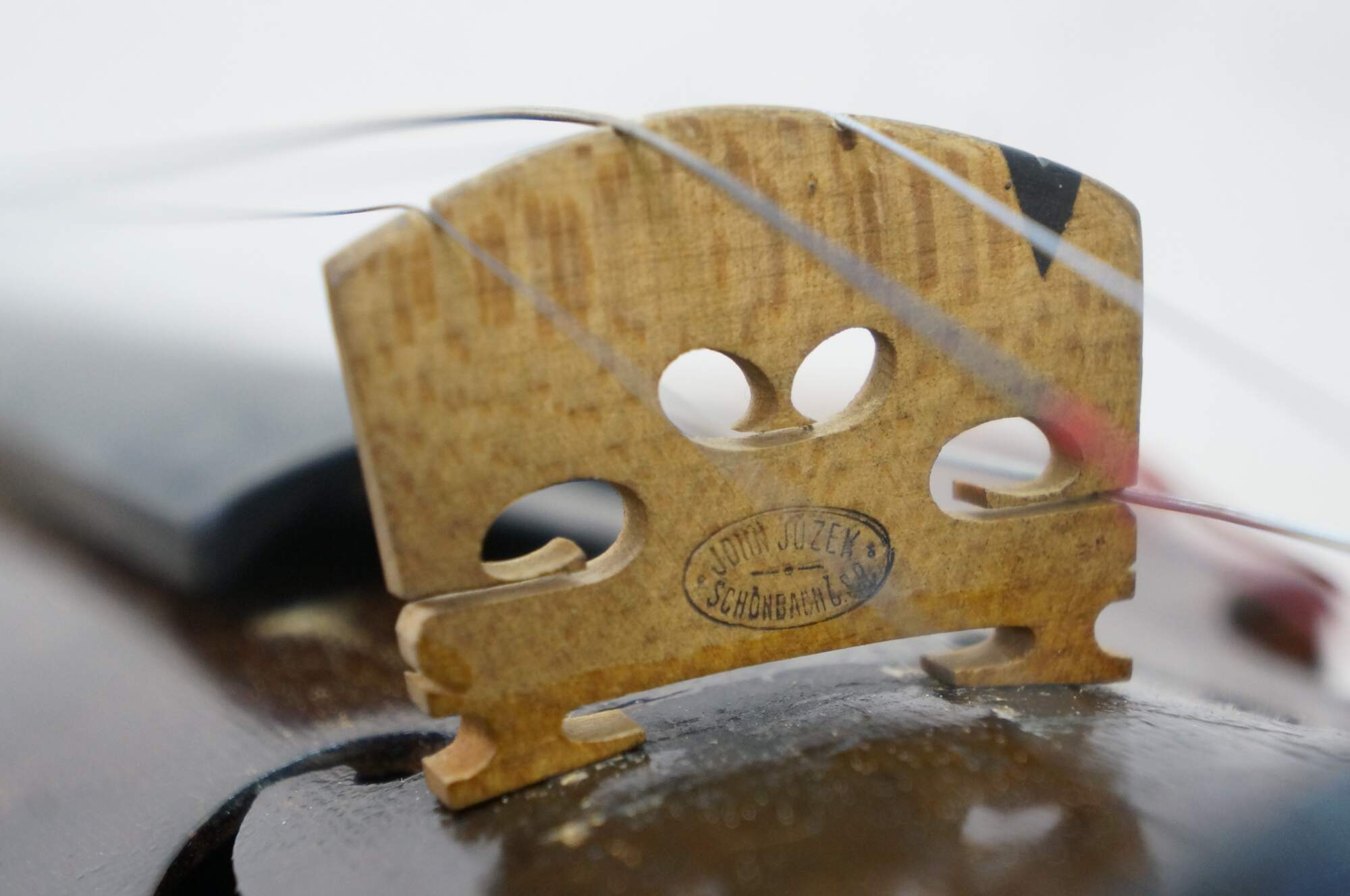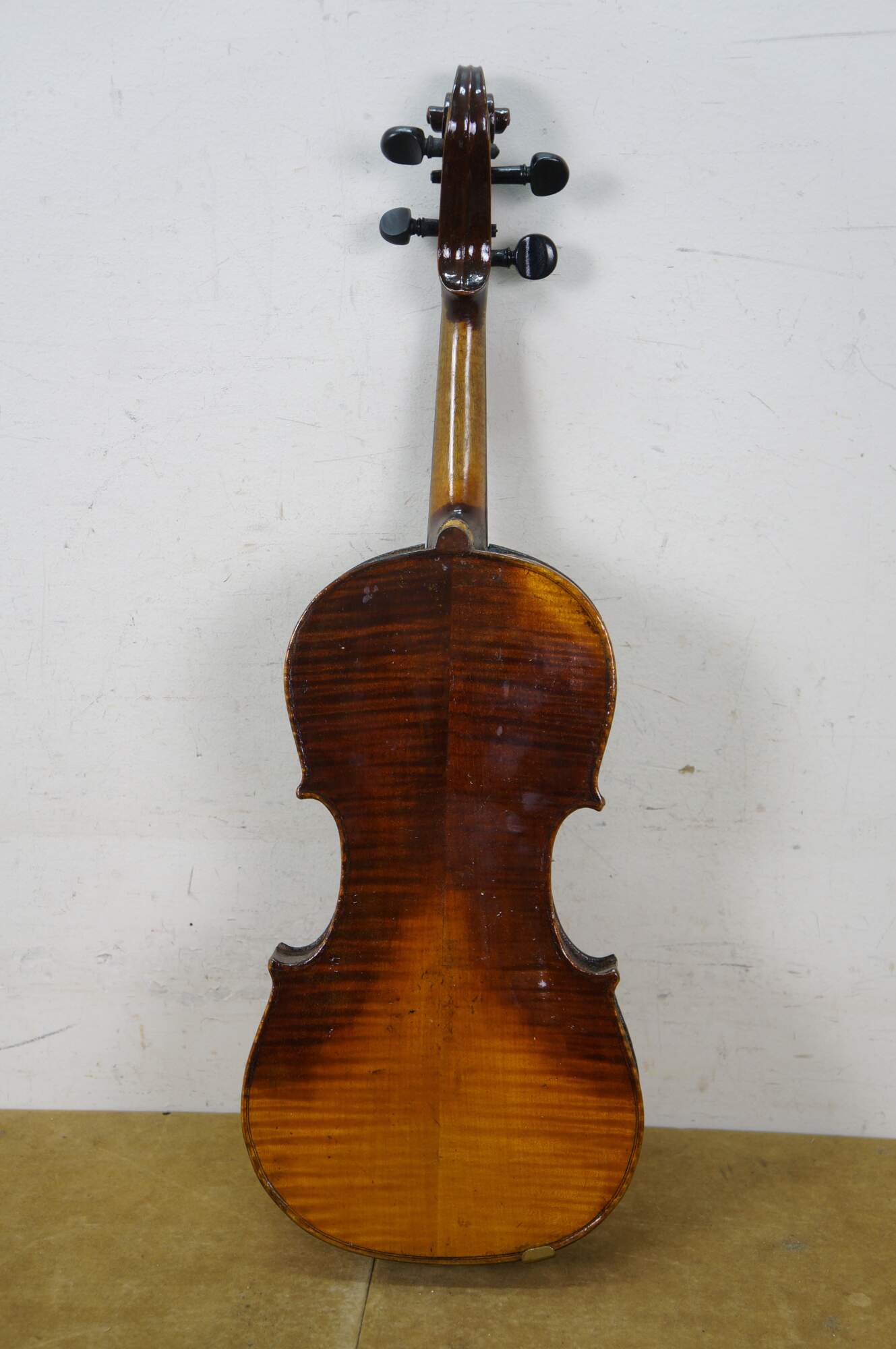 Needs restoration - Bow needs rehairing/missing knob; dings to violin surface; neck cracked/separating; needs work; scuffs/gentle wear to case exterior; one bow holder detached