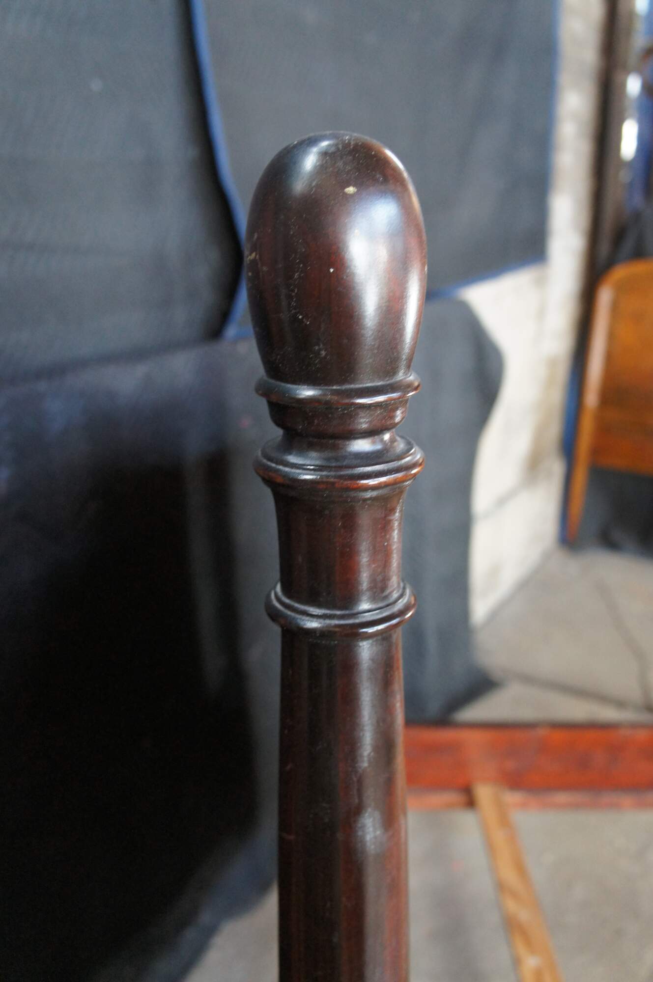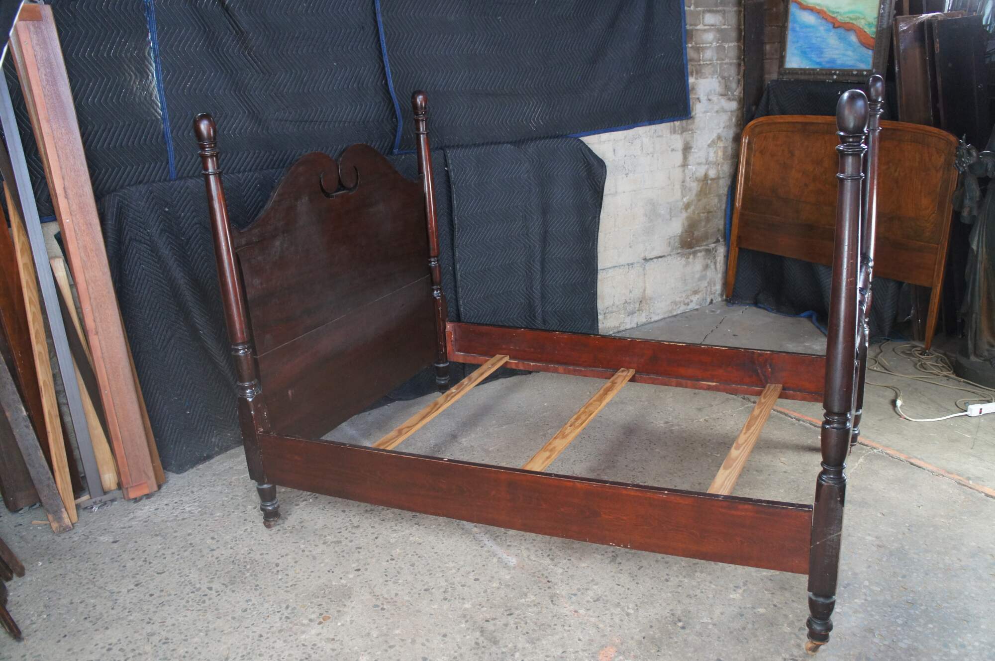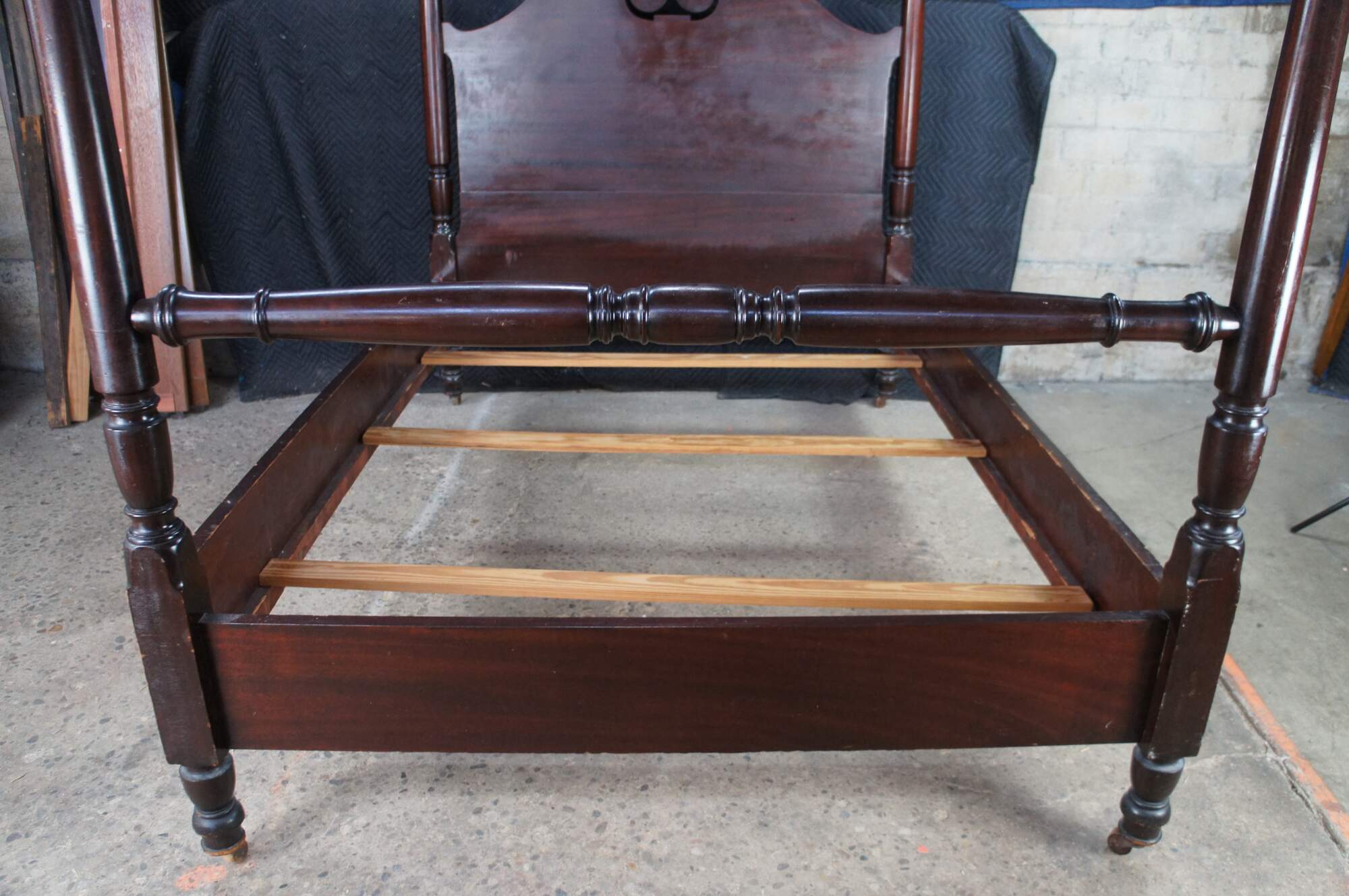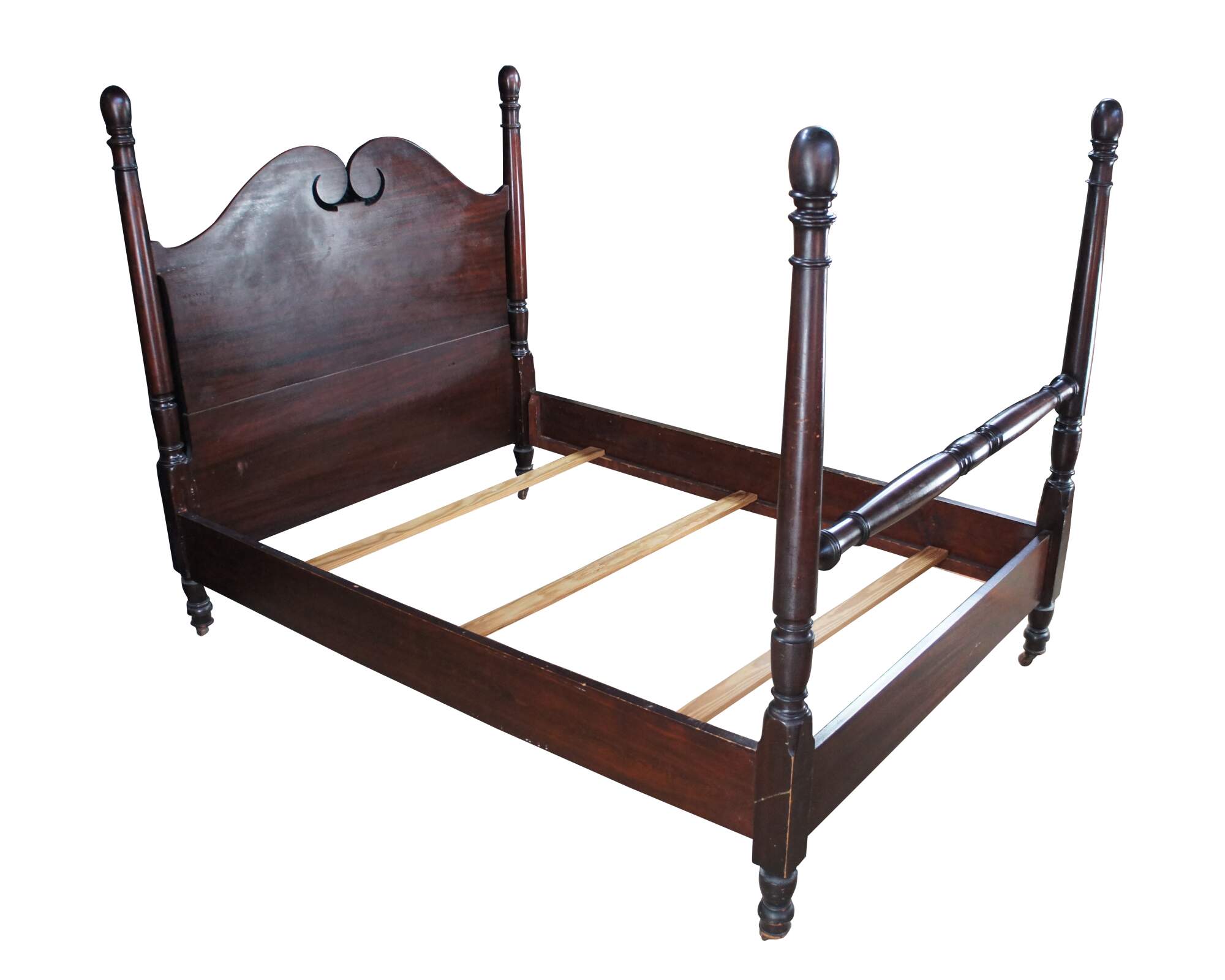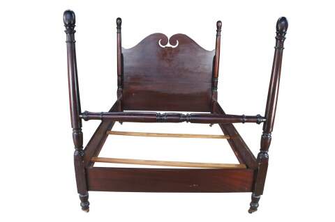 Antique Sheraton style mahogany full-size four-poster bed. Made from mahogany with an open pediment headboard featuring turned and fluted posts with trophy finials.
