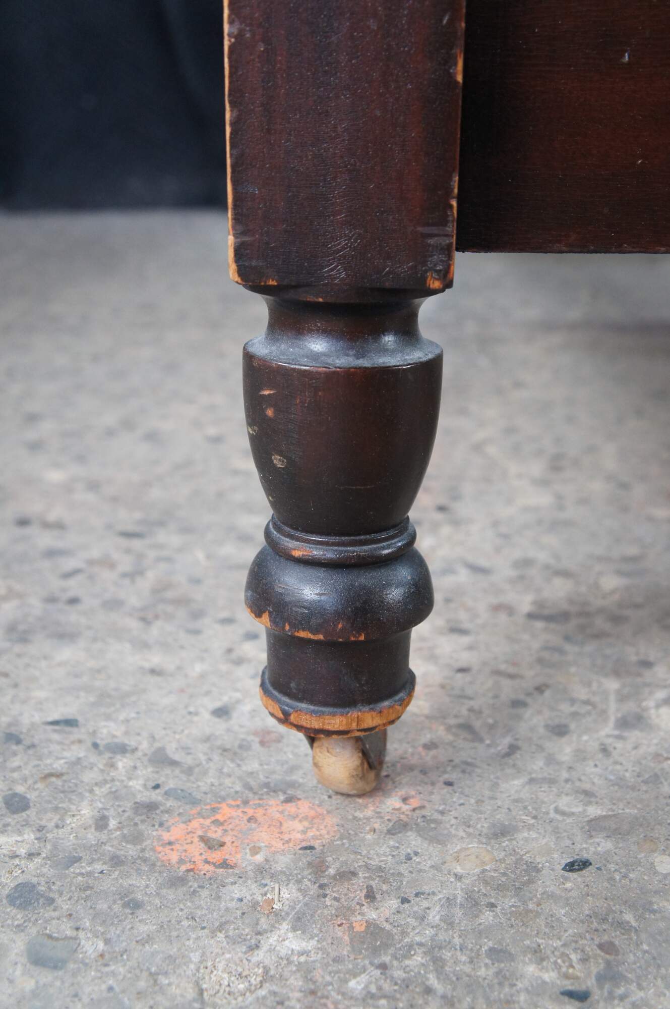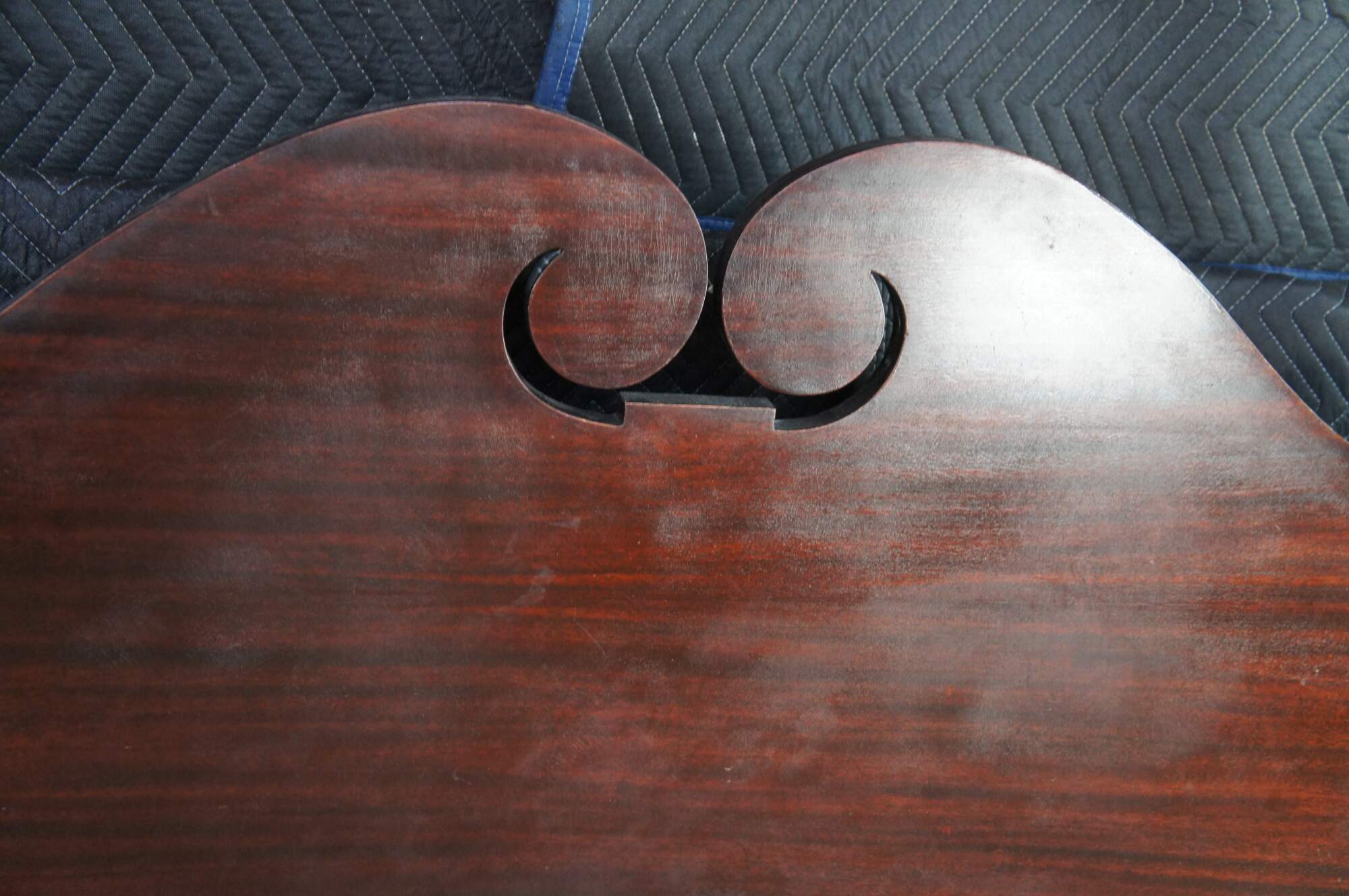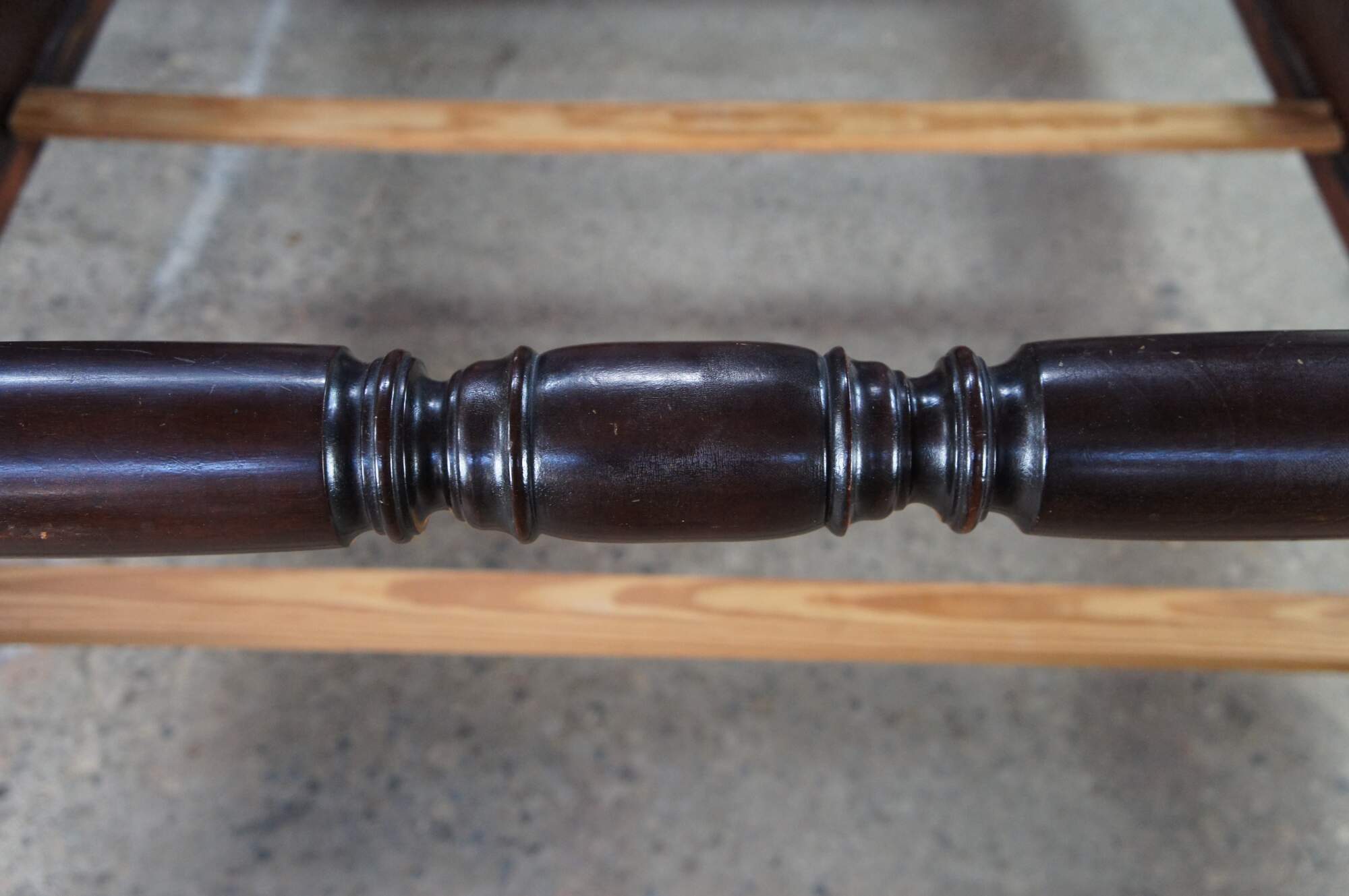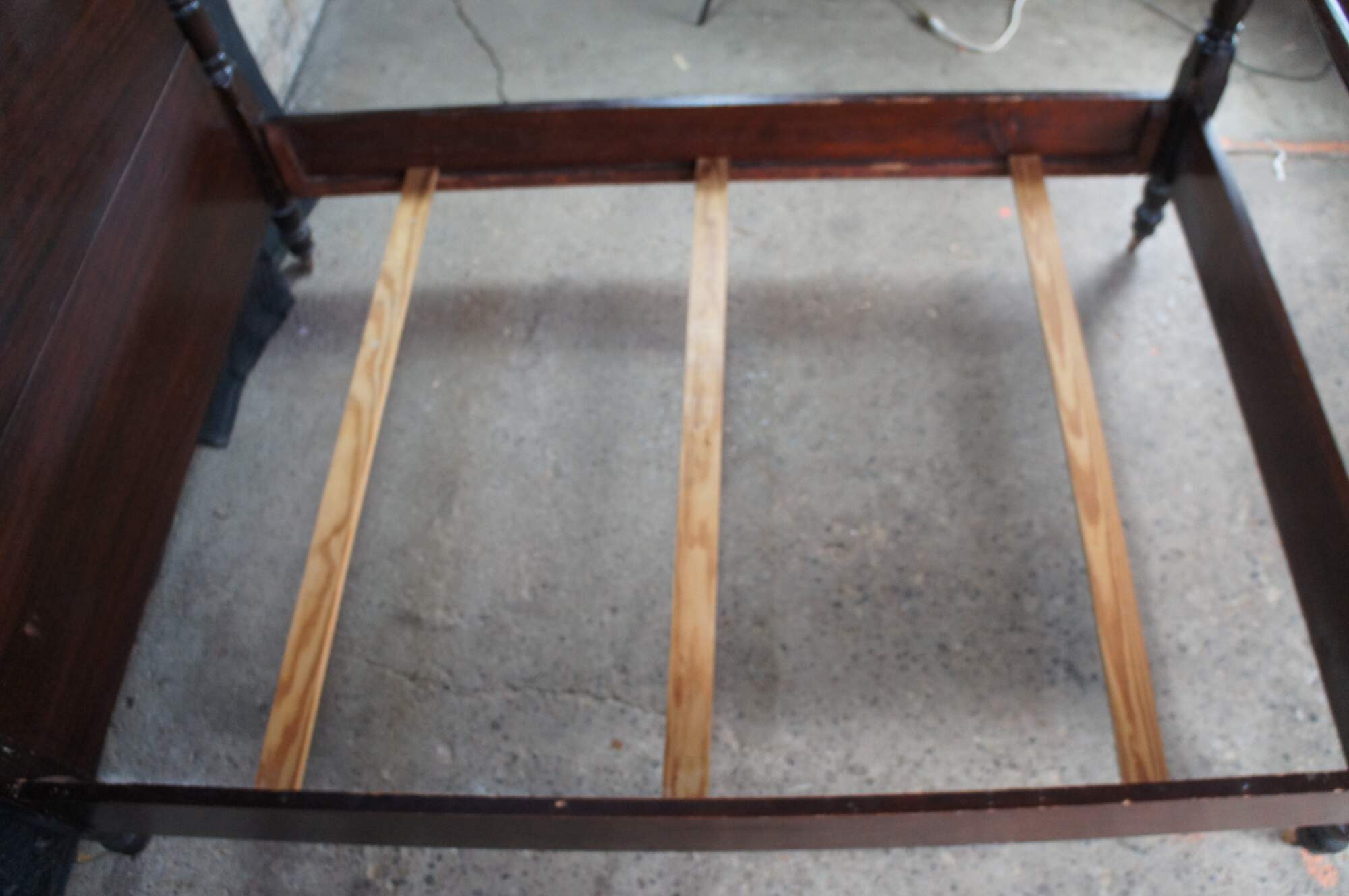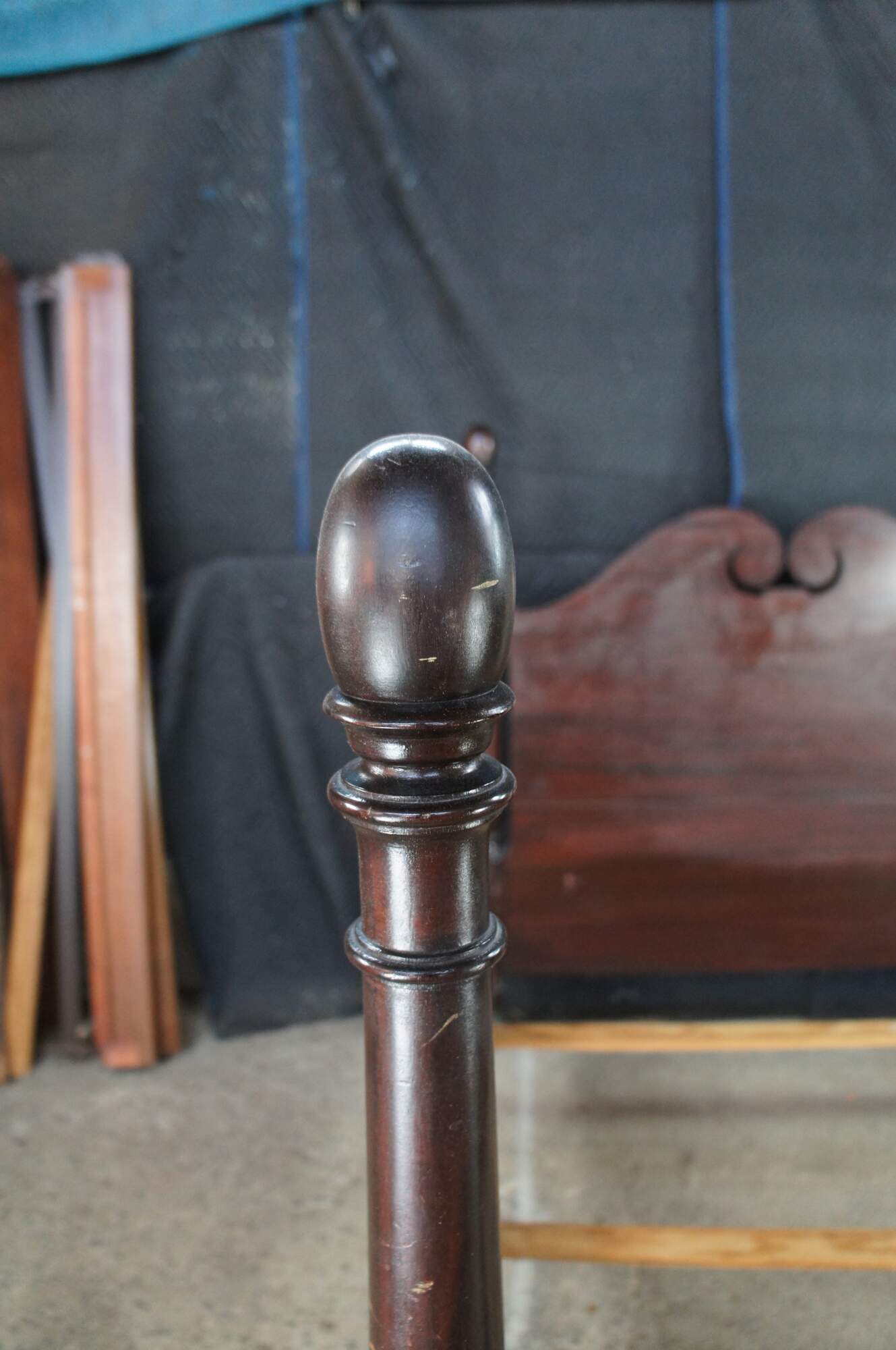 Antique Sheraton style mahogany full-size four-poster bed. Made from mahogany with an open pediment headboard featuring turned and fluted posts with trophy finials.