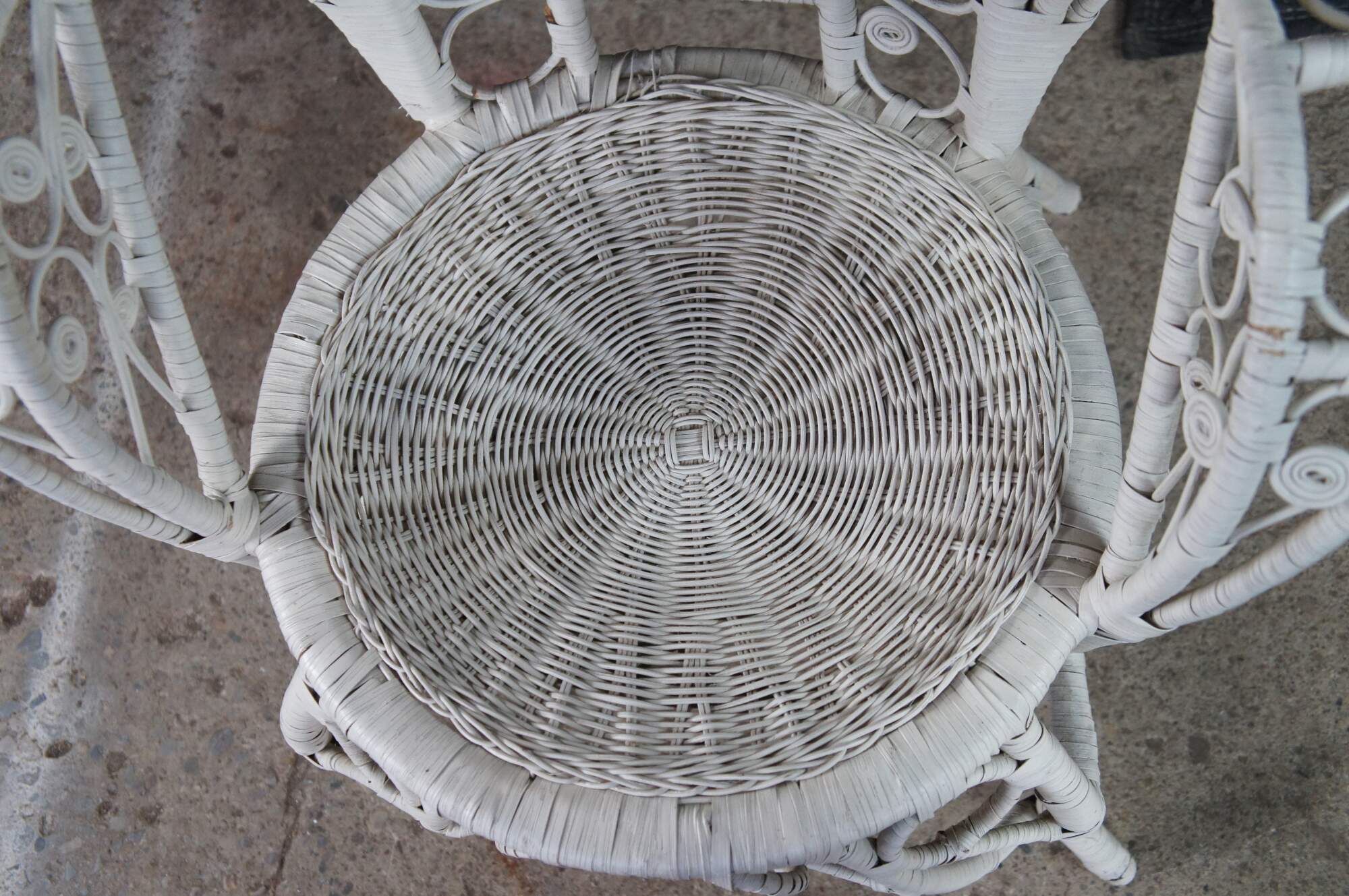 Antique Victorian woven wicker / rattan arm chair featuring a reticulated Peacock / fan back design with scrolled and beaded accents.