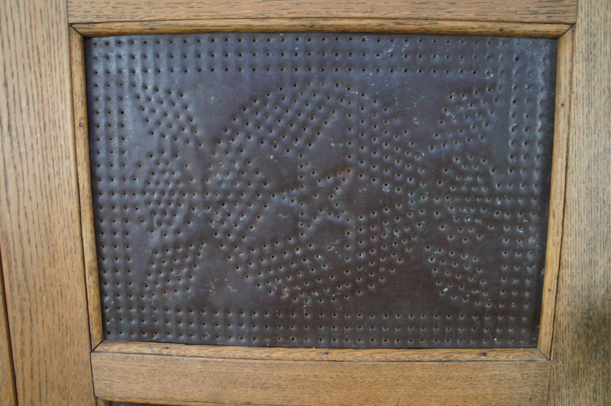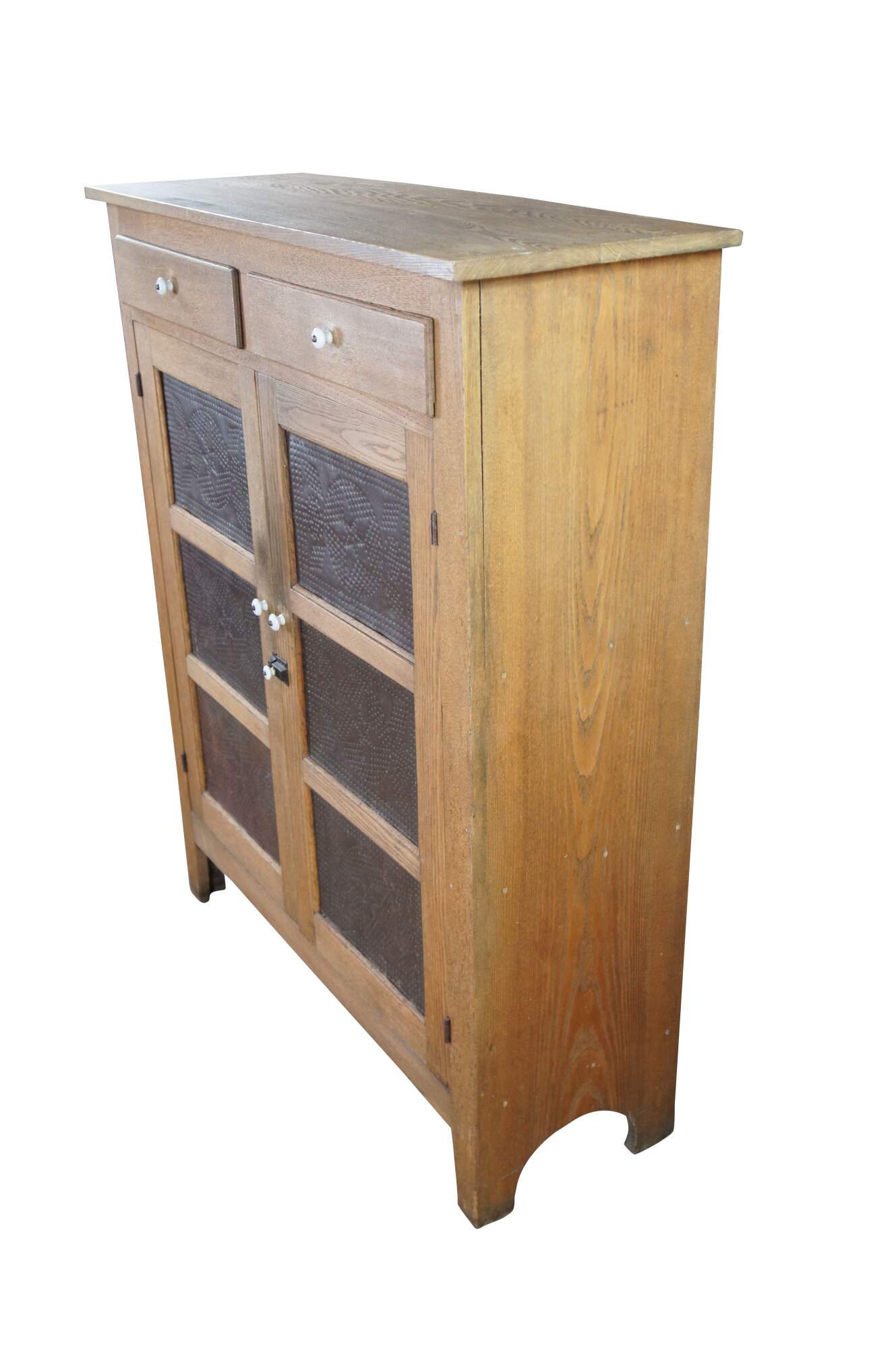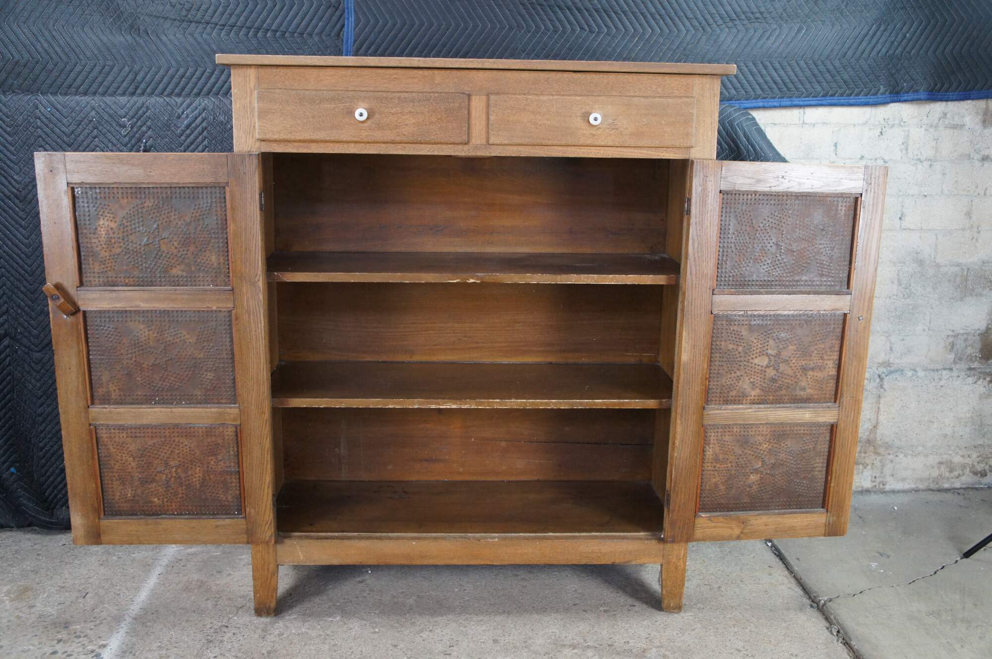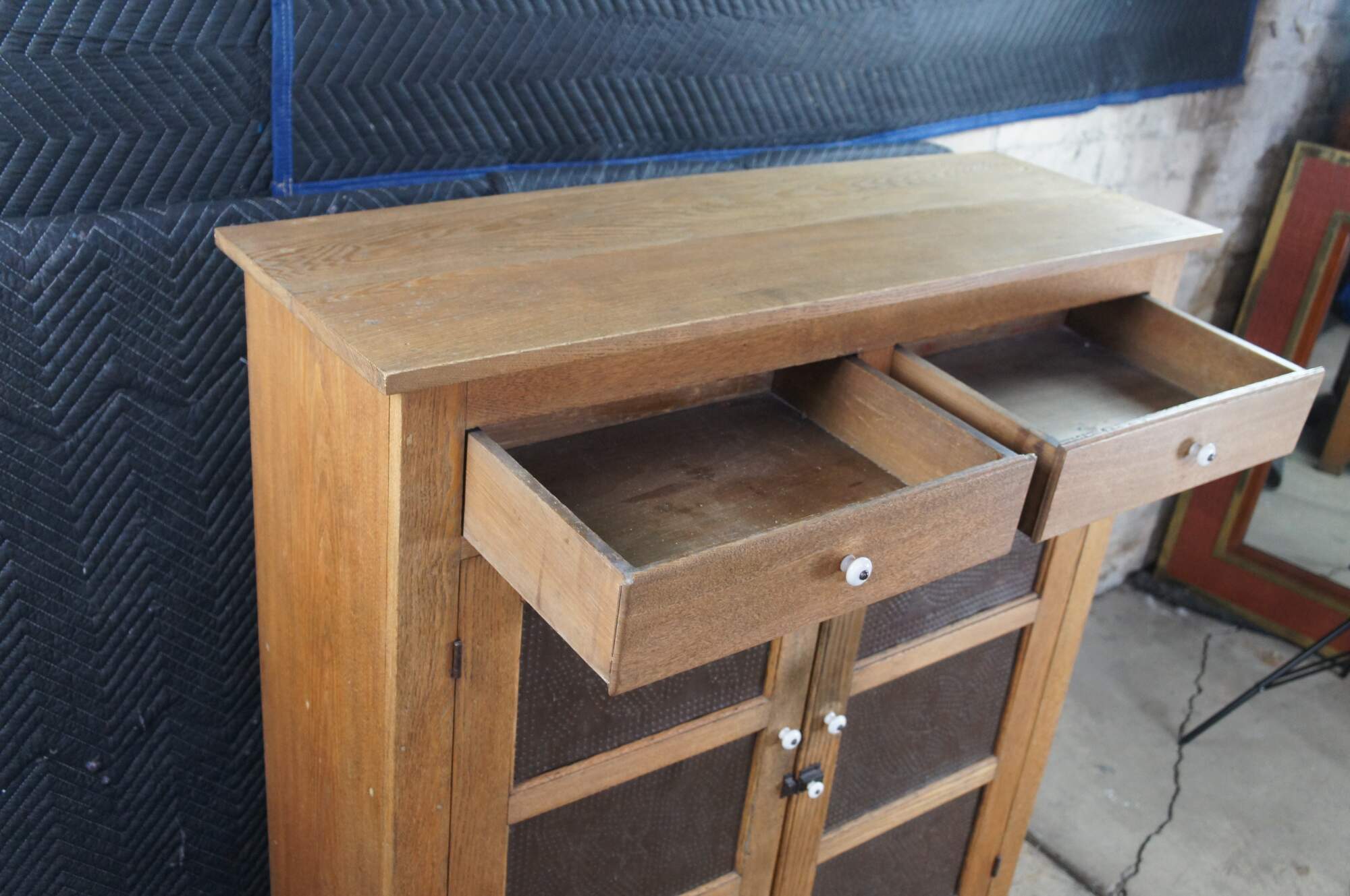 Antique Early American Country Farmhouse pie safe / cupboard / jelly cabinet, kitchen pantry. Made of quartersawn oak featuring punched tin panels with three shelves and two drawers.