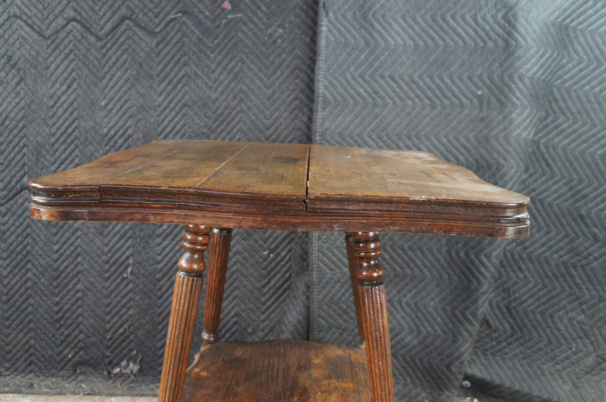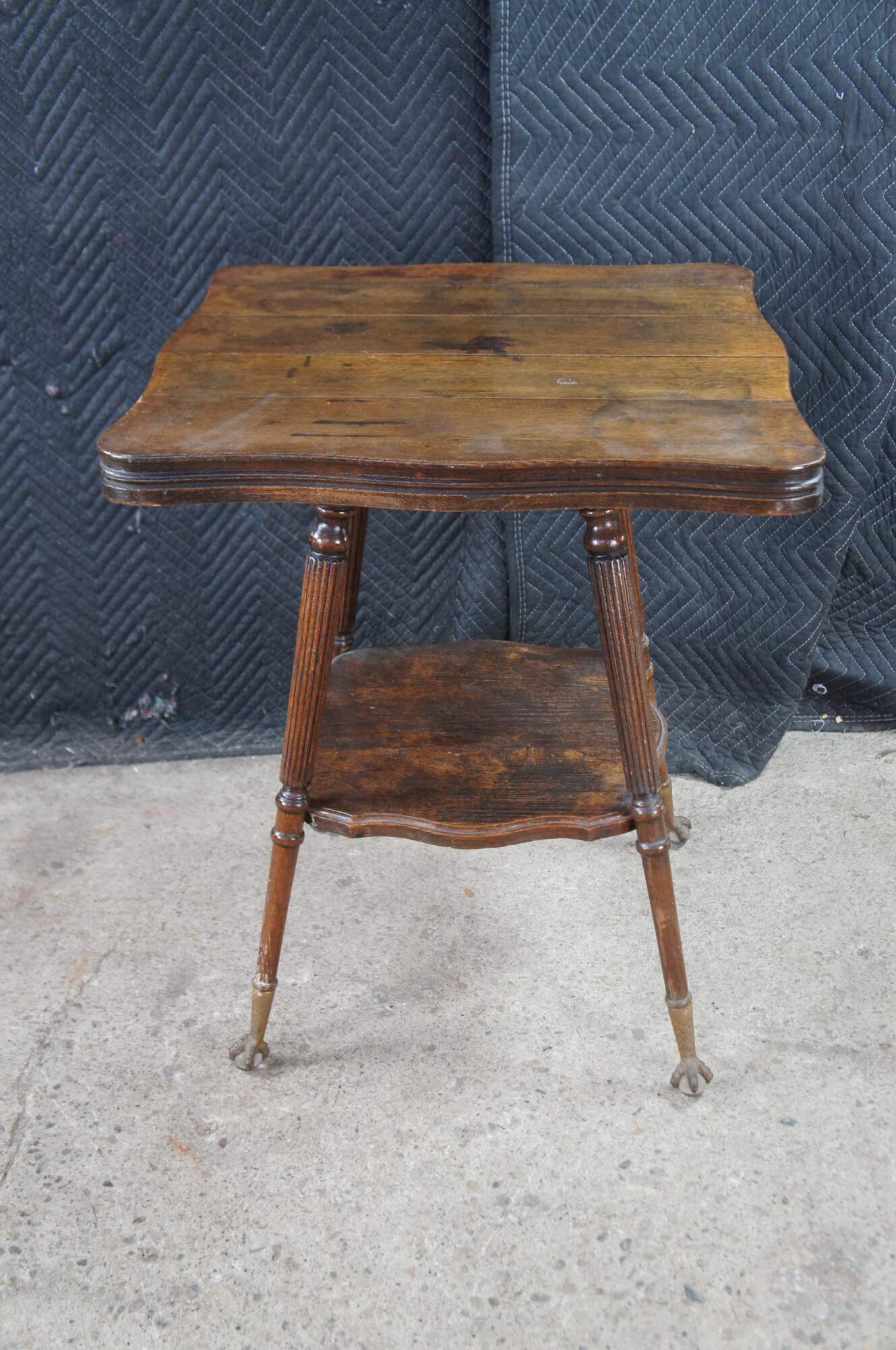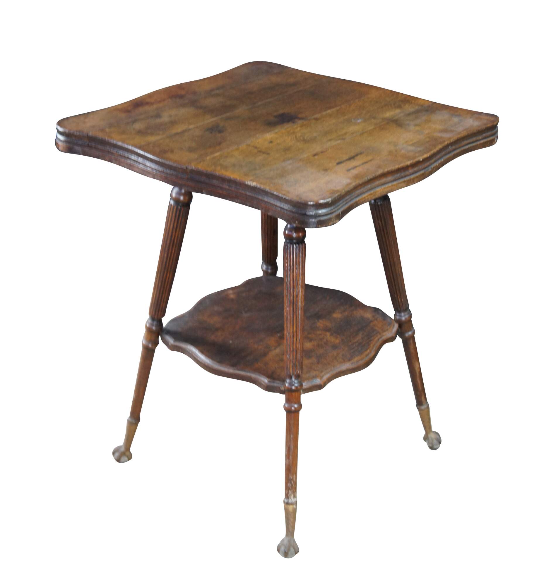 Antique Victorian Eastlake style parlor center pedestal table. Made of quartersawn oak featuring two tiers with serpentine accents connected by long turned and fluted legs with brass eagle claw and ball feet.