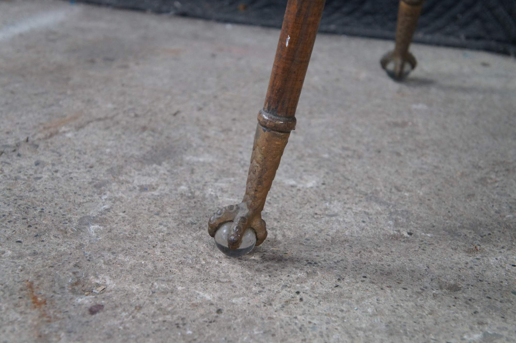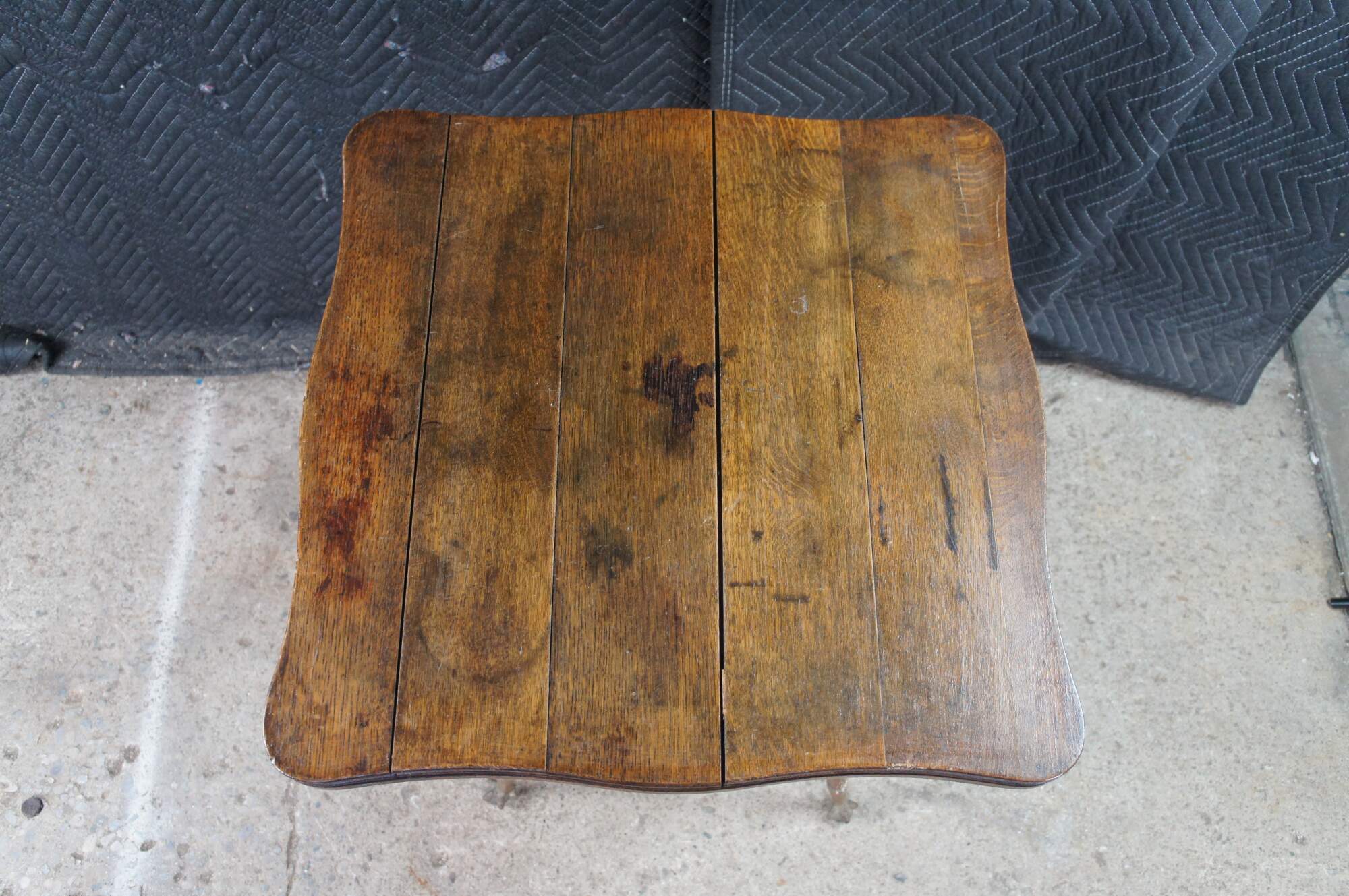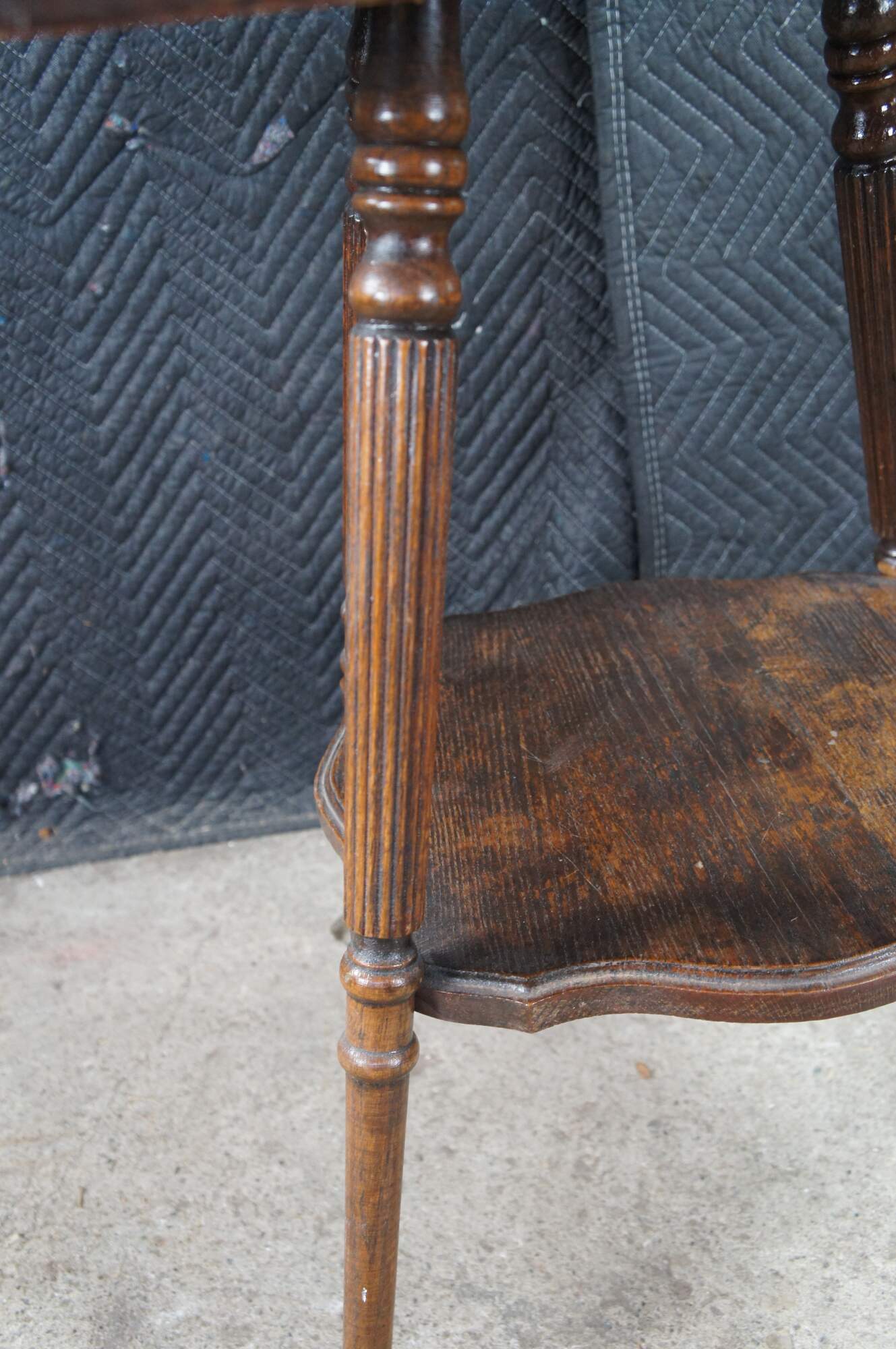 Antique Victorian Eastlake style parlor center pedestal table. Made of quartersawn oak featuring two tiers with serpentine accents connected by long turned and fluted legs with brass eagle claw and ball feet.