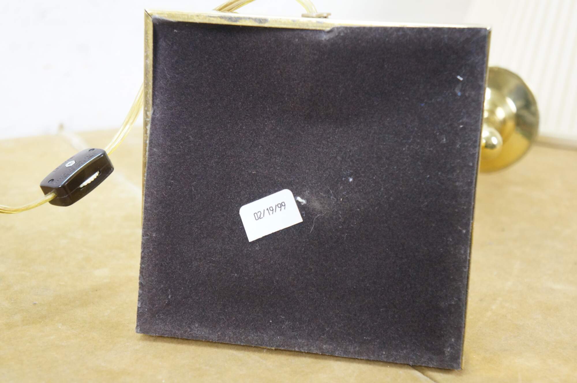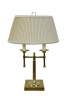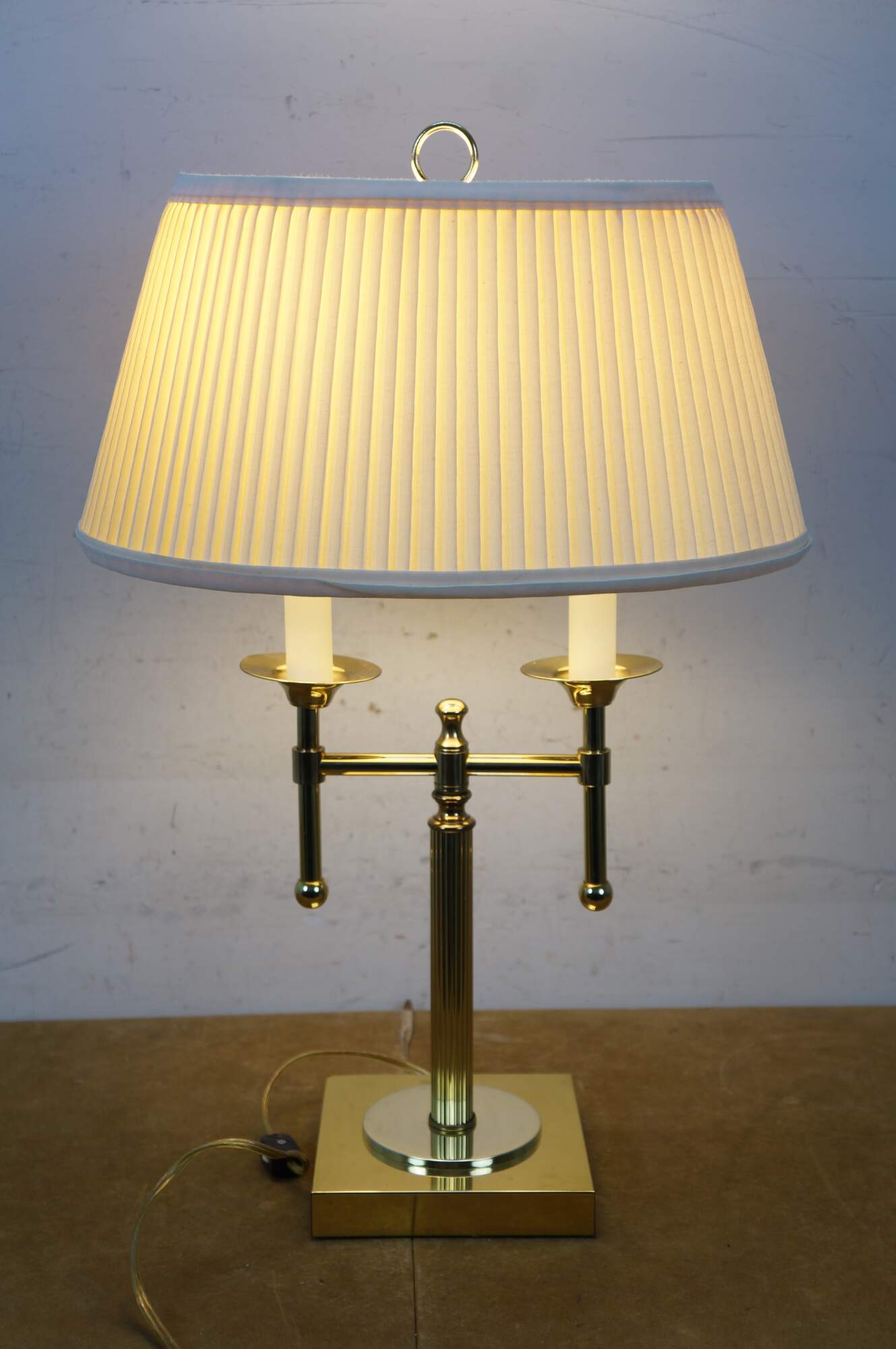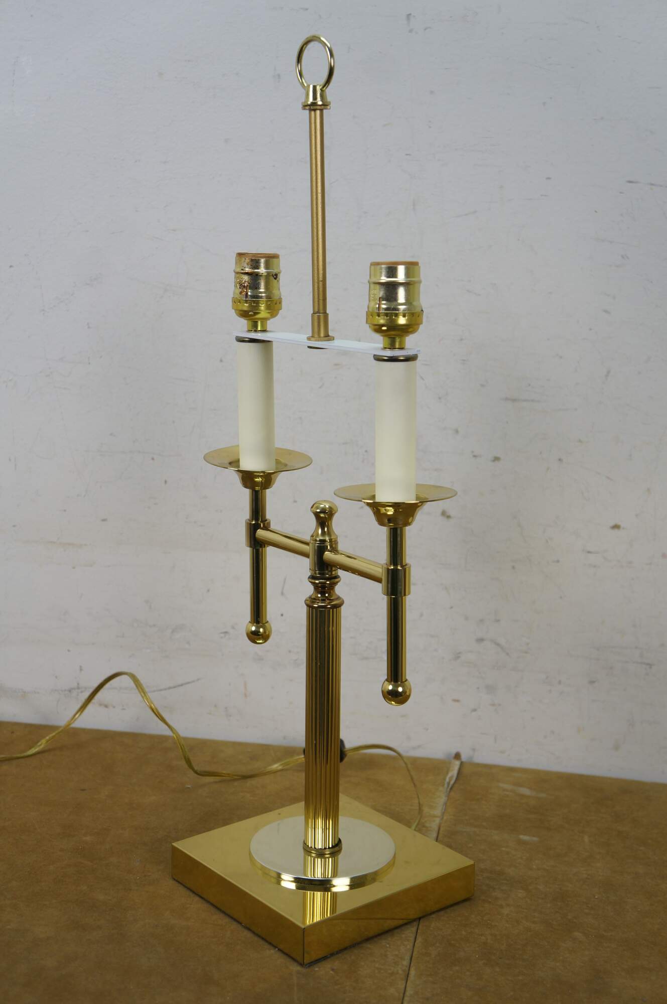 Vintage 1999 Robert Abbey brass French bouillotte style table lamp. Bright lacquered brass; square base and fluted center column supporting two faux candlestick arms. Ring shaped finial and white fabric shade. Switch on cord.