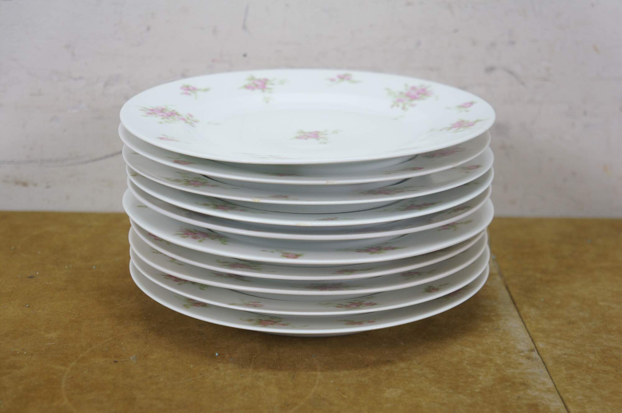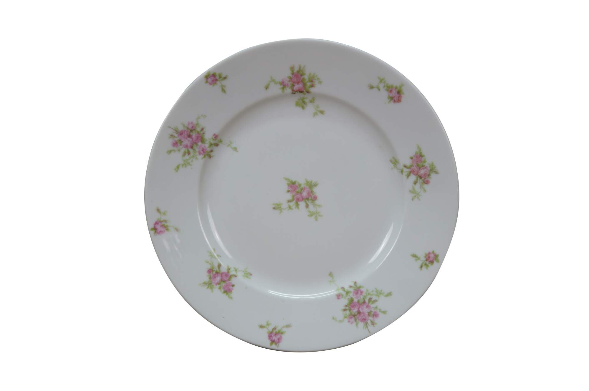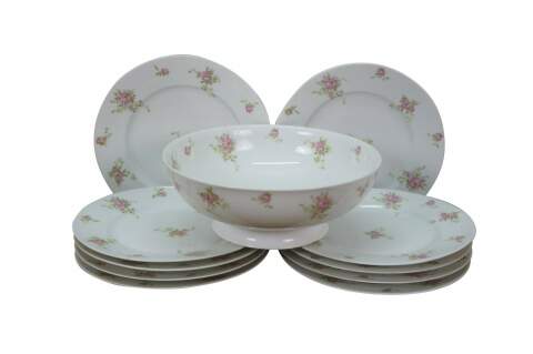 Early 20th century salad plates and serving bowl by Charles Ahrenfeldt for Higgins & Seiter, New York. White French Limoges porcelain decorated with clusters of pink roses. 9 plates, 1 bowl.