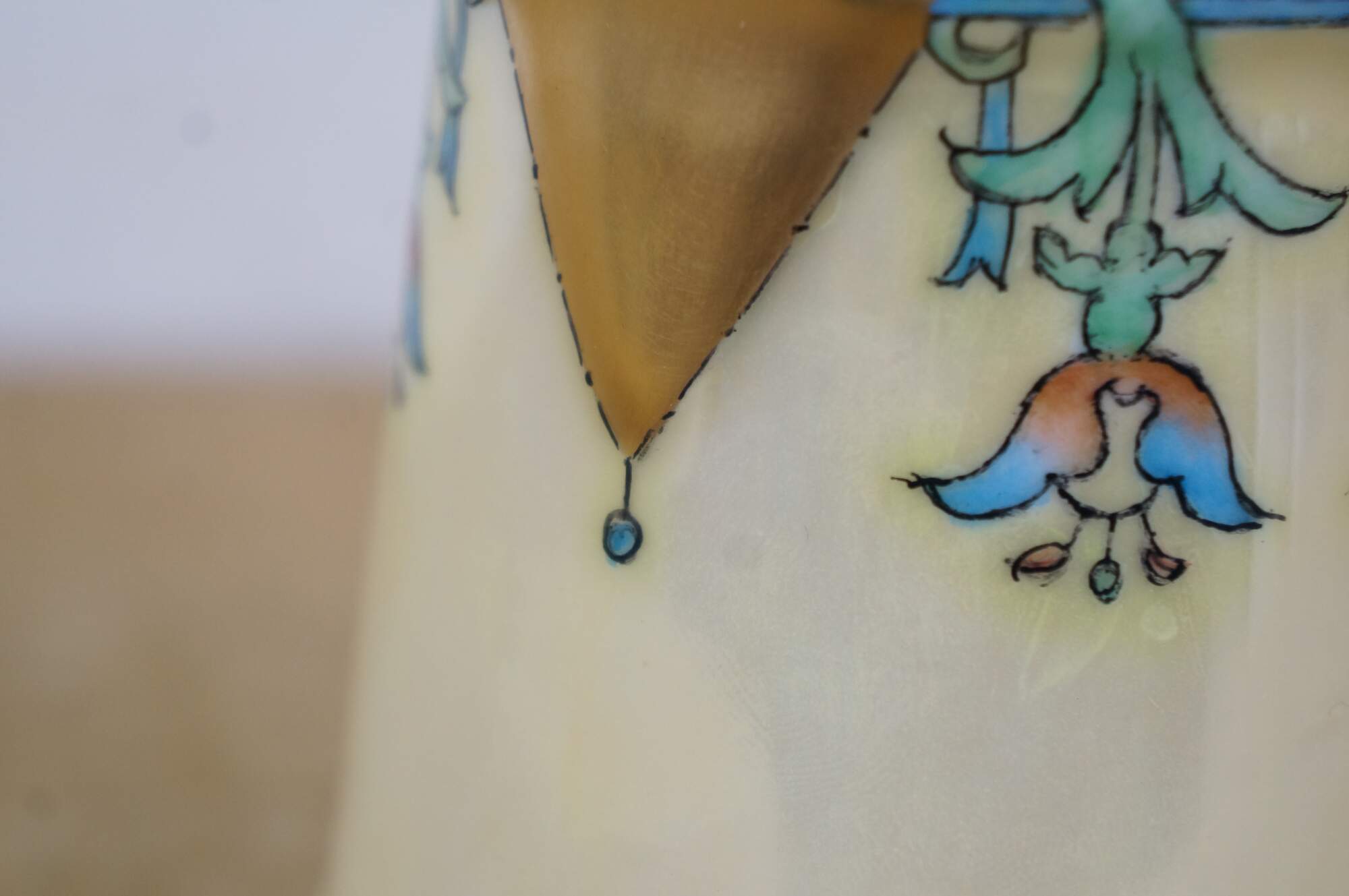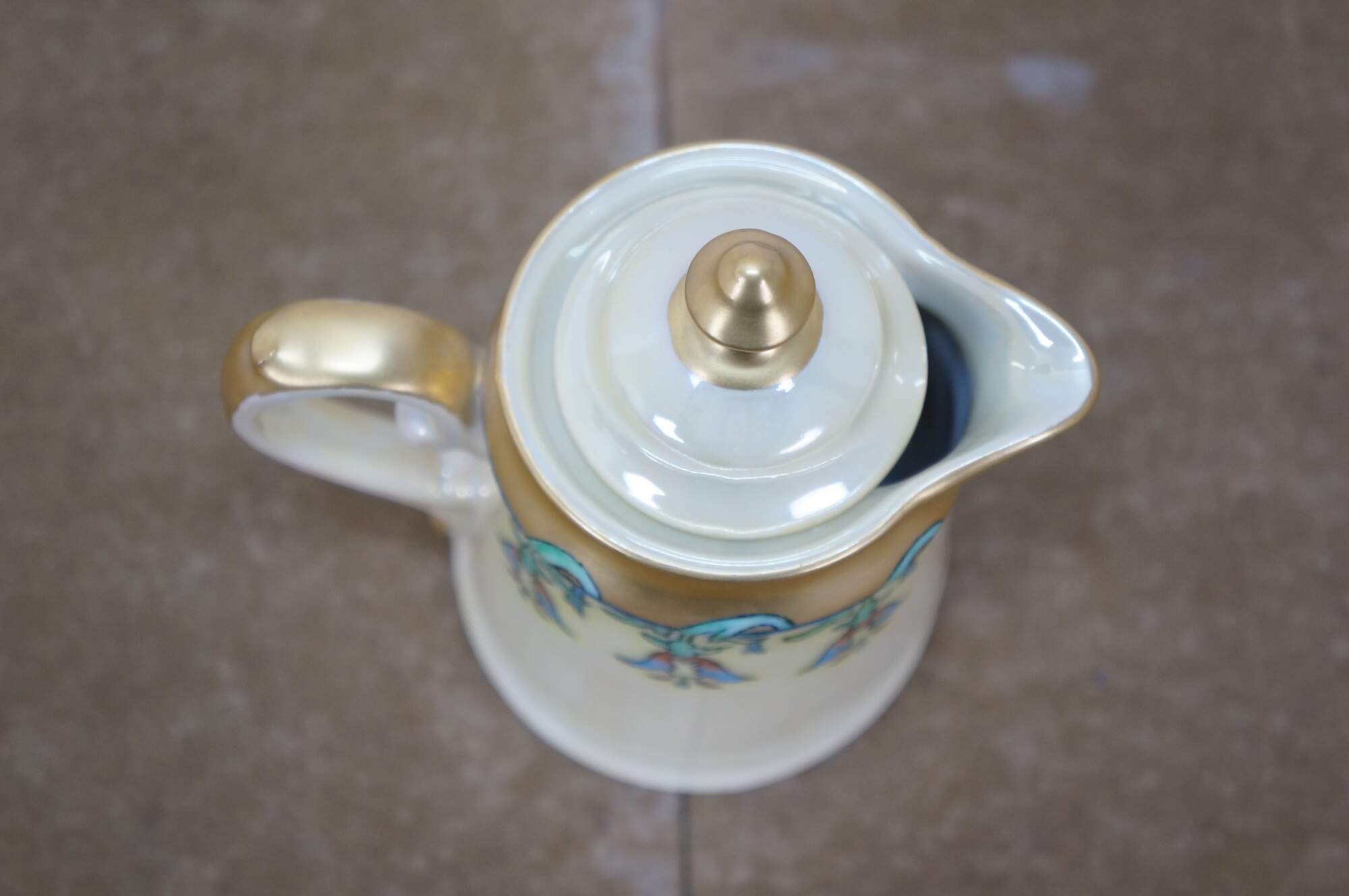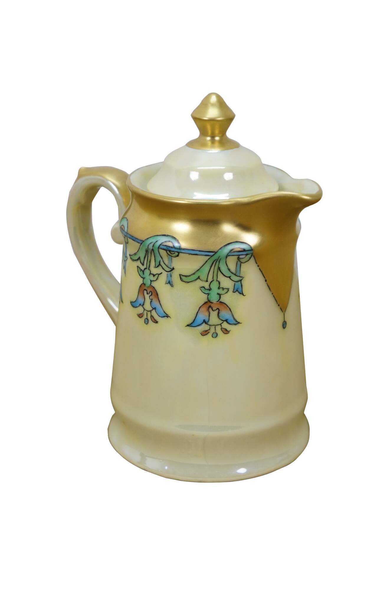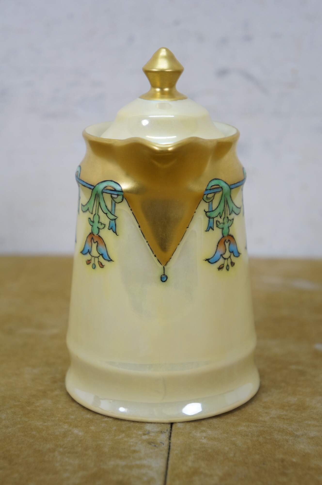 Late 19th to early 20th century pale yellow lustreware porcelain miniature teapot / creamer / syrup pitcher with lid. Gilt details and hand painted trim of dropping art nouveau / art deco style lilies. Signed on base Cara L. Willis.