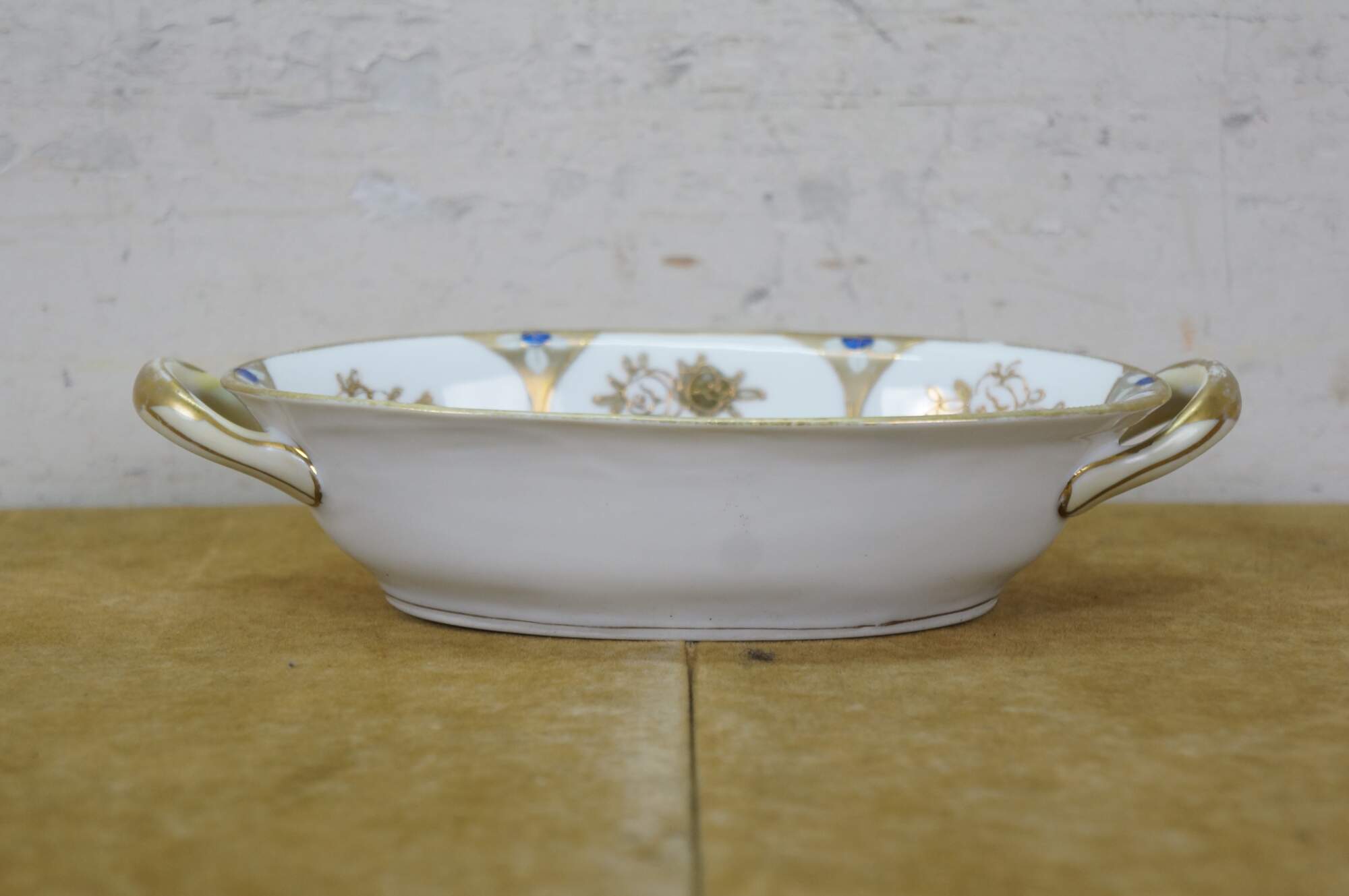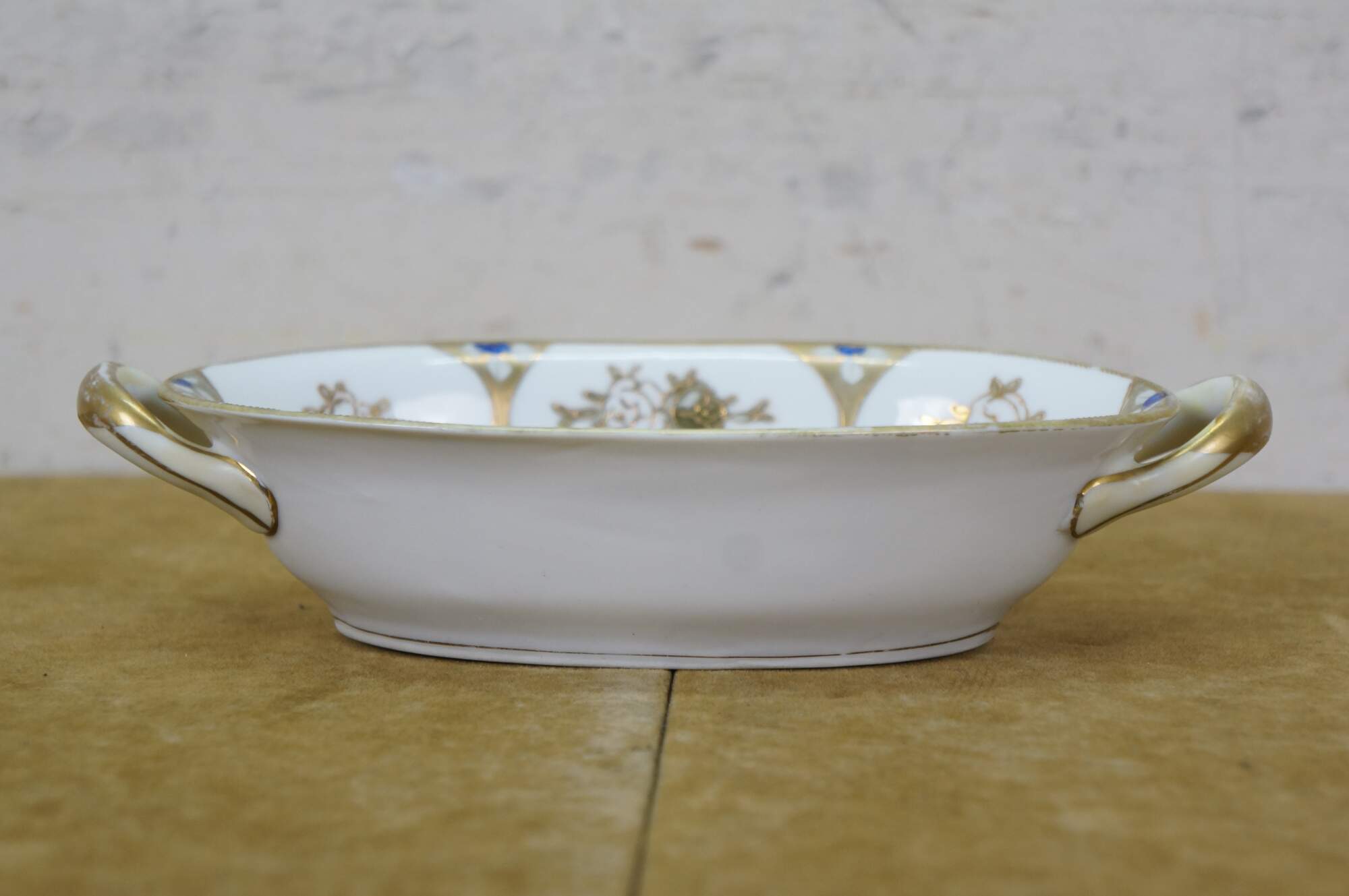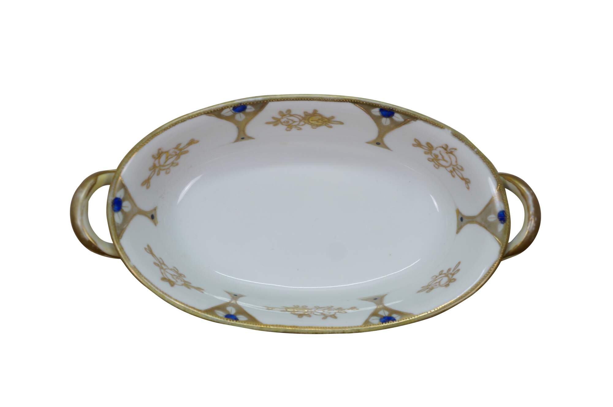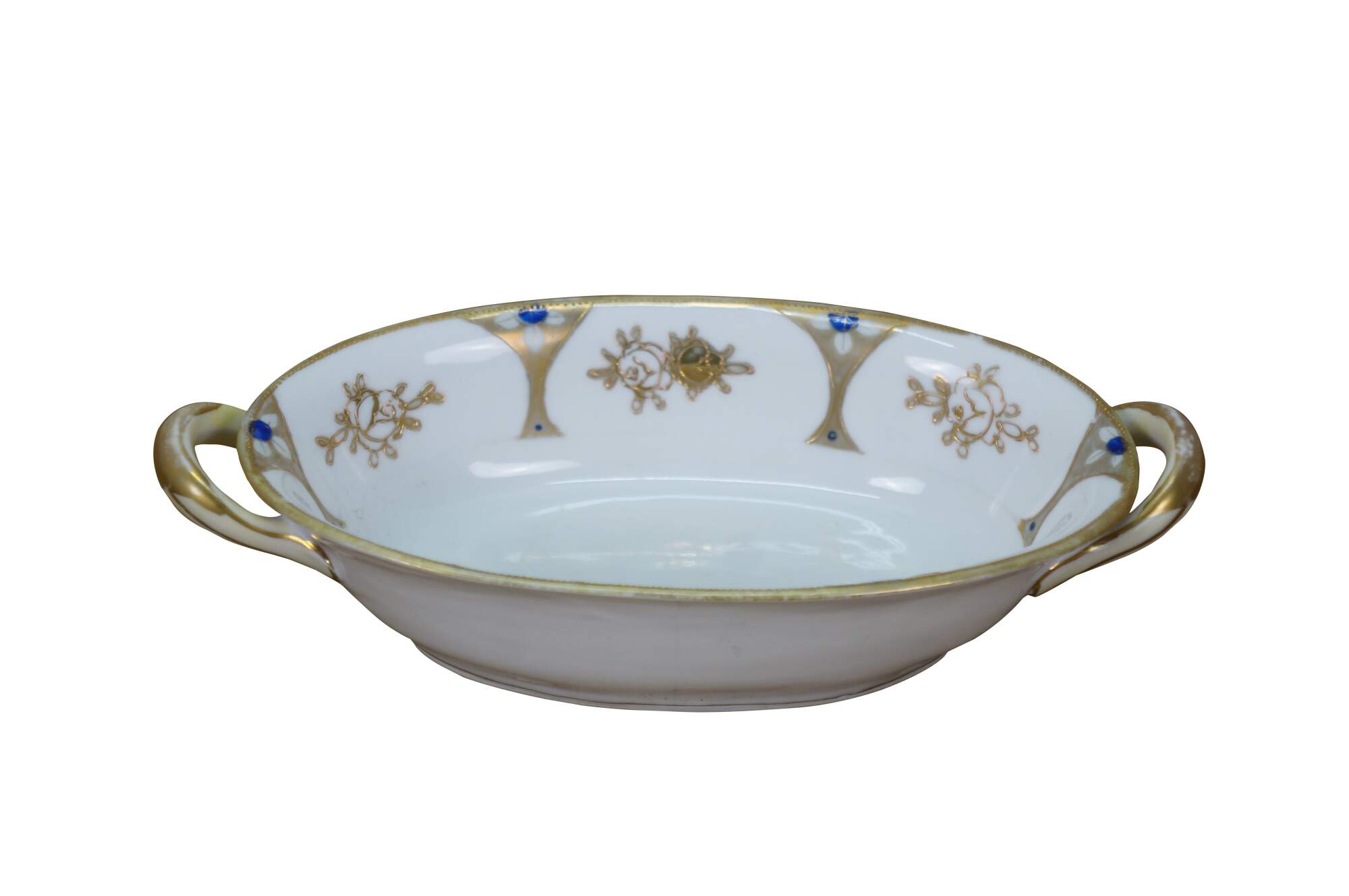 Early 20th century Noritake porcelain serving dish - over shape with two handles, decorated with a gold and cobalt blue design of martini shapes and moriage roses. Mark used circa 1911-1921.