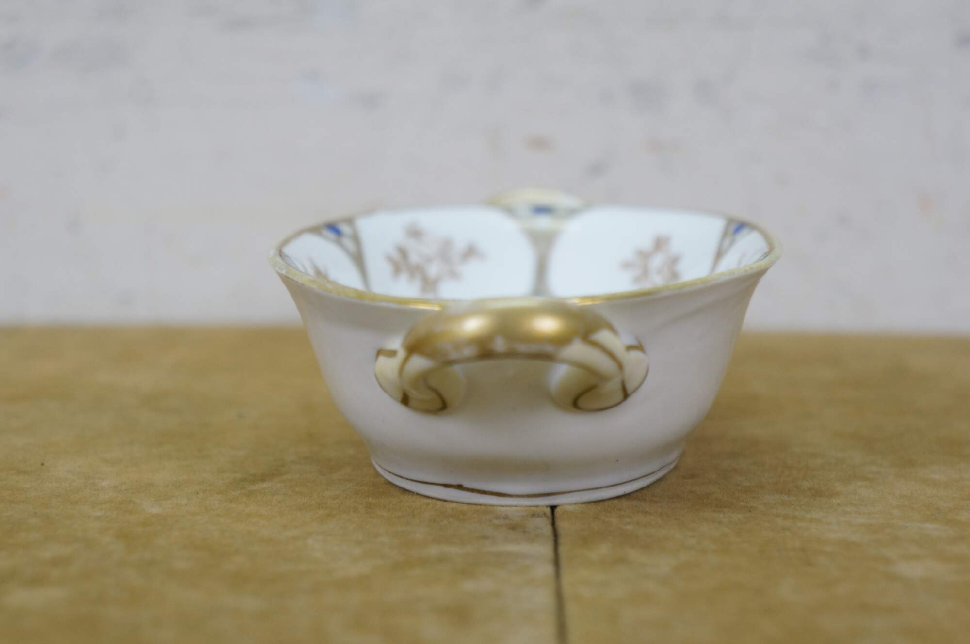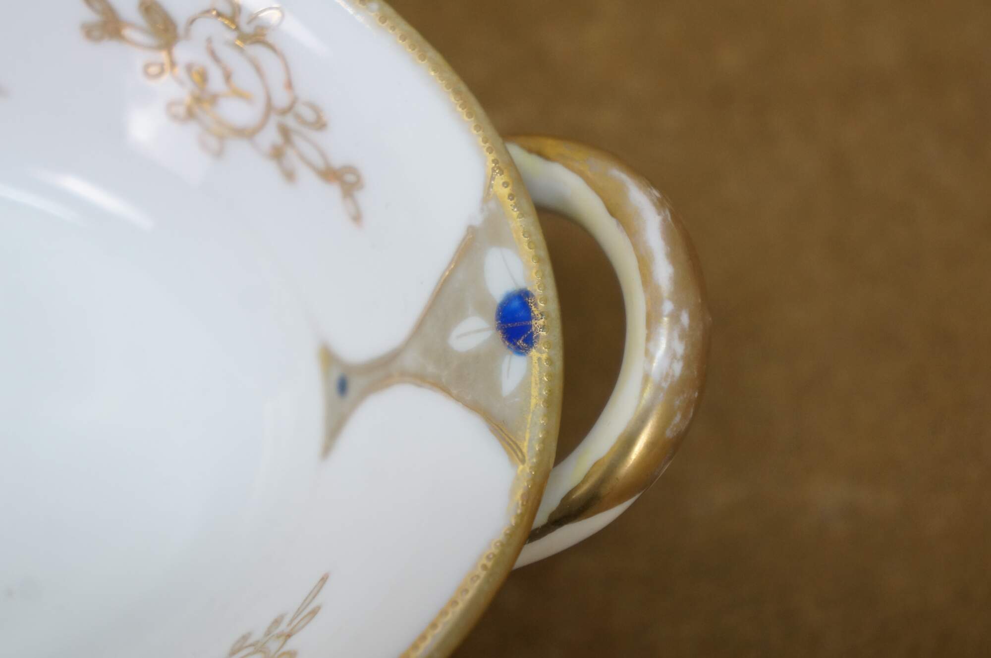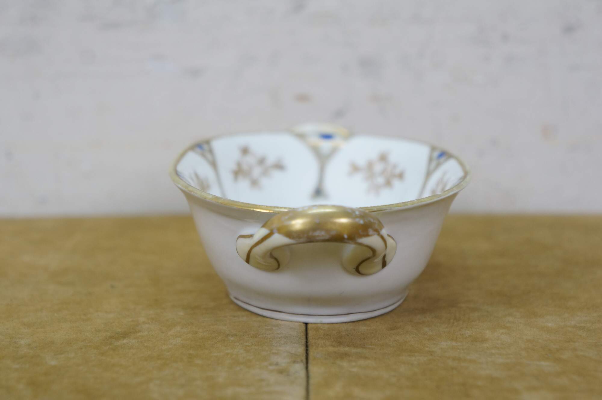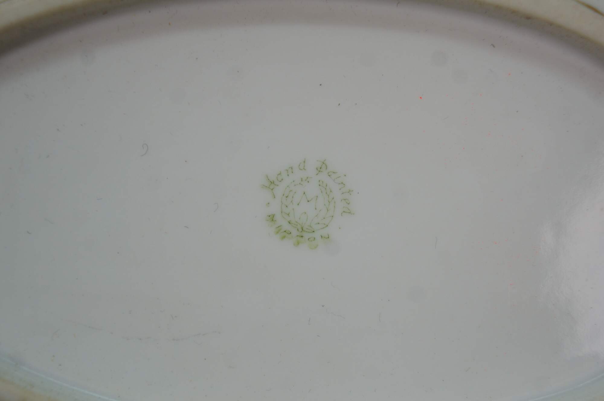 Early 20th century Noritake porcelain serving dish - over shape with two handles, decorated with a gold and cobalt blue design of martini shapes and moriage roses. Mark used circa 1911-1921.