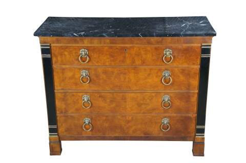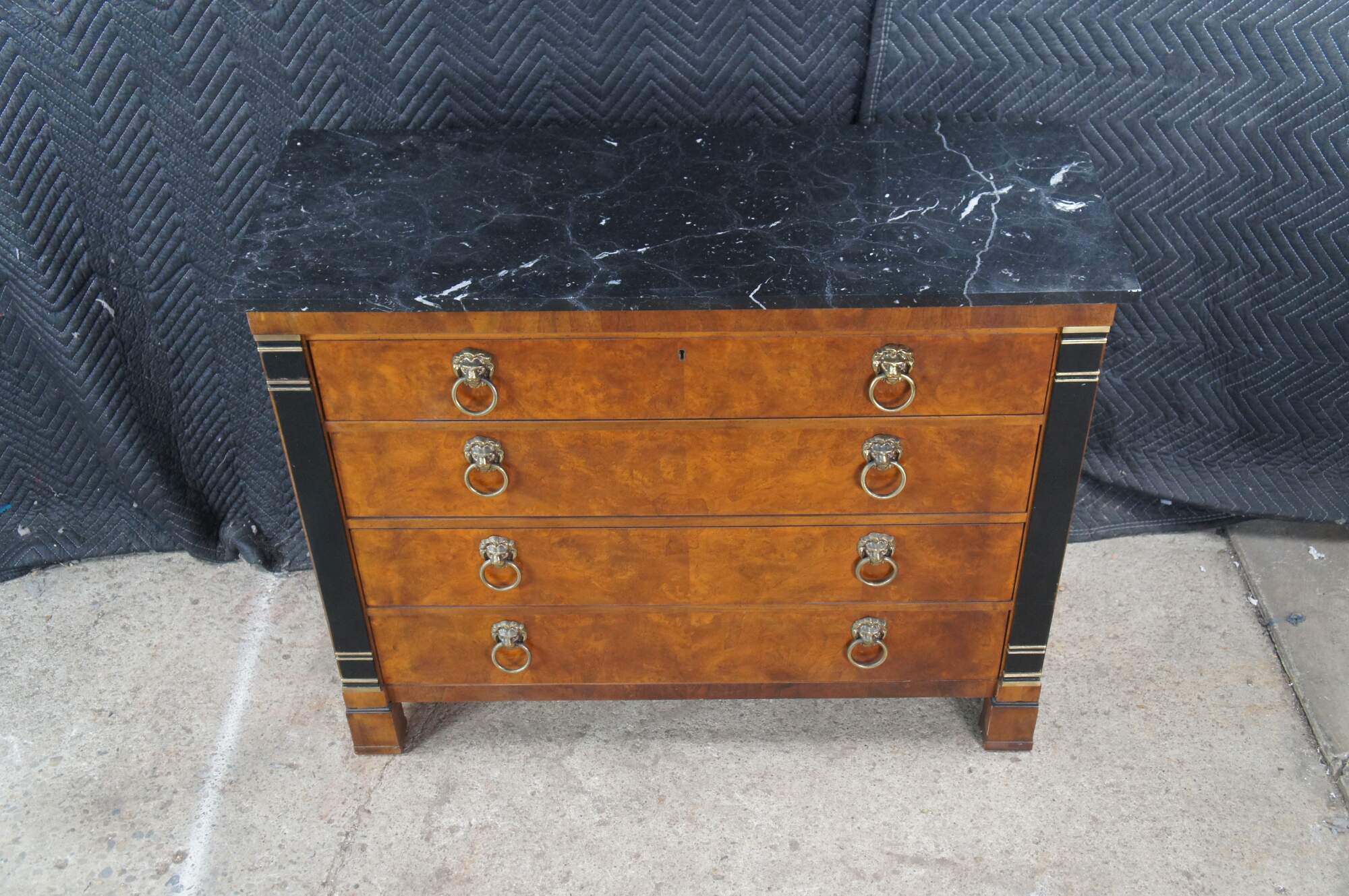 Vintage Drexel Heritage French Empire Style Commode, Console or Chest of Drawers. Features a rectangular form made from walnut with lacquered and gilt columns and a marble top. The chest has four dovetailed drawers with matchbook veneer burled front and brass lion knocker pulls. The uppermost drawer is lockable with key.